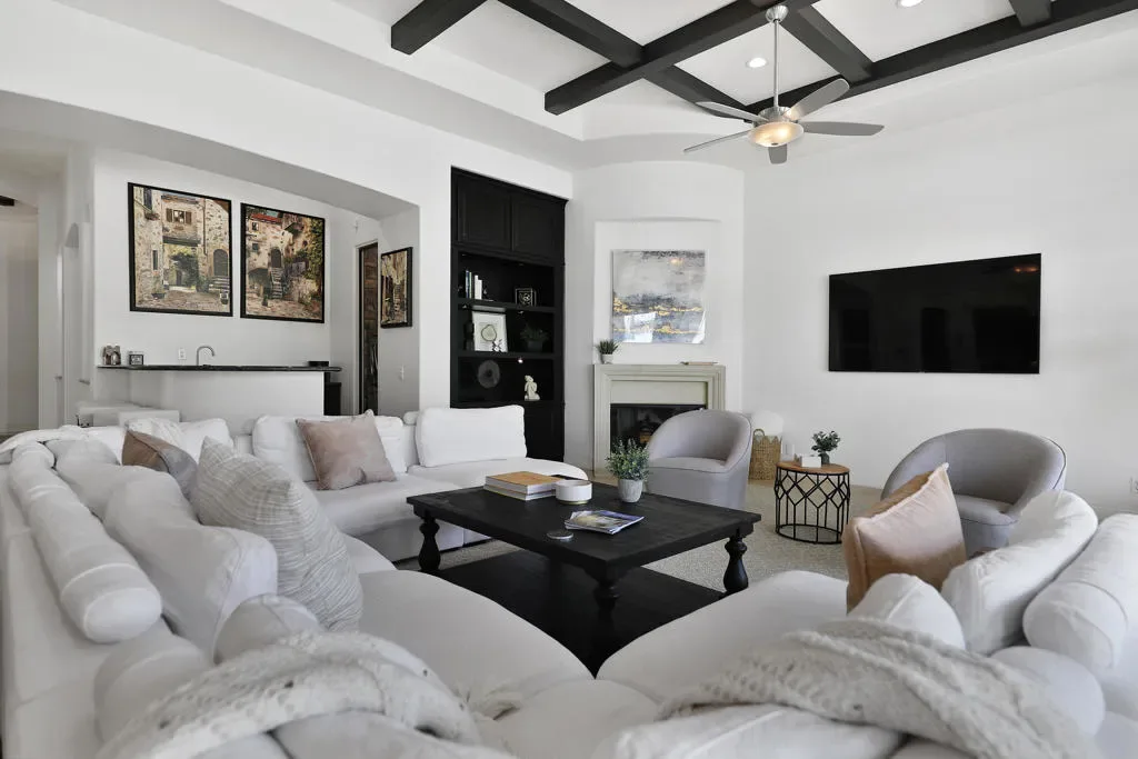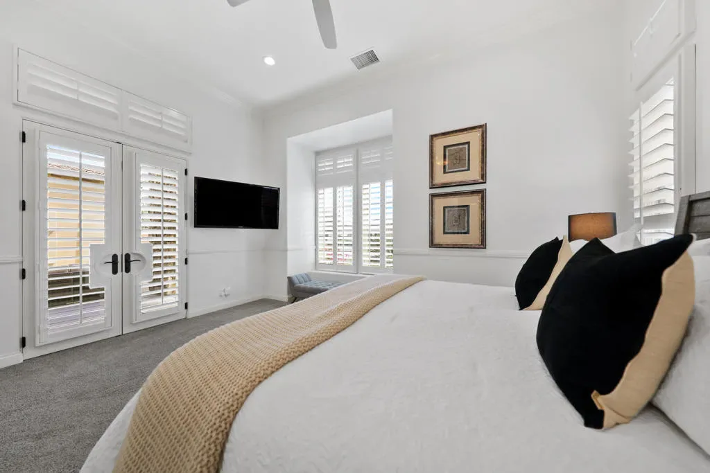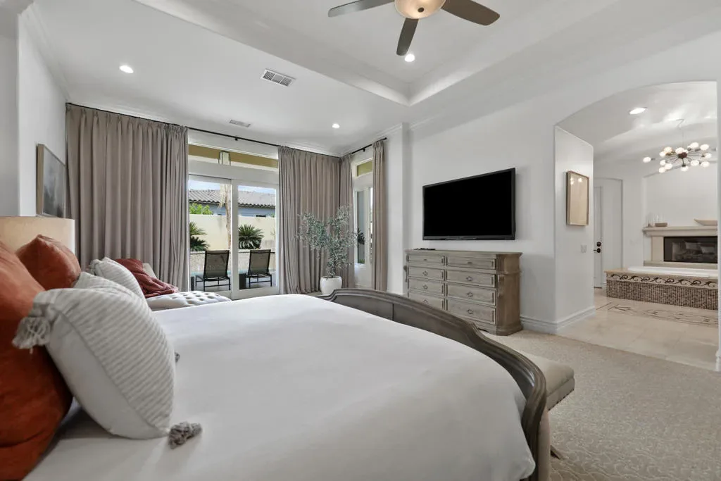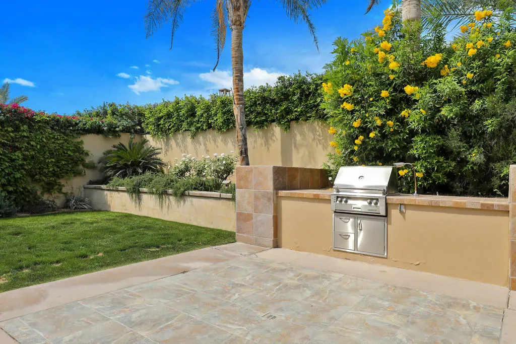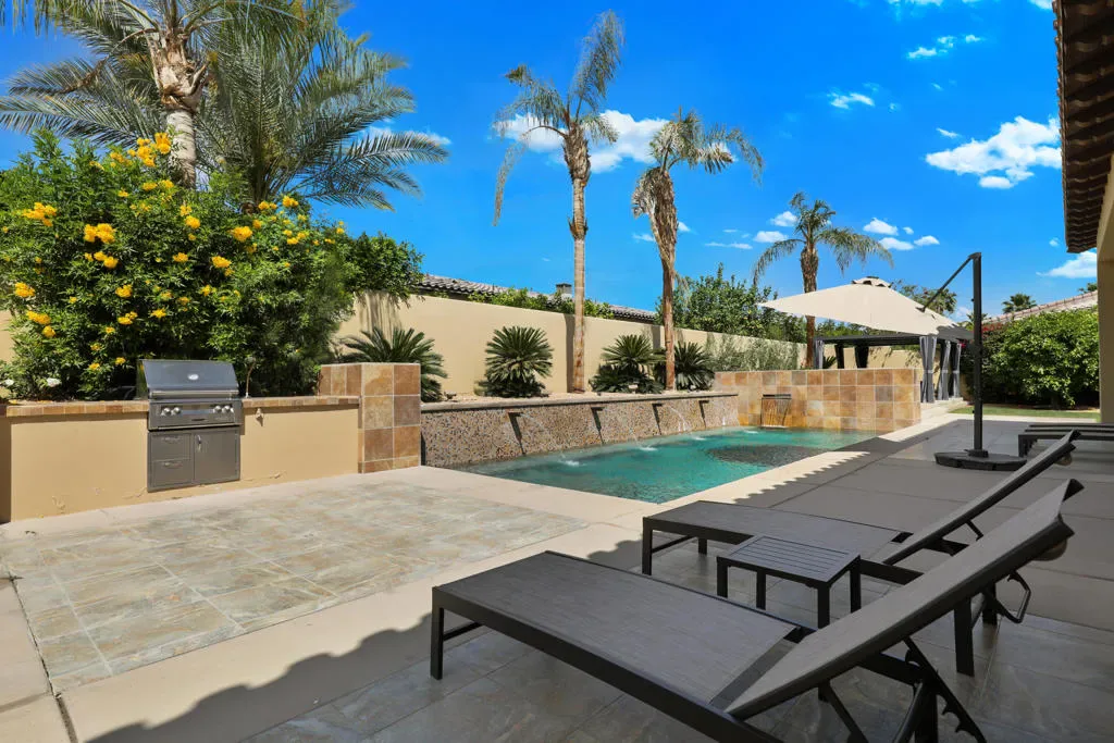 Rare opportunity to own this amazing former Griffin Ranch Model home, This Campania 2 nearly 4000 sf 3-bedroom 3 bath home w/den & wine room is a Griffin Ranch community favorite. You will find Model home features through-out and a location that is sought after with easy access to the main gate and steps away from the Clubhouse, The wine room area has custom doors, with faux rock adding to the Tuscan feel, The dining room has a full wainscotting wall with double French doors leading to a front patio sitting area with outdoor gas fireplace. Primary bedroom also includes full wall height wainscotting wall, black out curtains & custom built in cabinets. The guest bedrooms are so comfortable with designer touches your guests may never want to leave. The Cooks kitchen includes a double oven, oversize refrigerator, gas cook top & double drawer dishwasher that is open to the comfortable Great Room setting with beamed ceilings, built in sound system & wet bar. Flow from indoor to the amazing outdoor entertainment space with pool, hot tub. built in gas bbq & resort like Cabana. Clubhouse amenities include a well-equipped fitness center, separate Pilates room with 4 reformers, game room & great community parties. Jr Olympic Pool & spa, 8 pickleball courts, Tennis & Bocce courts, all of this included in one of the most competitively priced HOA’s in the Desert. For you golf enthusiasts you are home at last, with 6 of the finest Championship courses just a short golf cart ride away. PGA West (home to the Amex tournament) offers you an opportunity to join what is called ”Western Home of Golf” and all that PGA West has to offer. You’ll love this home, neighbors & amenities. This home is being offered furnished per Inventory. The property has strong rental history and perfect for your next investment opportunity and 1031 exchange.