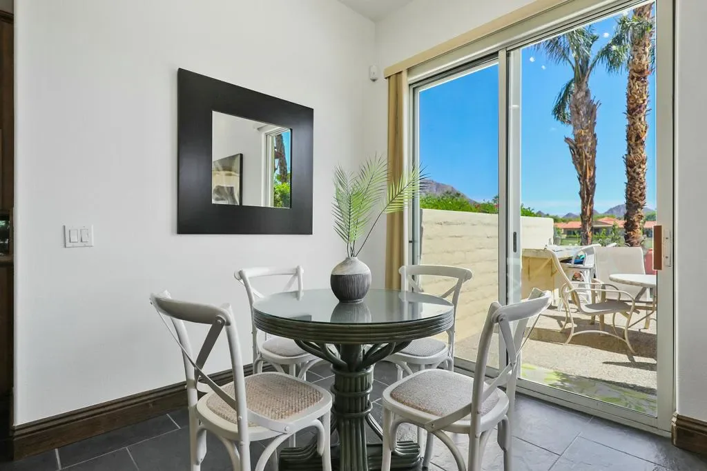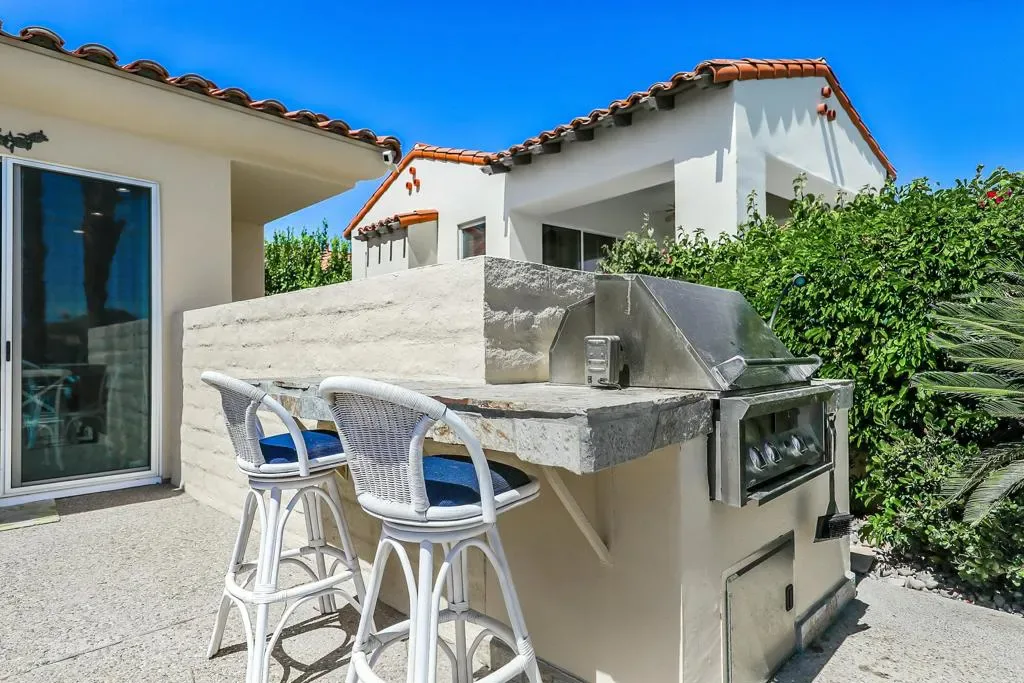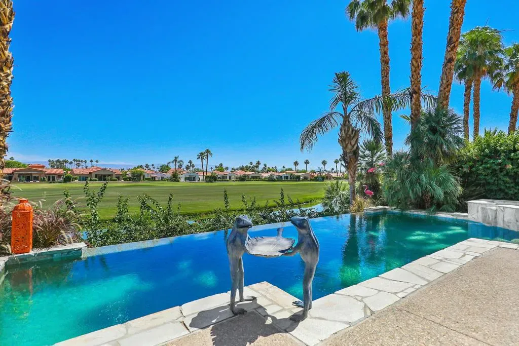 BOOKED JAN, FEB & MARCH. Gorgeous residence nestled alongside the lush fairways of the renowned Haciendas community, perched on the prestigious resort course, The Dunes. Offering the quintessential blend of luxury and convenience, this gated enclave is just moments from the charm of Old Town La Quinta, with the clubhouse and hotel of the La Quinta Resort mere steps away, as well as the esteemed La Quinta Country Club across the street–a prime locale indeed. This beautiful home boasts two bedrooms within the main house, complemented by a two-room casita complete with a convenient kitchenette. Granite adorns the kitchen and baths, while stainless steel appliances grace the well-appointed kitchen. The great room boasts a captivating sit-down bar, affording panoramic views of the golf course and tranquil lake beyond .However, it’s the outdoor oasis that truly captivates, where an elevated infinity pool seemingly cascades into the serene waters of the adjacent lake–a sight to behold. Completing this alfresco haven is a built-in BBQ area, perfect for entertaining amidst the picturesque backdrop of the golf course. This residence epitomizes resort-style living at its finest, offering a sublime blend of luxury, comfort, and unparalleled surroundings.