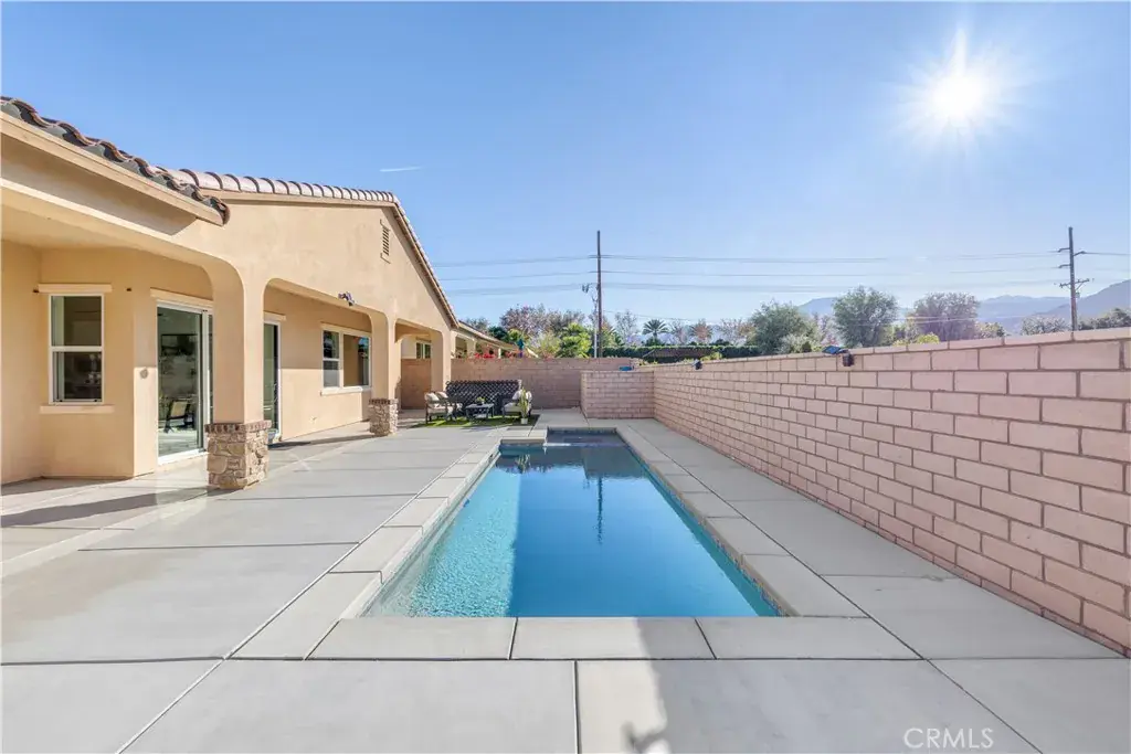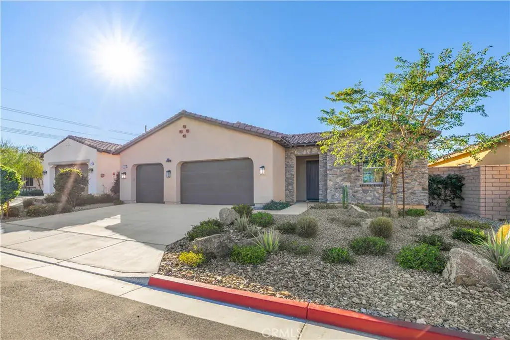 This 2023 new-construction home mirrors that lifestyle with 3 bedrooms and 2.5 bathrooms across approximately 3,022 sq ft on an 8,712 sq ft lot. The open floor plan features tile flooring throughout, a spacious kitchen with an oversized island and large pantry, and seamless flow ideal for entertaining and everyday living. Outdoors, a private pool and spa create a personal retreat, while a 3-car attached garage and paid-off solar panels add convenience and long-term value. Set within a well-maintained community with an HOA of $183.75, this home offers modern design, energy efficiency, and effortless desert living.