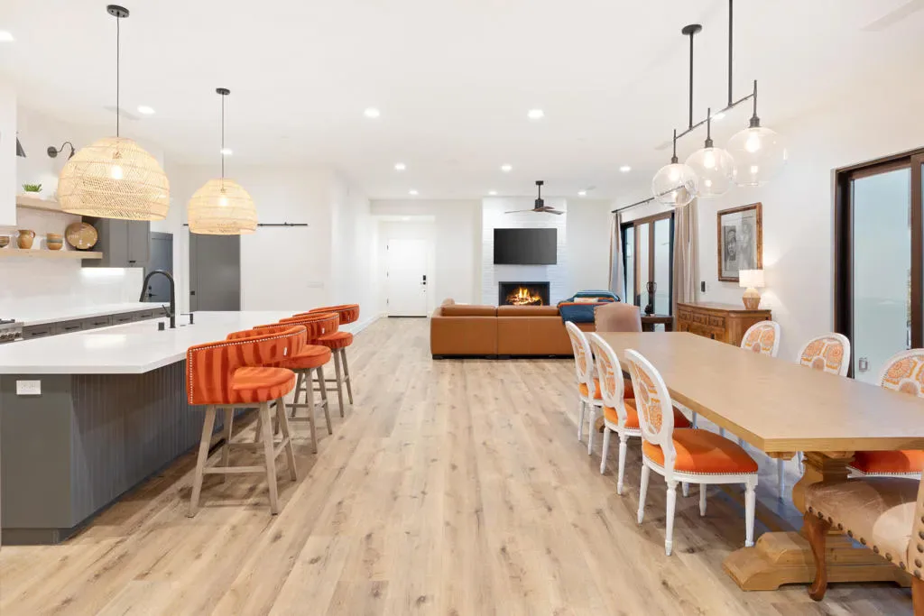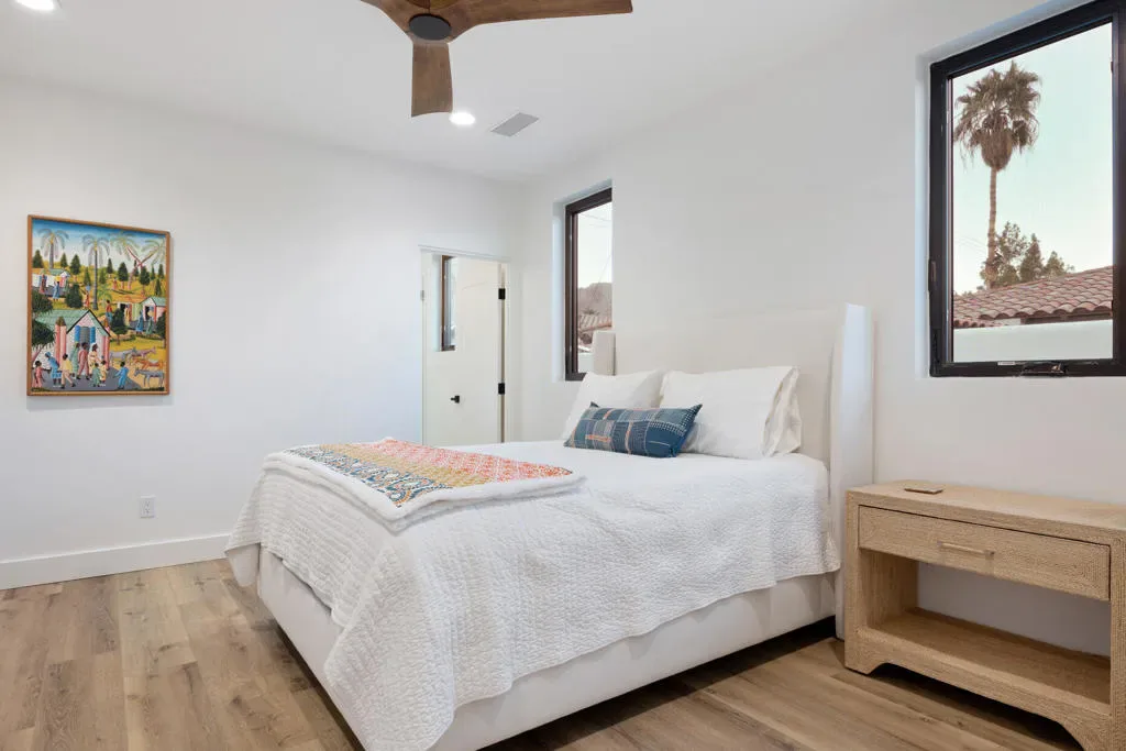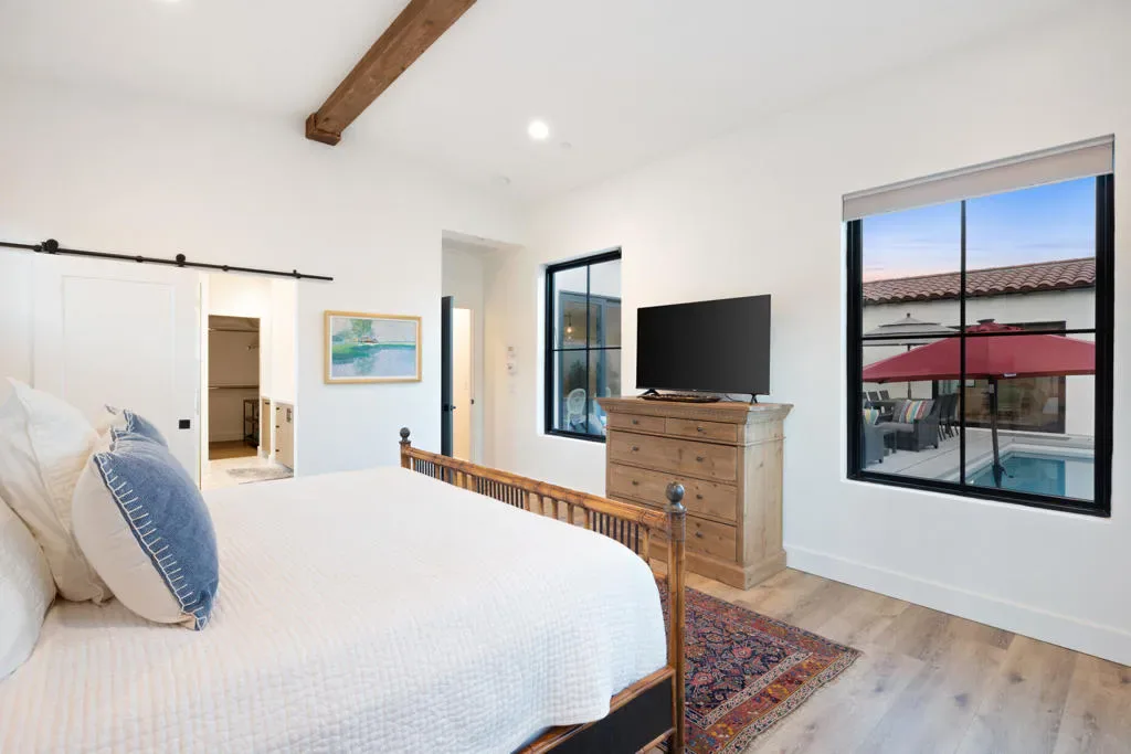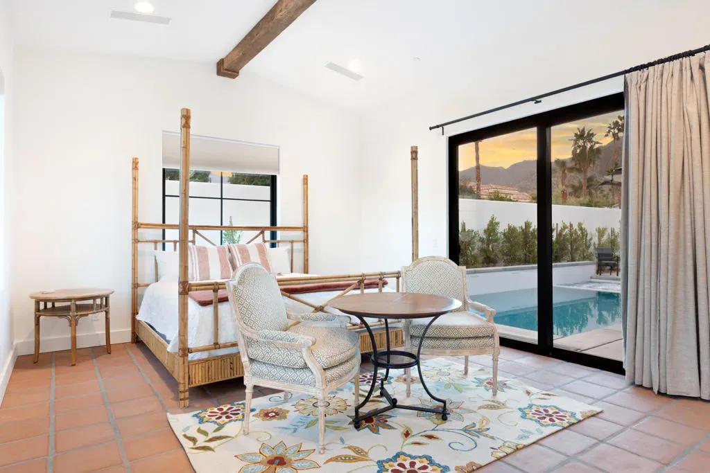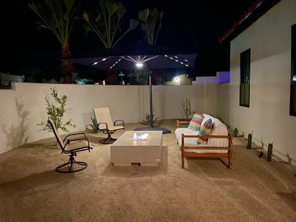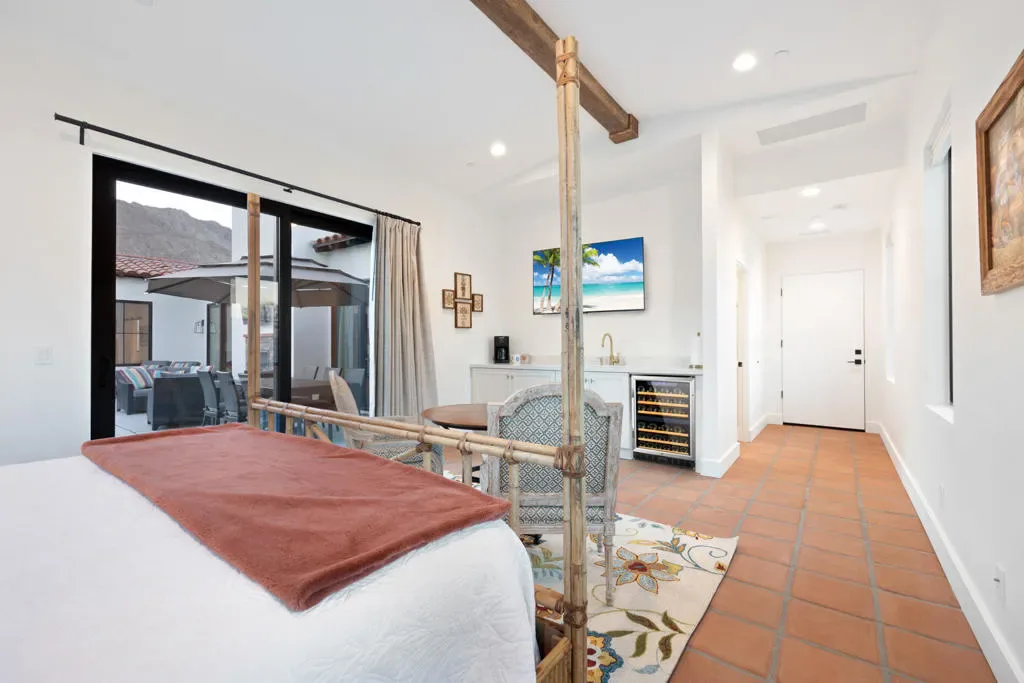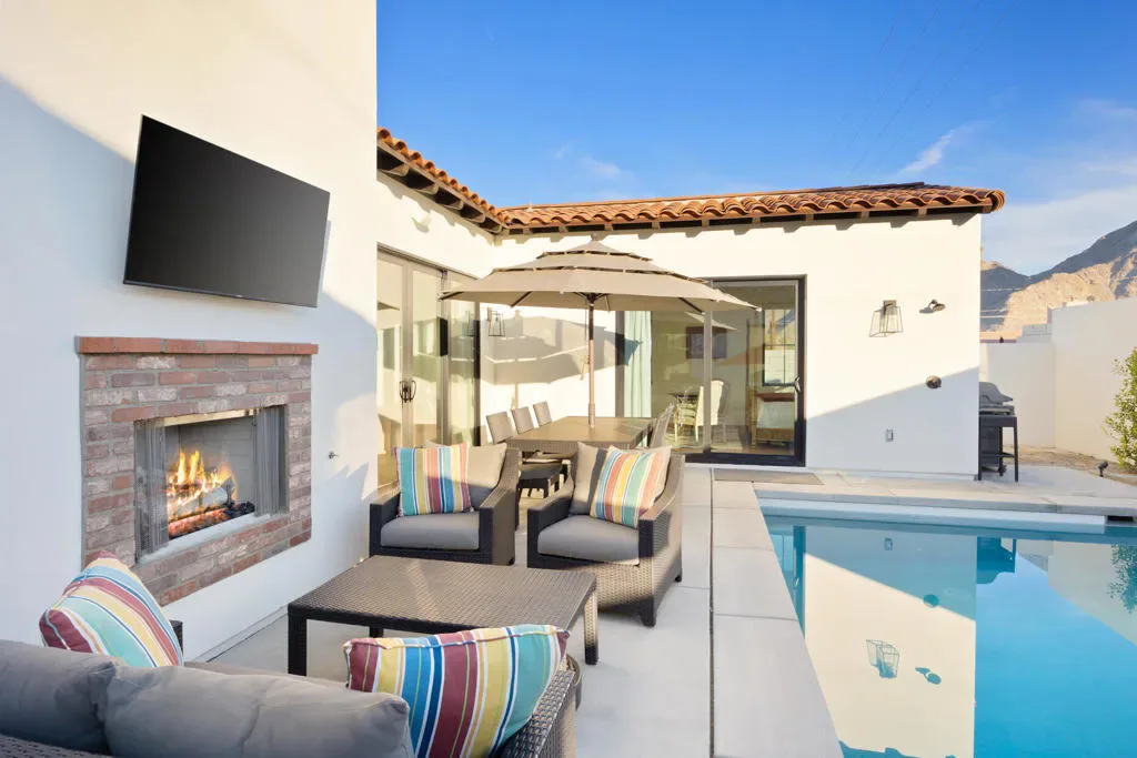 Make your desert stay memorable in this exquisite newer modern hacienda construction on a corner lot high in the Cove. Completed in Oct 2022, this 2798 SqFt home offers 4 bedrooms, 4 1/2 baths, an open concept great room and gourmet kitchen, a laundry room with storage, and a powder room/mud room. The outdoor living space is perfect for entertaining with an outdoor shower, gas BBQ, outdoor fireplace with TV, and a salt water pebble tec pool and spa with LED mood lighting. Two of the bedrooms have king-size beds and one has a queen bed. All bedrooms are en suite, and the primary bathroom features a relaxing soaking tub. The Great Room, designer kitchen and dining room all have high ceilings, surround sound and a large dining table that can seat up to 10 people. The attached Casita, which opens up to the pool, has its own entrance and features 450 SqFt of living space with a king-size bed, a sitting area, a kitchenette with beverage fridge, sink, and coffee maker. On Demand water heater, filtration water system on all faucets, surround sound, Eero Mesh Wi-fi, Ring camera, automatic security lighting, landscape lighting, and a privacy wall around the entire perimeter of the property are some of the outstanding features this home offers.Note: The private entry courtyard with seating was completed after the pictures were taken.Bi-weekly house cleaning, pool cleaning and landscaping included.