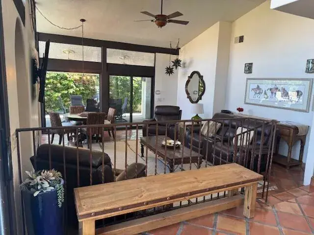 This fully furnished Spanish-style retreat boasts breathtaking mountain views and abundant natural light. The open floor plan features high vaulted ceilings, a step-down living room, and beautiful artisanal tile work throughout. The gourmet kitchen is fully stocked with appliances and includes a bar with seating for four. The master bedroom offers direct access to the rear patio, while the master bath exudes rustic Spanish charm with an oversized shower and dual sinks. Step outside to a private oasis with a pebble tech pool and spa, perfect for relaxation. The backyard includes a dining area with a built-in fire pit and a second smaller fire pit for cozy evenings under the stars, all while enjoying the stunning mountain backdrop. Located near Old Town La Quinta, this home is just minutes from delicious restaurants and quaint shops, offering the perfect balance of comfort and convenience. Experience desert living at its finest in this beautiful home!