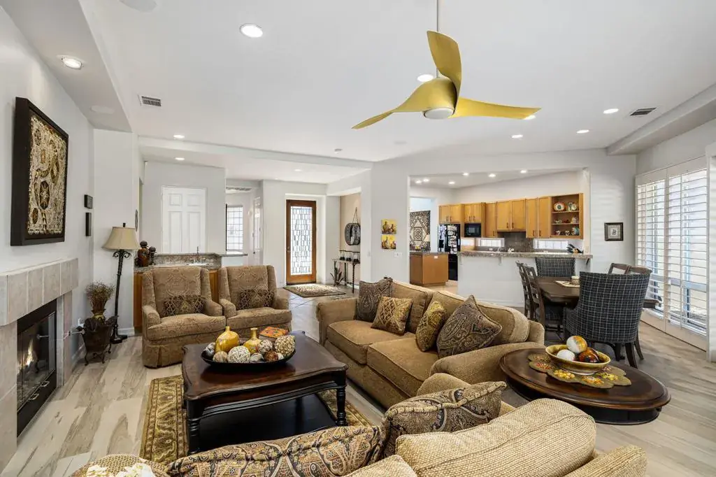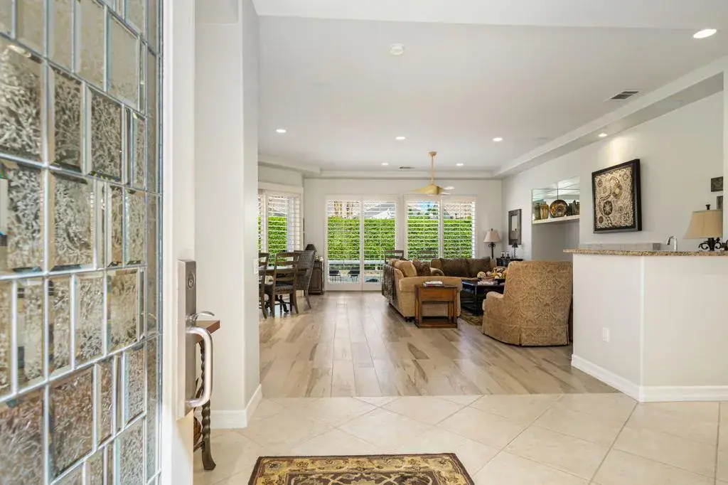 This popular floorplan has a spacious courtyard entry offering stunning south-facing mountain views, creating a warm and inviting first impression. A glass front door welcomes natural light into the foyer and expansive great room beyond. In addition to the great room feeling, there is a separate family nook off the kitchen with doors to the courtyard. Featuring light wood-look porcelain tile flooring, seamlessly blended with diagonal tiles throughout. Painted wood shutters adorn most windows and doors, adding charm and character. Each generously sized bedroom includes an en-suite bath, ensuring comfort and privacy for all. The third bedroom has french doors to the courtyard and can serve as an attached casita. The luxurious primary suite boasts direct access to the backyard, where a pool and spa provide a private retreat. Drift off to sleep with the soothing sound of the spa waterfall just outside your window. The garage is temperature controlled with a mini-split and the garage floor is custom installed rubber tiles in shades of gray. Lucky cars! Meticulously maintained, this home is a true gem in La Quinta Fairways, a guard gated community located conveniently in the middle of La Quinta, close to restaurants, groceries and shops. La Quinta Fairways is one of four key associations affiliated with PGA West. OPEN HOUSE: Saturday 11-2
