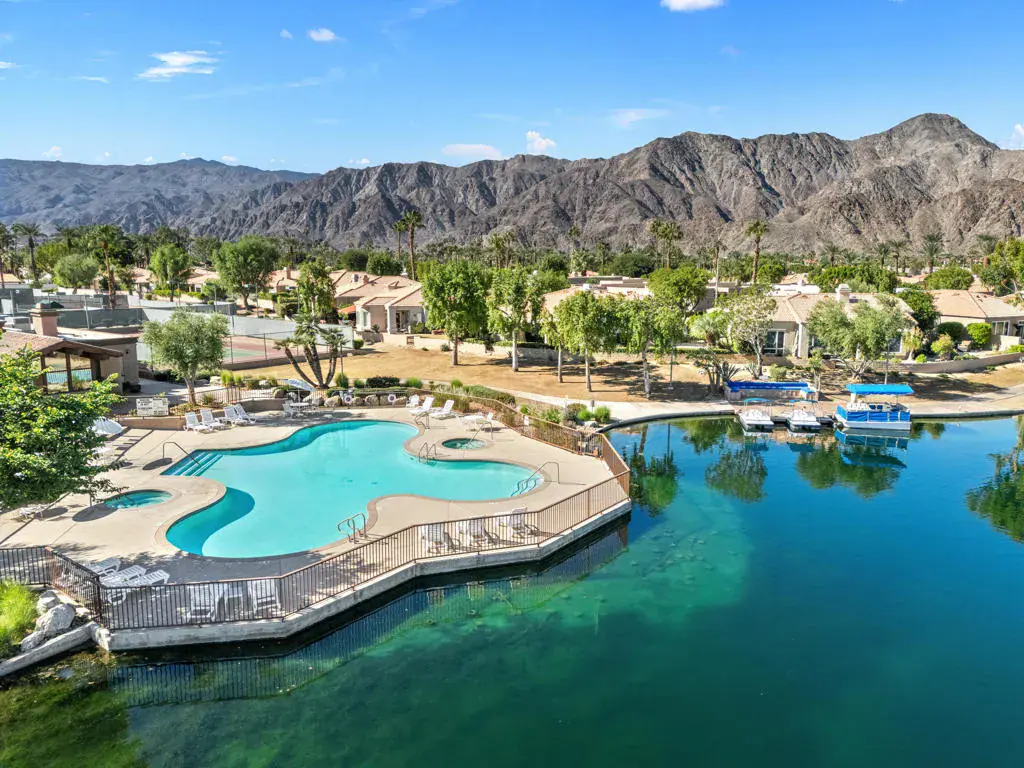 Picture perfect with a stunning quiet interior location. This two bedroom, two bath elevated end unit offers a rare and intimate private oversized landscaped patio with mountain views and walking distance to the pool with direct access and views to luscious greenbelts and pools. Laguna De La Paz features a 7 acre lake with community clubhouse, exercise room, Tennis courts, 15 pools, spas, Pickleball courts, walking paths, and 24 hour gated security. Light and bright living room, dining and a eat in kitchen. Attached 2 car garage with additional guest 2 car parking on your own driveway. Enjoy moving in with nothing to do, or upgrade to your own desires. Close to shopping, dining and entertainment. Enjoy life! Right here and Right now!