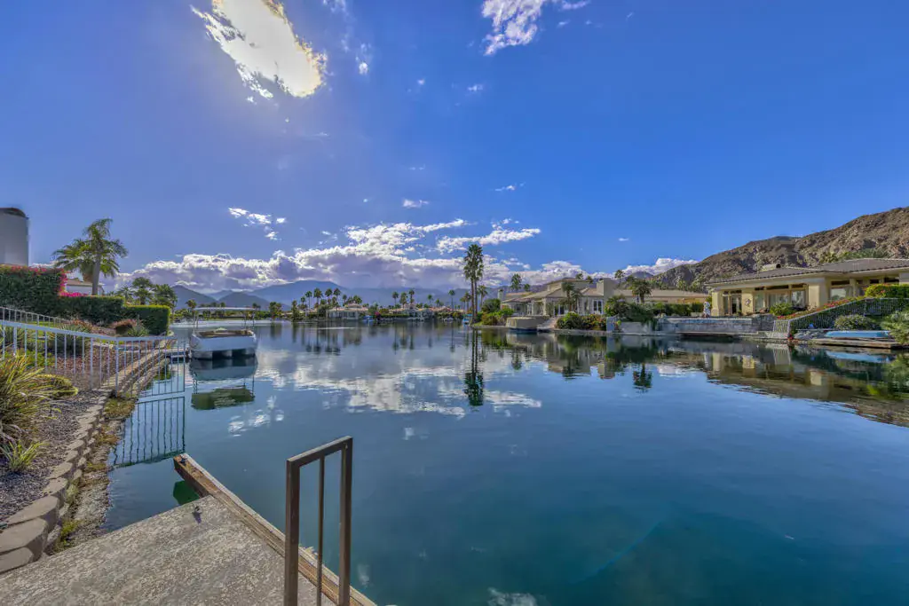 PRICE ADJUSTMENT –Located on the scenic shores of Lake La Quinta, this property represents a unique opportunity within an esteemed community. Upon entering the secure, 24-hour guard-gated enclave, residents will appreciate the tranquil atmosphere and sense of peace on earth. The setting features a 25-acre man-made lake, diverse wildlife, panoramic mountain views of the Santa Rosa range, and access to amenities including community tennis and pickleball courts, a heated community pool, bocce ball, and two electric boats for resident use.This meticulously maintained residence encompasses 3,188 square feet of living space, offering three bedrooms, three and a half bathrooms, and a three-car garage–one bay has been converted into a generously sized enclosed storage area or office. Expansive views are enjoyed from the main living area and primary suite. The home also features an impressive bar area, breakfast nook, and a well-appointed kitchen, providing exceptional spaces for entertaining. The third bedroom is currently configured as an office. Additional features include a private front courtyard, mature landscaping including an impressive grapefruit tree and southwest-facing backyard with a beautiful saltwater pool and spa, extensive covered patio space, and your own boat dock! Too many amenities to list, come see this beautiful home & community before its gone!