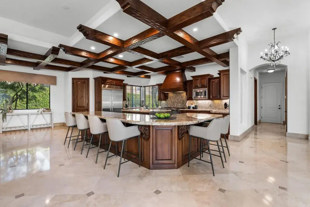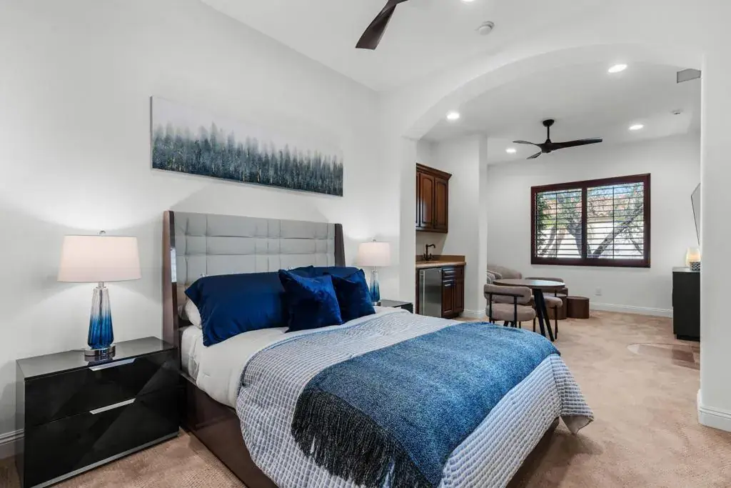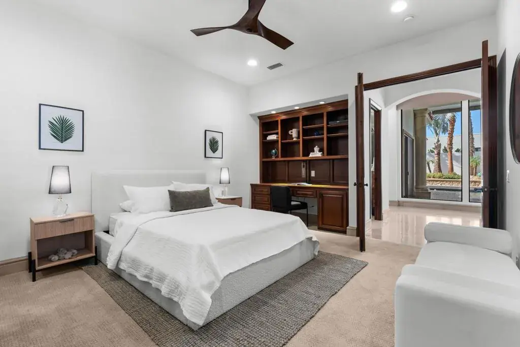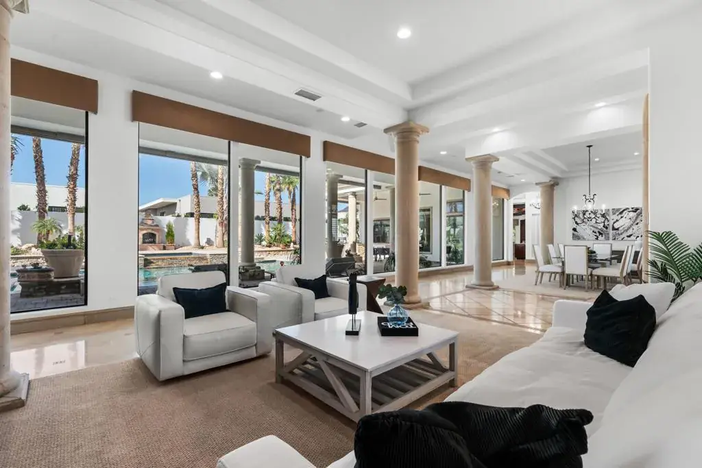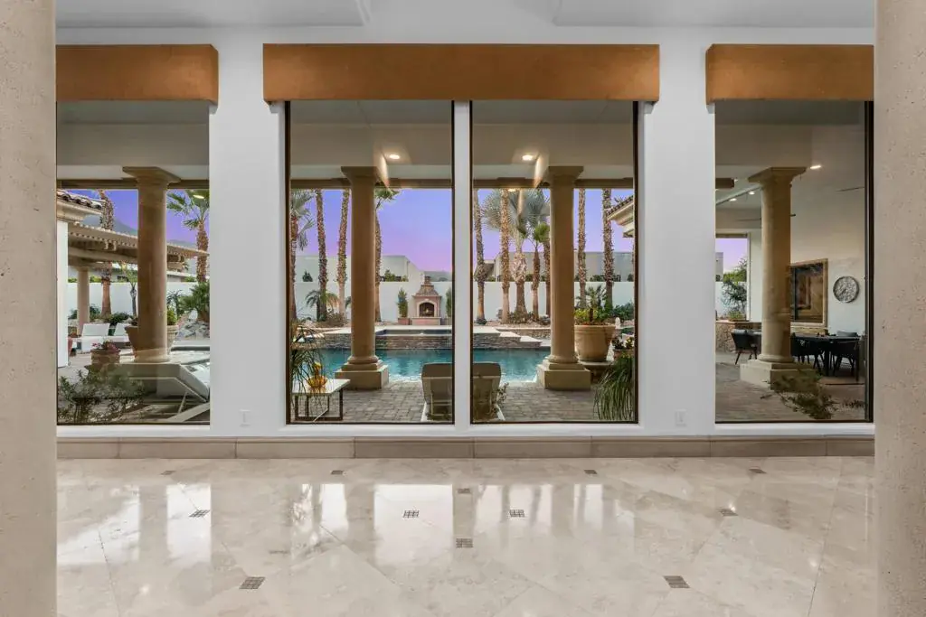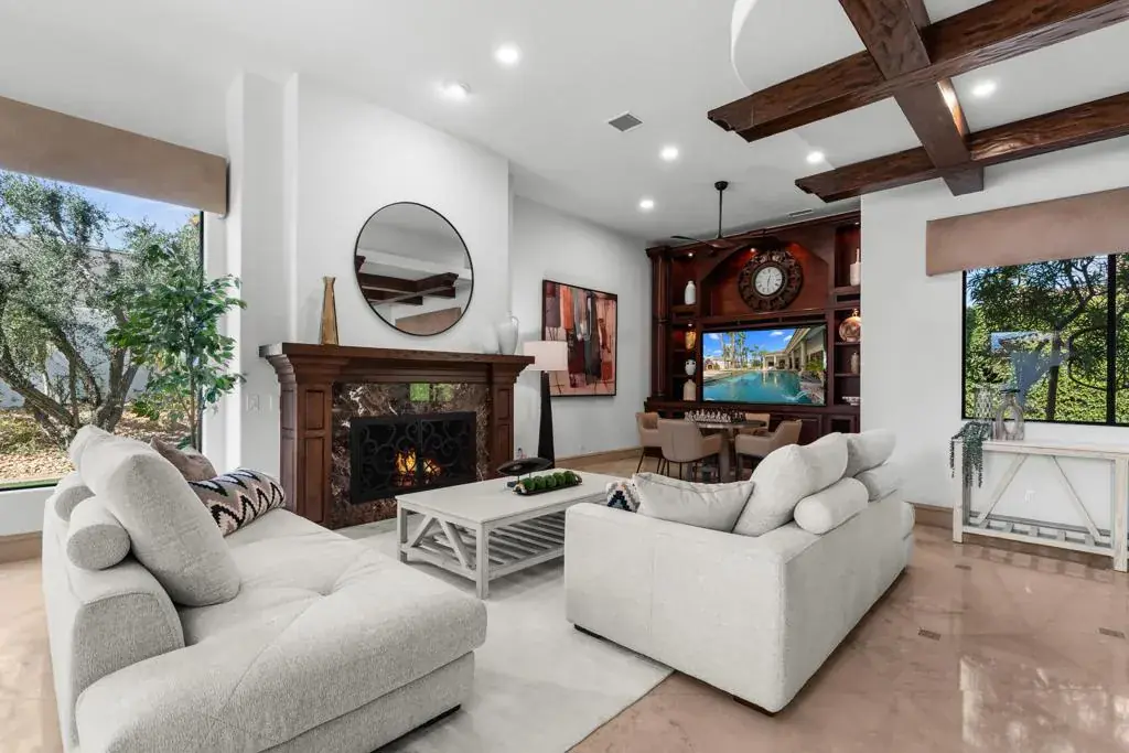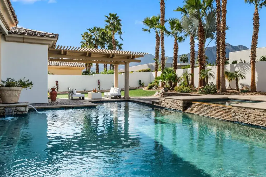Seller financing available on agreeable terms! Newly refreshed, this contemporary mediterranean residence is gracefully situated on over half an acre within the exclusive gated custom home enclave of Lions Gate Estates in La Quinta. A recent outdoor transformation introduces a soft white exterior palette, desert contemporary landscaping, and artful exterior lighting, elevating the home’s architectural presence while framing panoramic mountain views and creating a resort caliber setting from sun-filled afternoons to evenings under the stars. Interiors reflect scale and refinement, with custom built-ins throughout, a formal living and dining room, and an inviting great room featuring a fireplace and wet bar, perfect for hosting with ease. A temperature controlled wine cellar and chef’s kitchen with granite slab countertops, premium appliances, and generous gathering space further underscore the home’s entertaining appeal. Designed to balance architectural elegance with everyday livability, the home unfolds across four-bedroom suites and four-and-a-half baths, including a private detached casita ideal for guests. The primary suite is a private sanctuary, complete with its own fireplace, dual walk-in closets, a soaking tub, and an adjoining exercise room. At the heart of the property, a Pebble Tec saltwater pool and spa, enhanced by an outdoor misting system, anchor the grounds and sets the tone for relaxed desert living. Covered patios, an outdoor fireplace, built-in BBQ, automated awnings, and thoughtfully curated lighting complete the elevated outdoor atmosphere. Additional amenities include a sauna and an air-conditioned three-car garage. Offered furnished per inventory. This estate presents a rare opportunity to experience desert living at its finest.