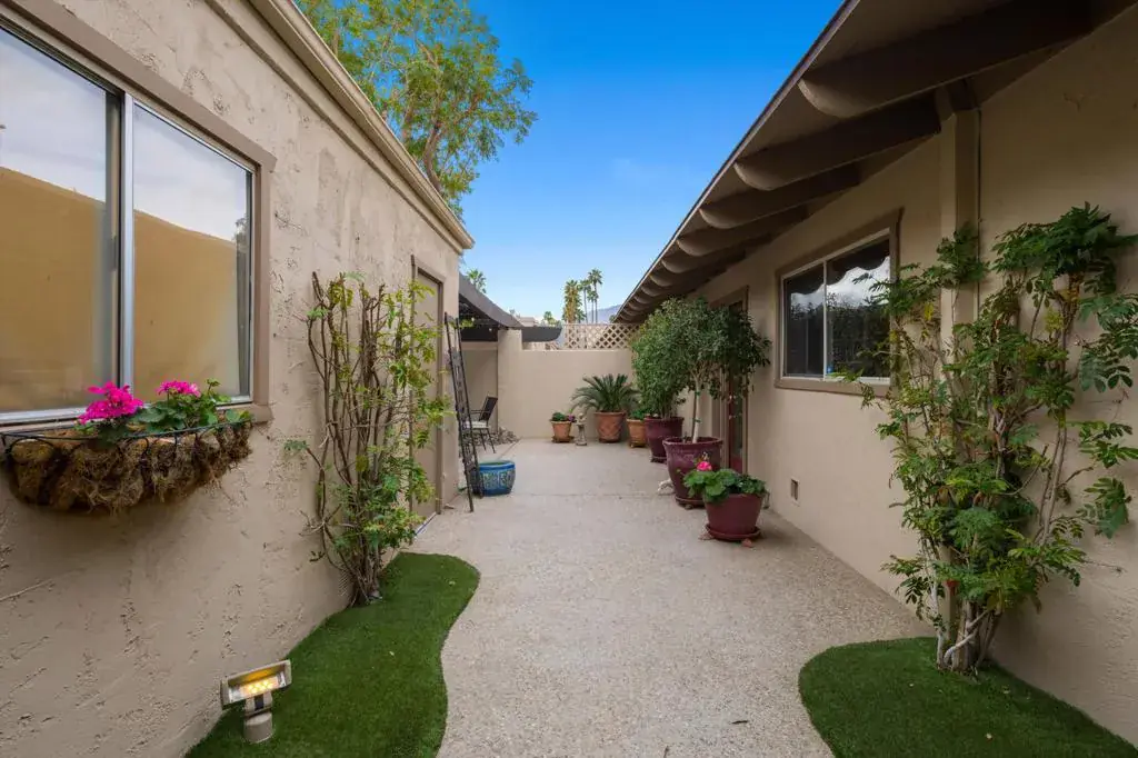 Hidden Gem at La Quinta Country Club!!This is a DREAM location–tucked just off the fairway with MULTIPLE fairway views and stunning, ever-changing mountain backdrops that never get old. You won’t find such phenomenal scenery with this price tag anywhere else!!!!A private, enclosed front courtyard welcomes you into a beautifully maintained and inviting 3-bedroom, 2-bath residence (with one bedroom thoughtfully converted into a den), featuring vaulted ceilings and a layout that feels open, airy, and effortlessly livable.The main living areas showcase gorgeous bamboo flooring, while the bedrooms are comfortably finished with plush carpet. The kitchen features rich honey-toned cabinetry, sparkling stainless steel appliances, and a gas range – and opens seamlessly to the dining and spacious living area–ideal for both entertaining and everyday living.Large windows and sliders, all upgraded to dual-pane energy-efficient glass, flood the home with natural light while perfectly framing serene fairway views. The primary suite offers a peaceful retreat with a tastefully remodeled primary bath, while the guest bath has also been thoughtfully updated, adding to the home’s overall appeal.Just minutes from Old Town La Quinta’s renowned shops, dining, and events, this home offers the perfect blend of golf-course ambiance, mountain views, and comfortable desert living. COME SEE!!