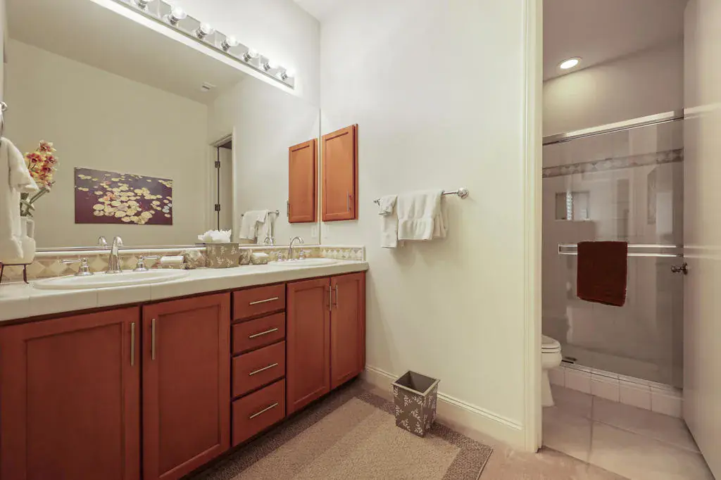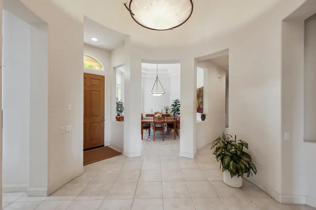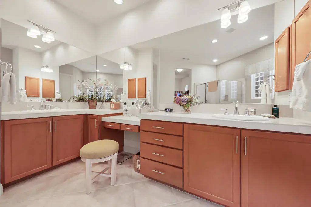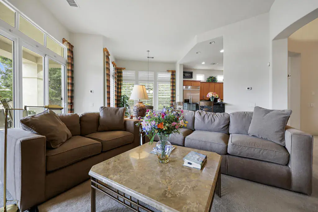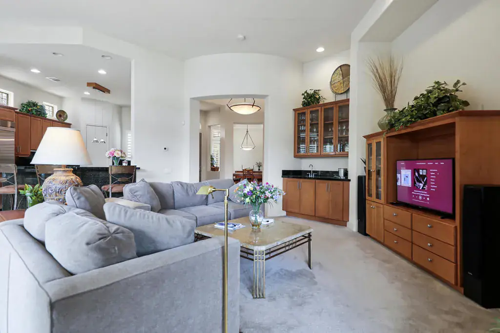 Enjoy this serene setting on a large corner lot. This comfortable Belize model offers 3 spacious bedrooms including an attached casita. The separate entry in courtyard gives your guests total privacy to come & go easily. The dramatic rotunda foyer with soaring ceiling leads to an open living area with cozy fireplace, dining area and breakfast bar. The gourmet kitchen overlooks the living areas for ease in entertaining and everyday living, while taking in the view of the relaxing pool & spa nestled in nature. The formal dining room is located conveniently to the kitchen and depending on your lifestyle it could also be a media room or library. The spacious primary suite and luxury bath with dual vanities has oversized closet space and dressing area. The second oversized guest ensuite is situated opposite end of hall from the primary suite, giving guests quiet and privacy. The spacious Casita with it’s courtyard entry, plenty of windows for a light & bright relaxing place for guests to enjoy their stay in the Desert in comfort. The large bathroom with dual vanities and oversized closet space to accommodate clothing and storage space. Looking for curb appeal? This corner lot that sets next to the greenbelt area which compliments the deep front lawn on the over 11,000 sq. ft. lot and the front is maintained by the HOA gardeners.