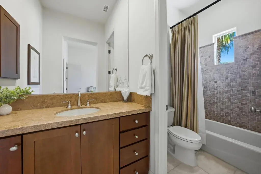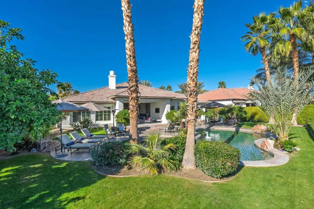 Welcome to an elegant desert sanctuary offering refined living, exceptional privacy, and breathtaking views. This beautifully reimagined 3-bedroom, 4-bath residence includes a bonus room ideal as a den or executive office, thoughtfully designed for both sophistication and comfort.The remodeled living space showcases clean lines and elevated finishes, creating a seamless blend of style and functionality. At the heart of the home, the chef’s kitchen has been expertly renovated with Wolf appliances, custom details, and an open-concept design that flows effortlessly into the main living areas–perfect for elevated entertaining.Retreat to the spa-inspired bathroom, where luxurious finishes create a calming, resort-like experience. Positioned on an expansive 13,000 sq ft lot, the property captures stunning mountain and lake views overlooking the 13th hole, offering a dramatic yet serene backdrop to daily living.Truly indoor/outdoor living – just open the expansive door and enjoy the amazing views. The outdoor living is exceptional. The expanded covered patio serves as a sophisticated entertaining space and transforms into an unforgettable outdoor movie-night retreat. The expansive backyard is ideal for hosting gatherings, while the private front courtyard provides an intimate setting for quiet evenings and morning coffee.Additional highlights include a separate golf cart garage and Tesla charger, enhancing both convenience and lifestyle appeal – plus 3 Air Conditioners and washer/dryer replaced in 2025. Peaceful, private, and impeccably appointed, this home embodies luxury desert living at its finest–perfect for refined entertaining and relaxed enjoyment with family and friends.