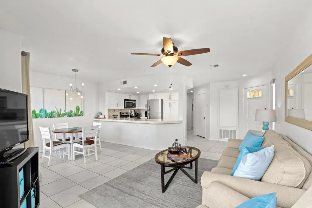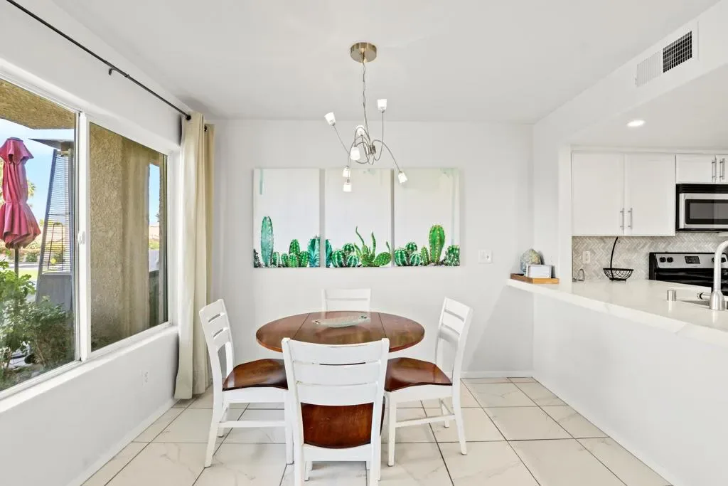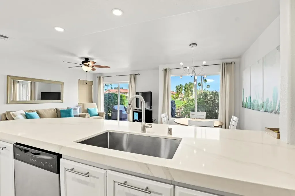 This single-level end-unit residence sits in a standout location within the gated Palm Royale community, offering sweeping lake, fairway, and mountain views while being tucked away from traffic and noise. The great-room floor plan creates an open, inviting layout, complemented by upgraded kitchen appliances, porcelain tile flooring throughout, skylights in the baths, and warm, neutral decor. Offered furnished and complete with a detached 1-car garage, the home is ready for immediate enjoyment.Palm Royale delivers an impressive lineup of amenities designed for an active desert lifestyle. Residents enjoy golf on the Ted Robinson-designed par-3 course, pickleball, tennis, six community pools and spas, a fitness center, and a clubhouse. HOA fees include unlimited golf, high-speed internet, cable TV, sewer, trash, and grounds maintenance–making daily living remarkably convenient. The community also serves as the desert headquarters for Helix Disc Golf, adding even more recreational variety.The location places you directly across from the Indian Wells Tennis Garden, home of the BNP Paribas Open, and within easy reach of shopping, dining, transportation, Acrisure Arena, and major seasonal events such as the Coachella and Stagecoach festivals. The property also offers long-term rental potential and income-producing possibilities (buyer to verify all rental guidelines with the City of La Quinta and the HOA). Whether used seasonally or as a long-term option, this condominium checks all the boxes and is a must-see for those seeking a well-situated desert retreat.