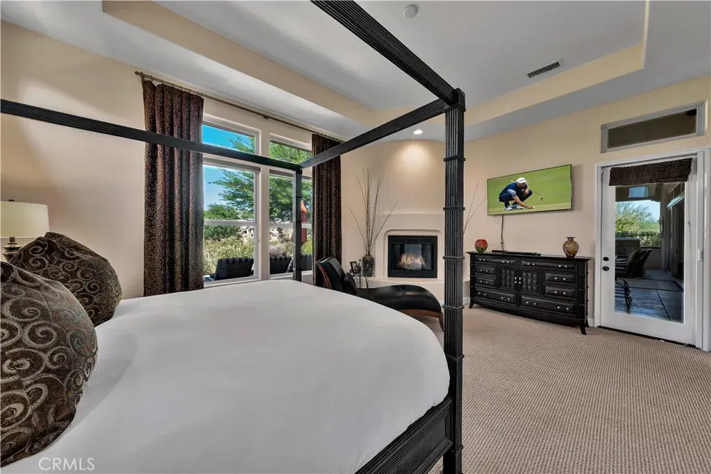 Each bedroom has its own en-suite bathroom, and two bathrobes are provided per bedroom. The master suite features a Cal King bed, a fireplace, a spacious seating area, and patio access with views of the fairway. The master bath includes a walk-in shower with dual showerheads, dual sinks, a vanity area, a large soaking tub, and an oversized walk-in closet.