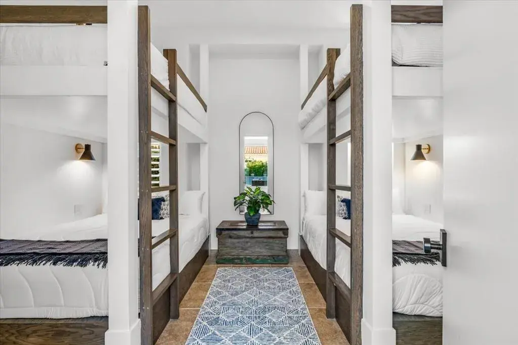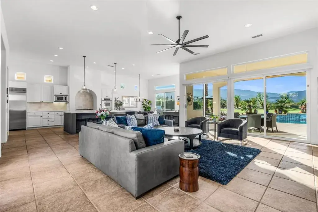 Situated along the 6th Green of PGA West’s prestigious Greg Norman Golf Course, this beautifully remodeled single-family home blends luxury, comfort, and resort-style living. The home’s positioning along the course offers scenic fairway views while being thoughtfully located away from direct tee shots, providing added peace of mind from errant golf balls. Offering four bedrooms and four full bathrooms, the residence includes a detached casita that provides a private retreat for guests. A gated courtyard entry with lush gardens sets a serene tone, while the light-filled interior centers around a private courtyard with a fire pit, waterfall, and spa–ideal for relaxed desert living. The remodeled kitchen features quartz countertops, a designer tile backsplash, stainless steel appliances, a coffee bar, and a charming breakfast nook. An expanded floor plan adds a guest bedroom with custom queen bunk beds and an additional full bath, perfect for hosting family and friends. The primary suite is a tranquil escape with a fireplace, stunning mountain views, and direct courtyard access. Three fireplaces throughout the home add warmth and ambiance on cool desert evenings. Sliding glass doors open to a west-facing patio with breathtaking mountain views. The entertainer’s backyard showcases a sparkling pool, built-in BBQ, misting system, automatic awnings, and multiple seating areas designed for both relaxation and gatherings.