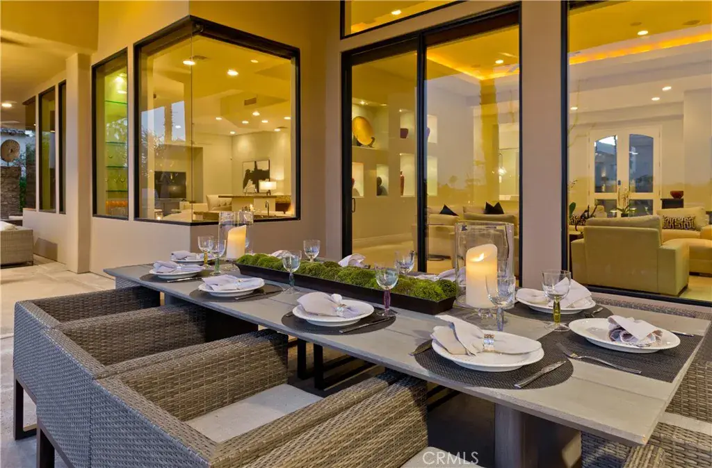 Venture outdoors to the 25,000 gallon infinity saltwater pool, spa with a cascading waterfall, this provides a spot to relax and enjoy the sunshine with numerous seating and lounging options. There is an outdoor family room, with seating for 8 with couches and chairs, 65″ TV and gas operated fireplace. The al fresco dining table seats 10 to enjoy the sunset. .