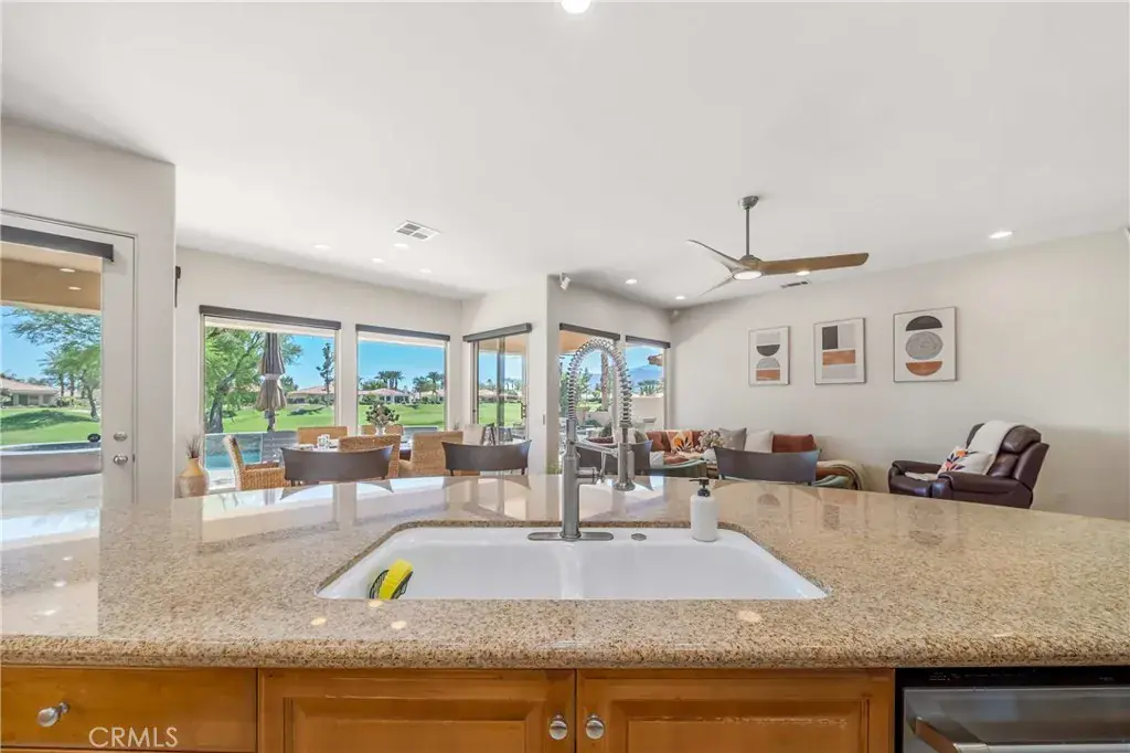 Inside, expansive windows frame golf course views and bring natural light into every room. The great room features soaring ceilings and a cozy gas fireplace, flowing into a well-appointed kitchen with upgraded appliances including a gas range, refrigerator, dishwasher, microwave, and ice maker. Upgrades throughout include a tankless hot water heater, misting system, automatic window fixtures, new garage doors, and newer HVAC systems for year-round comfort.
