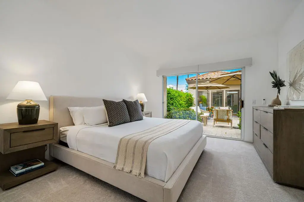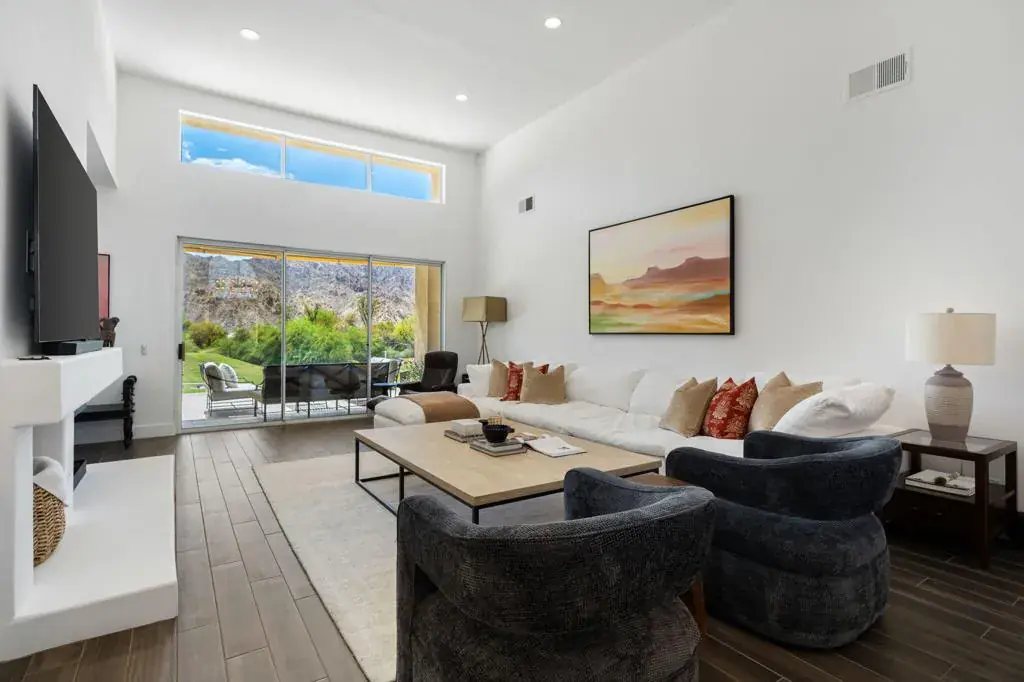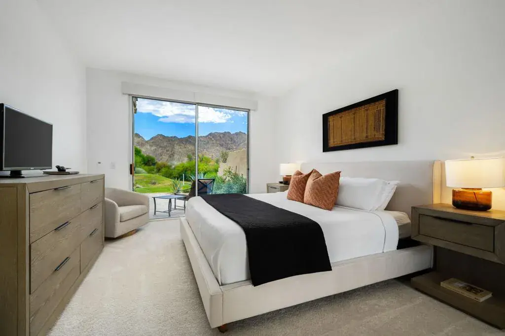 Escape to luxury and leisure in this stunning 4-bedroom, 5-bath seasonal retreat located on the 17th hole of the exclusive Nicklaus Private Course at PGA West. With dramatic, unobstructed views of the Santa Rosa Mountains, this home offers a front-row seat to the beauty and serenity of the desert–perfect for your next extended getaway.Ideal for hosting family or guests, the layout features four beautifully remodeled en-suite bedrooms, including a private detached casita for added comfort and privacy. Each suite is appointed with upscale finishes and designed to provide a relaxing, resort-like experience.The spacious open-concept kitchen is fully equipped with stainless steel appliances, sleek quartz countertops, a generous island, and ample seating for entertaining. Whether you’re preparing dinner or enjoying cocktails after a day on the course, this space makes gathering effortless.The heart of the home is the bright, Great Room perfect for unwinding, with plush designer furnishings, an elegant gas fireplace, and an 85” TV ideal for movie nights or game days. Walls of glass invite the outside in, revealing sweeping mountain and fairway views that never get old.This fully furnished seasonal rental, has been thoughtfully curated with custom decor, high-end furnishings, and everything you need for a seamless extended stay. From plush, hotel-quality linens to a fully stocked kitchen, every detail has been considered to ensure maximum comfort and style. Enjoy high-speed Wi-Fi throughout the home, perfect for work or streaming. Just two doors down, you’ll find sparkling community pools and relaxing spas–ideal for soaking up the sunshine and unwinding after a day on the course or exploring the desert. For added convenience and fun, a golf cart is also available for use during your stay for an additional fee.Whether you’re here for golf, sunshine, hiking, or simply a peaceful escape, this home is the perfect base for enjoying everything the desert has to offer. Please reach out to confirm availability. NOT available for March and April 2026