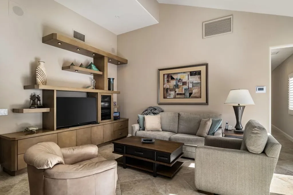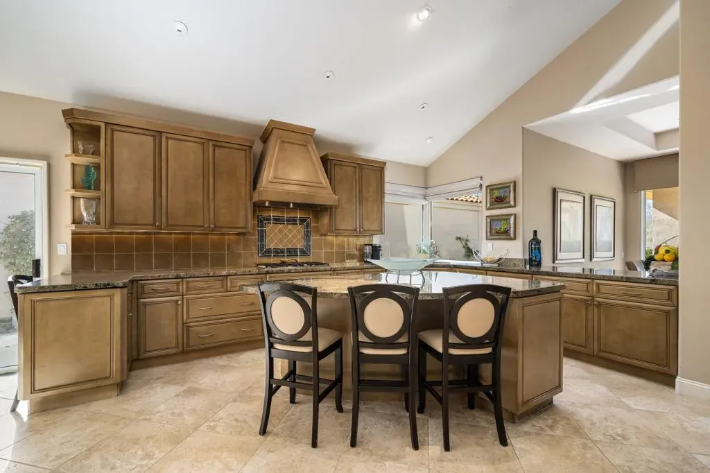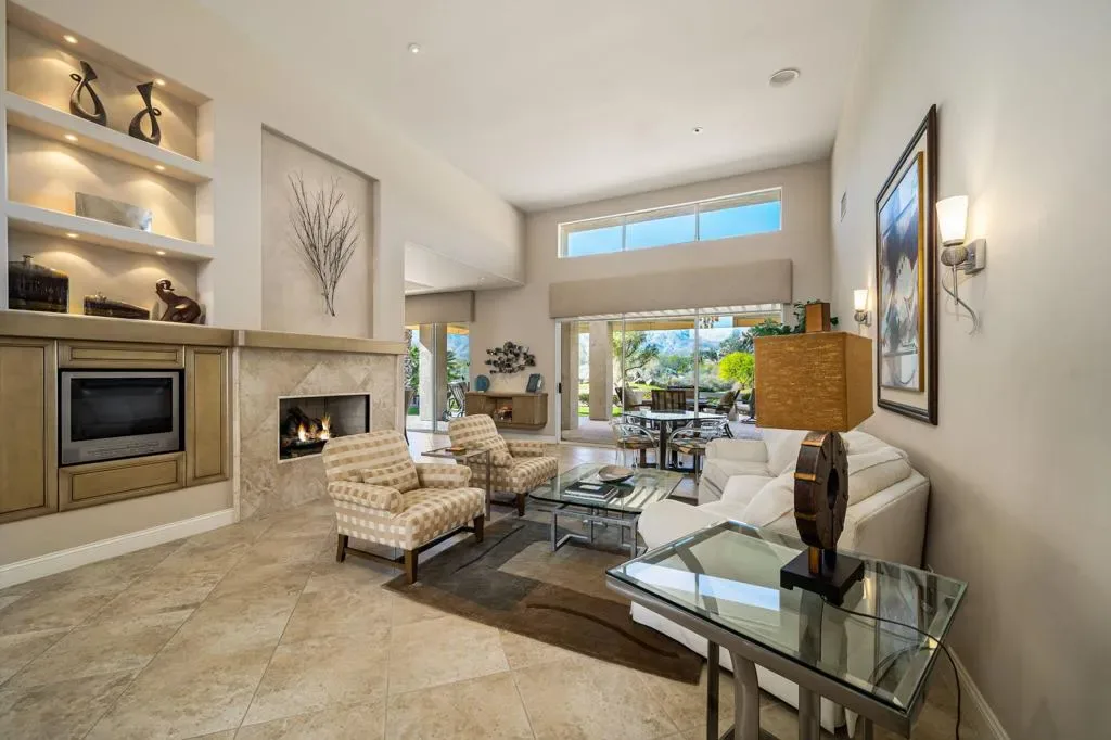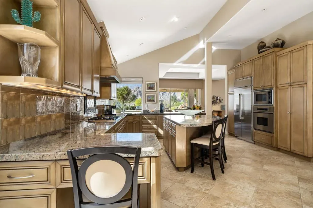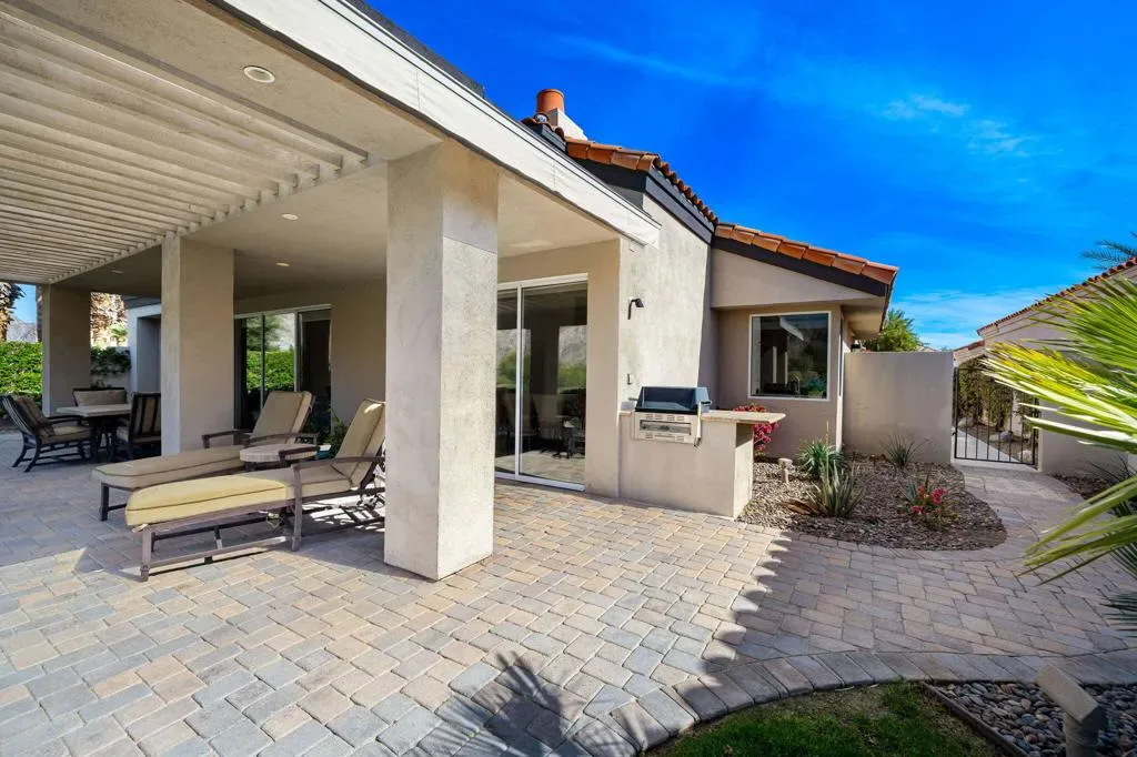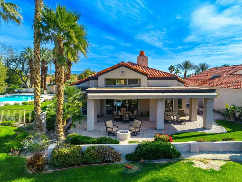 Perfectly positioned on the 16th hole of the renowned Jack Nicklaus Private Course, this beautifully remodeled 4-bedroom, 4.5-bathroom home offers 3,041 square feet of refined living space with breathtaking mountain and fairway views.Owned and lovingly maintained by the same owners since it was built in 1990, this residence showcases true pride of ownership and thoughtful upgrades throughout. The entire home has been remodeled by Bob Edwards, blending timeless elegance with modern comfort.Step through the striking glass front door into a light-filled interior featuring solid core wood doors, upgraded baseboards, custom shutters and blinds, and designer finishes. The spacious kitchen is equipped with stainless steel appliances, a newer refrigerator, and opens seamlessly to the living and entertaining areasThe primary suite is a serene retreat, complete with a skylight in the spa-inspired bathroom, with a separate flowing tub and stand alone shower, new shower doors, updated toilets, and custom solid core closet doors. Comfort is ensured year-round with two AC systems in the main house.Guests will appreciate the generously sized detached casita, featuring a built in desk and cabinetry for an office and a Murphy bed ideal for guests or extended family.Outdoor living is where this home truly shines. Enjoy panoramic golf course and mountain views from the beautifully designed backyard, complete with paver flooring, a trellis-covered patio, and a built-in BBQ–perfect for entertaining under the desert sky.Plus there is a detached golf cart garage as well!This is a rare opportunity to own a meticulously upgraded home in one of the desert’s most sought-after private golf communities. Experience luxury, privacy, and spectacular views all in one remarkable property.Community pool & spa steps away. Offered furnished.