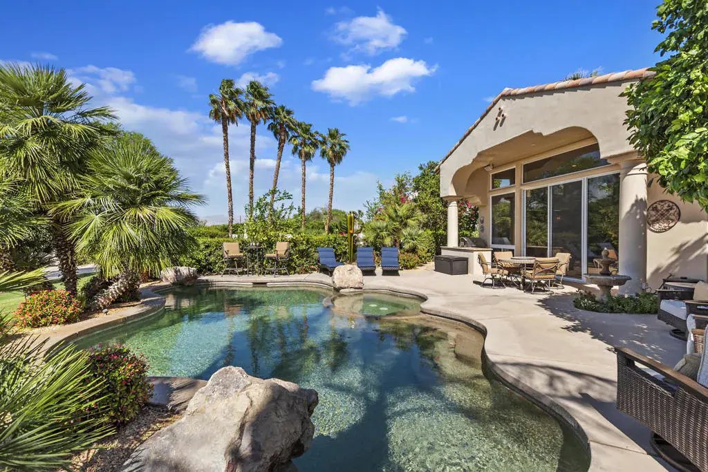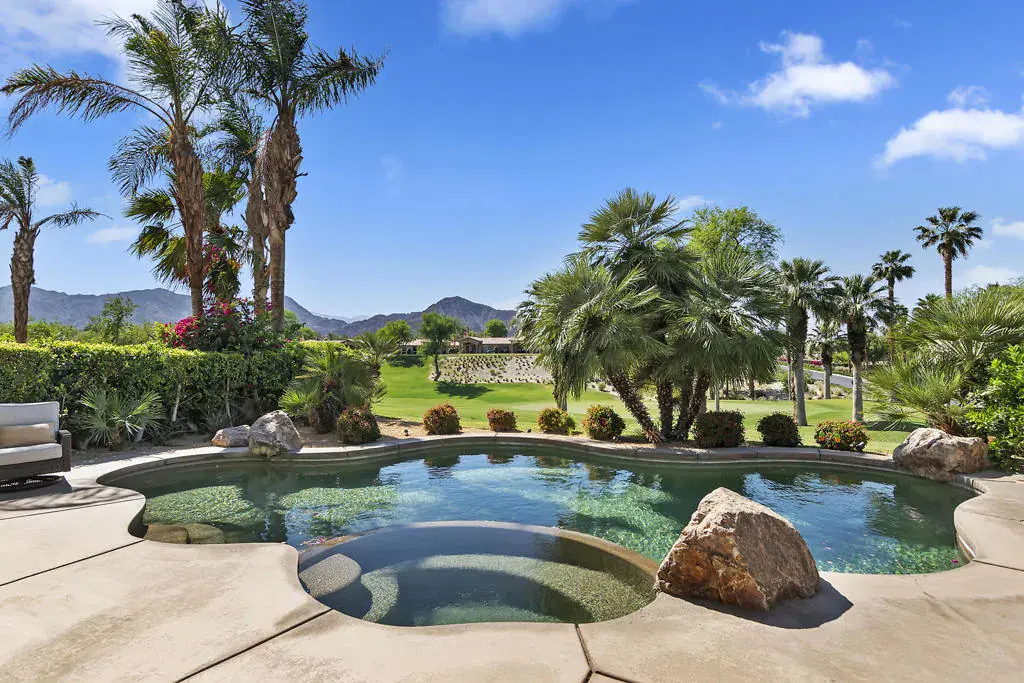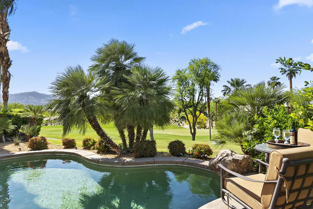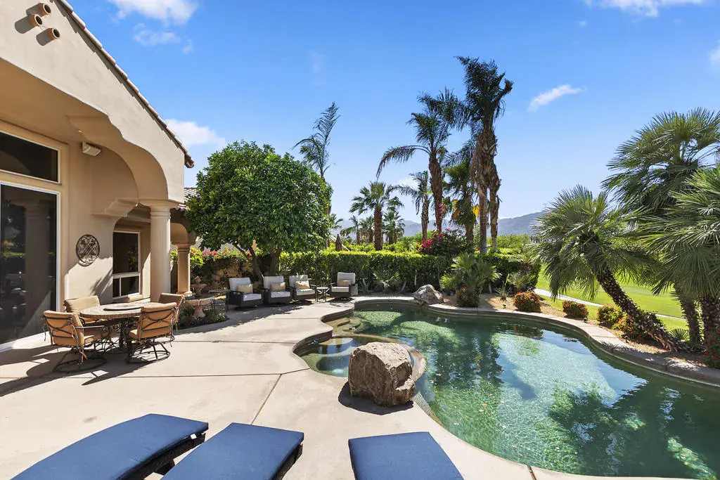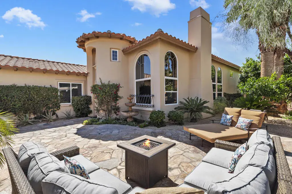 Golfers Retreat!Gorgeous Encanto 2 in Ranch La Quinta CC located on the 1st hole of the Pate course, features a spectacular fairway and mountain view! Come relax in this quality, Turnkey furnished rental! A bistro table at the pool allows you to enjoy the view while sipping your wine! Beautiful custom large pool and spa with fruit trees galore! The quality outdoor living space is beautifully furnished and includes a large Barbecue / Bar area. The front flagstaff courtyard has a dinning table, family style seating with a fire pit. The kitchen boasts a beautiful view, and is truly a chef’s delight with all the extras, including a wine & beverage cooler, a gas cooktop and double ovens with a Nespresso coffee maker. The master bdrm is spacious with an adjustable split king size bed, with dual controls and ensuite bath with tub! The second bdrm is equipped with a King size bed and private bath. The detached private casita has 2 bdrm one with a King bed, fridge and a full bath and the other with a Queen. A two-car garage completes with a Tesla charger which with your adapter can be used for other evehicles. The house is stocked with games,puzzles and 2 bicycles! There is an Olympic size pool at the tennis facility at Rancho La Quinta, and access to all of the nine pools, as well as pickle ball courts! Sept, Oct $15000, Nov/Dec/Jan 16000 Feb March $17,000 April $18,000 AVAILALBLE April 2025!!!
