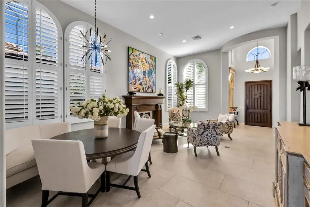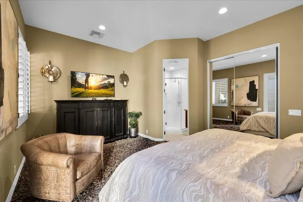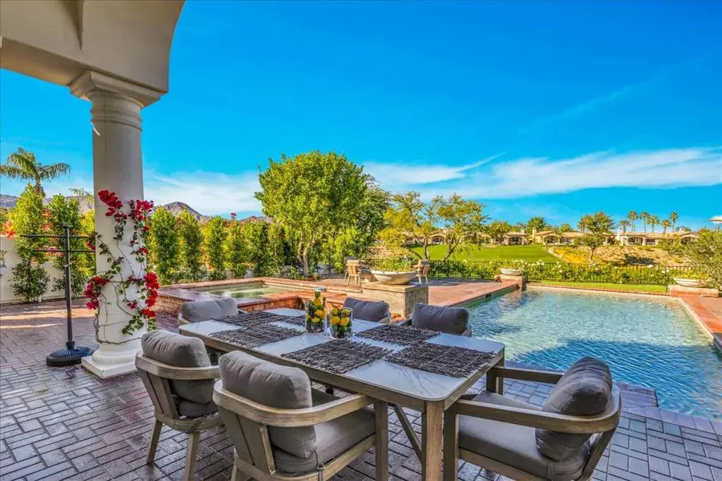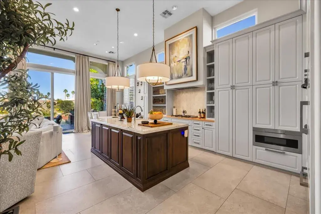 Set within the gates of Rancho La Quinta, this newly renovated Encanto II offers over 3,200 square feet of effortless indoor-outdoor living. Thoughtfully redesigned with clean, modern influences and finishes, the home offers relaxed and refined comfort. The main residence features three spacious bedrooms each with its own ensuite bathroom, while the detached two-room casita provides additional privacy for guests, complete with a Jack and Jill bath and built-in kitchenette–ideal for extended guests. The kitchen has been updated with custom cabinetry, a statement range hood, high-end appliances, and a sophisticated blend of marble and butcher block surfaces. Positioned along the 1st fairway of the Pate Course, the rear patio captures sweeping southwest mountain views. The outdoor living space is designed for both quiet mornings and relaxed evenings, complete with pool and spa, mature fruit trees, and a generous built-in fire feature. Offered turnkey with curated furnishings, accessories, and art, this home is well-suited for those seeking a beautifully appointed seasonal retreat within one of La Quinta’s most established golf and lifestyle communities.