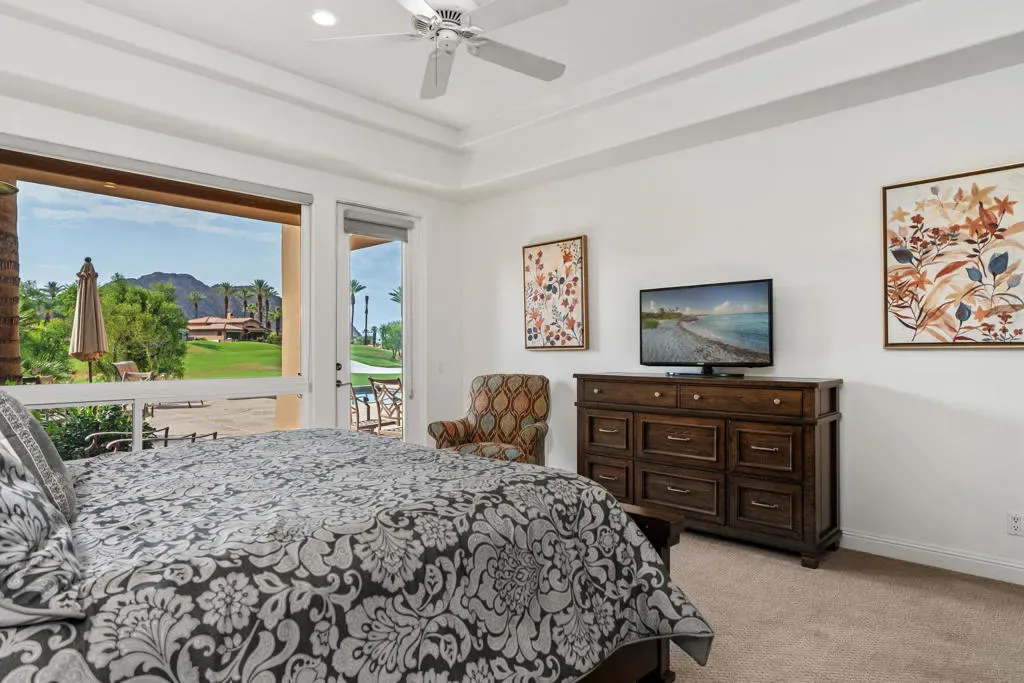 Perched above the 3rd fairway of the renowned Jones Course, this stunning Terraza II residence offers more than a home–it offers a perspective. Here, panoramic views of the Santa Rosa Mountains serve as your daily masterpiece, creating a breathtaking backdrop for legendary evening sunsets. This is the quintessential Rancho La Quinta lifestyle realized. The main residence features two bedrooms and two-and-a-half baths. Engineered wood flooring graces the living areas, where soaring high ceilings amplify the sense of light and space. The property’s generous layout is further enhanced by a desirable detached casita, a private sanctuary offering two additional bedrooms connected by a Jack and Jill bath–perfect for hosting esteemed guests or creating a private executive office. Offered turnkey furnished, this residence allows for an immediate transition into your coveted desert life. Beyond the threshold, you own a stake in one of the desert’s most sought after communities. As a resident, you are perfectly positioned to enjoy the much-anticipated Rancho La Quinta Country Club renovation, slated for completion mid-season. This transformation will further elevate a club already synonymous with world-class amenities and an exclusive social calendar. This is a rare opportunity to acquire an elevated viewpoint within an unparalleled setting.