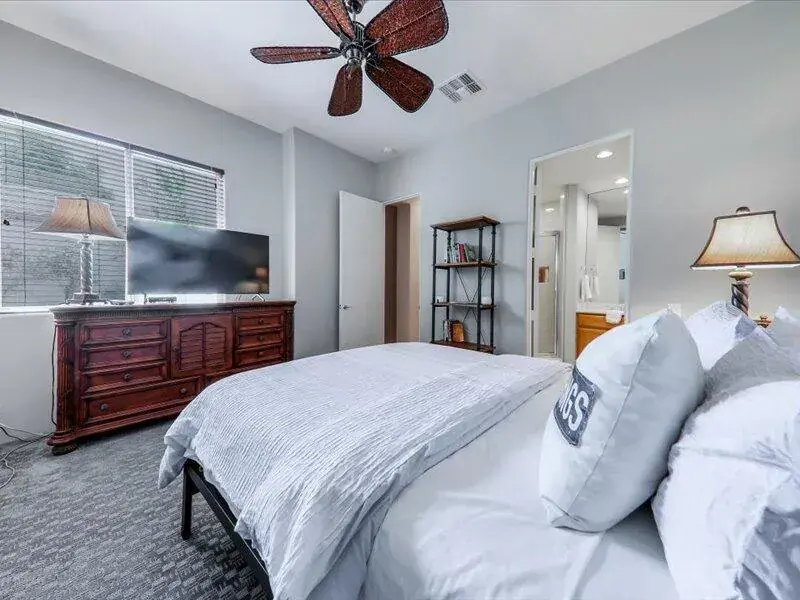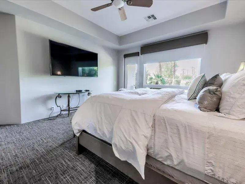 Welcome to your gorgeous pool home in beautiful Rancho La Quinta Country Club. This west-facing home situated on the Pate course with double fairways has striking Santa Rosa Mountain views! This Encanto 2 floor plan includes a detached Casita (2 bedrooms in main home plus 2 in Casita) and a beautiful main house with high ceilings. Enter this exceptional property through a slate tiled front patio with fountain to a custom front door. You enter the open concept floorplan home to a large living room. The kitchen has granite countertops and stainless-steel appliances along with a large island with barstools plus separate dining area. The family room has a large fireplace across from floor to ceiling windows overlooking the pool area. The primary bedroom looks out onto the pool area and has a large walk-in closet and a stunning bathroom with glassed in shower and separate spa tub. There is also one extra bedroom with flat screen television in the main house. There are two bedrooms in the detached casita. Outdoor living area boasts a lovely salt water, pebble-tech pool/spa with water feature, built-in BBQ and plenty of seating. Rate varies depending on month.