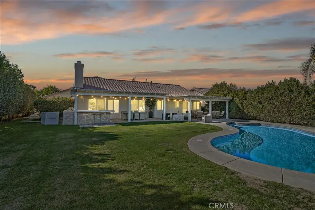 The luxurious master suite is thoughtfully positioned away from the three guest rooms, ensuring privacy and tranquility. With fresh paint and beautiful flooring throughout, this home exudes charm. The meticulously maintained backyard spans 11k sq ft and features a pool, spa, fire pit, and inviting patio, perfect for hosting gatherings.