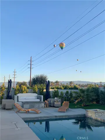The home offers multiple bedrooms, each with its own en-suite bathroom and private outdoor access. The master suite is a true retreat, a spa-like bathroom featuring a freestanding tub, and direct access to a private terrace hot tub. The outdoor spaces are designed for both relaxation and entertainment, featuring a sleek pool, a barbecue, and a cozy fire pit, miniature golf, outdoor dining area, all set against the backdrop of palm trees and sightings of early mornings air balloons.