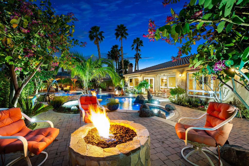 Set on a premium, oversized homesite within the desirable Rancho Santana community and bordering the prestigious Madison Club, this exceptional Plan 4 residence offers a rare blend of privacy, scale, and resort-style living, with beautiful mountain views and no neighboring homes along the northwest side. A gated courtyard entry with Alumawood-covered patio welcomes you into a thoughtfully upgraded home featuring soaring 10-foot ceilings, upgraded 8-foot doors, plantation shutters, custom built-ins, and an open layout designed for both elegant entertaining and comfortable everyday living. The home includes a private attached casita with its own entrance, walk-in closet, upgraded bath, and separate climate system, providing an ideal retreat for guests, extended family, or a private office. Numerous mechanical and convenience upgrades enhance the home, including multiple newer HVAC systems, split systems for individualized comfort, newer water heaters, a whole-house water softener, EV charging capability, upgraded garage door with MyQ controls, extensive storage, and designer ceiling fans throughout. The backyard is truly a private resort, highlighted by a PebbleTec saltwater lagoon-style pool with beach entry and multiple tanning shelves, a dramatic cascading spa with multi-level jets, fire bowls, a raised fire pit, and multiple outdoor entertaining areas designed for gatherings and relaxation. A palapa with lighting, fan, and speakers creates a perfect shaded retreat, while the covered patio, professional landscape lighting, citrus and tropical plantings, raised garden beds, and two outdoor showers add to the resort atmosphere. Paver hardscaping and an expanded driveway that accommodates numerous vehicles complete this exceptional property, which embodies luxury desert living with privacy, comfort, and spectacular outdoor spaces.