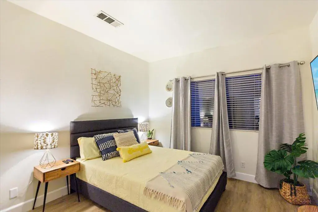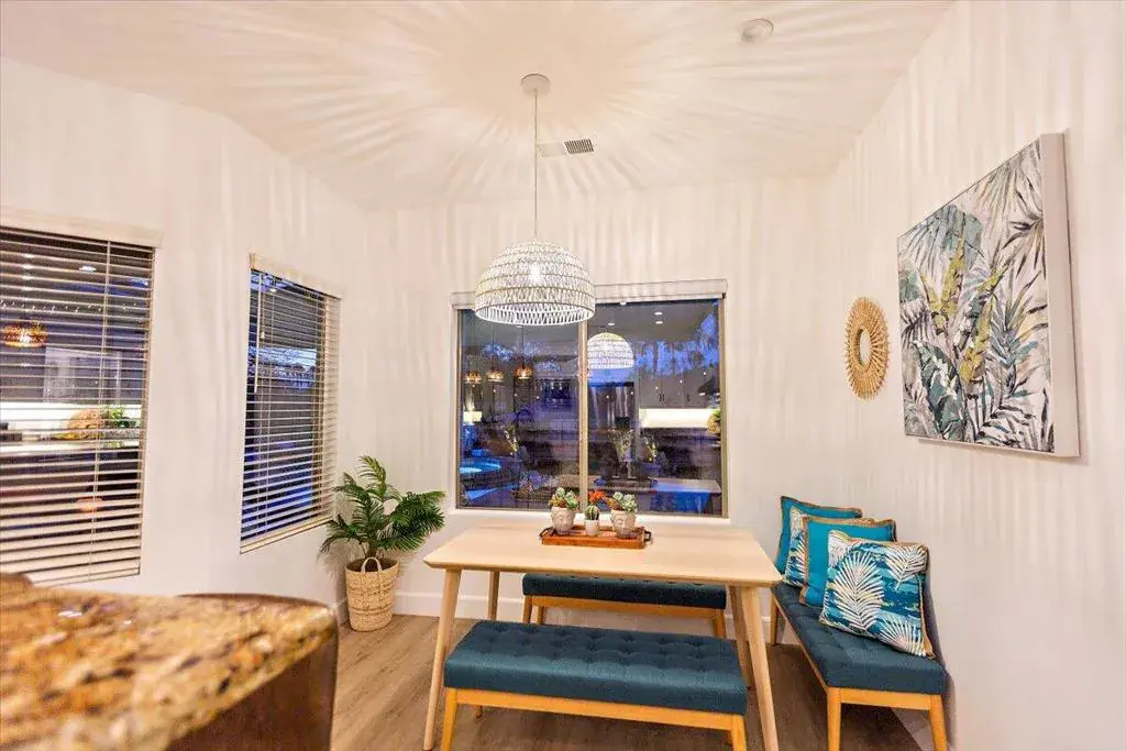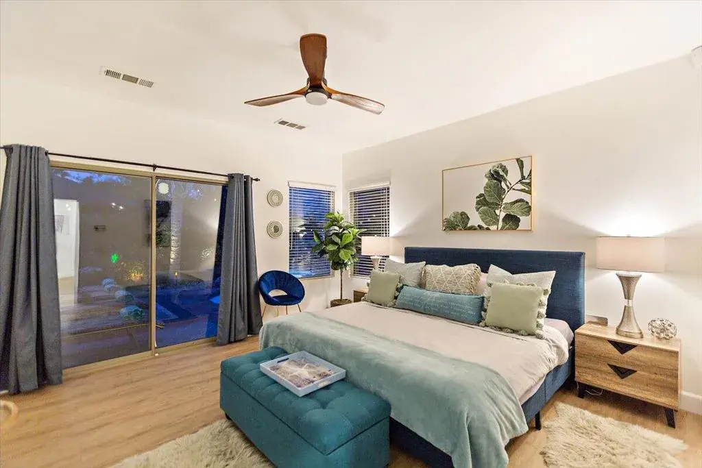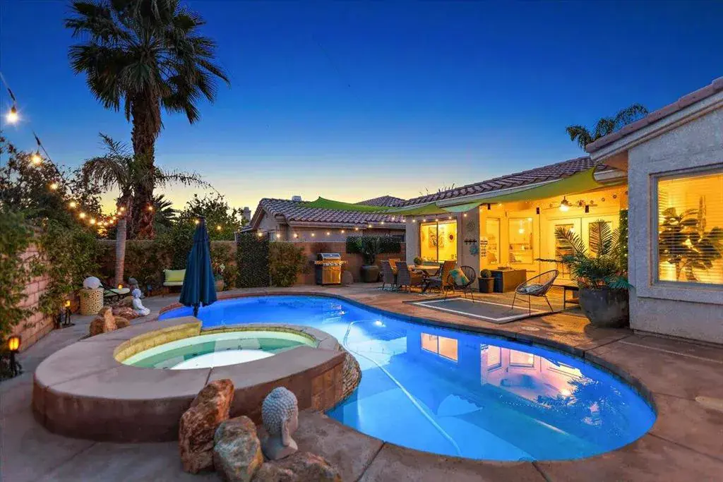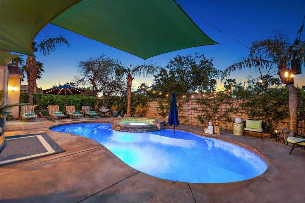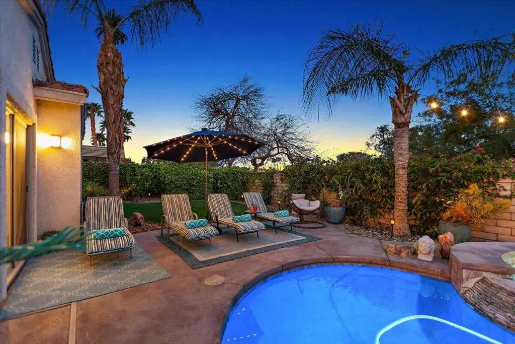 This ultimate desert living pool house is centrally located for utmost convenience. You will enjoy four bedrooms, a gourmet kitchen, stainless steel appliances, and a serene backyard for family fun. The kitchen feels spacious and provides under lighting cabinets, granite counter tops, and a beautiful island. The breakfast nook provides a view of the expansive backyard with a private saltwater pool and spa. The family room has a gas burning fireplace, ceiling fan, large flat screen tv and speakers. All bathrooms have dual sinks. The primary bedroom has a large custom walk-in closet with built in shelves and cabinet and a sliding glass door that leads into the beautiful backyard. The primary bathroom features a huge, jetted bathtub, dual shower spa with a wide bench in a glass block wall enclosure. This home features luxury vinyl laminate wood floors throughout for a beautiful and modern look. The well-manicured front and backyard will provide the perfect atmosphere for the rest and relaxation you’re looking for!Rates vary by month, please inquire with listing office.