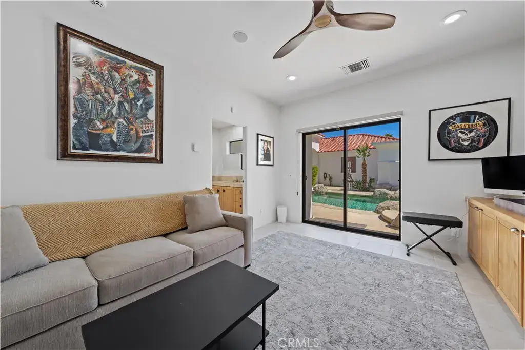 The other two guest bedrooms are located n the casita which have a jack and jill bathroom. These bedrooms have their own entry and open directly onto the courtyard with views of the beautiful salt water pool, spa and fountain. The courtyard has a built in BBQ and faces south, offering a panoramic view of the Santa Rosa mountains and optimal sun tanning conditions all day long.