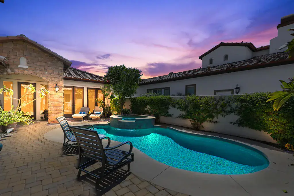 This property is available for long-term lease. Call for seasonal rate. Discover the essence of a desert retreat at The Citrus in La Quinta that defines relaxation and style. This thoughtfully designed plan offers a large great room around a chef’s kitchen that’s every culinary enthusiast’s dream.With four bedrooms, that includes a private casita, ensures ample space for everyone. The allure of this property extends outdoors to a private courtyard with a saltwater pool with a spa awaits. The outdoor kitchen/barbecue area effortlessly facilitates entertaining, making gatherings a breeze.Ascend to the upstairs loggia to witness breathtaking western mountain views. This additional seating area comes complete with a fireplace and even a designated spot for a 50′ TV, creating an outdoor haven that’s perfect for lounging or hosting.Whether you seek a lock-up-and-leave lifestyle or a family-friendly space, this home caters to your desires. With its private pool and spa, along with the addition of a man cave, every aspect has been considered to provide both luxury and practicality.Embrace a lifestyle that combines both charm and functionality, with ease in this exceptional vacation rental opportunity.