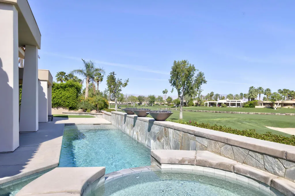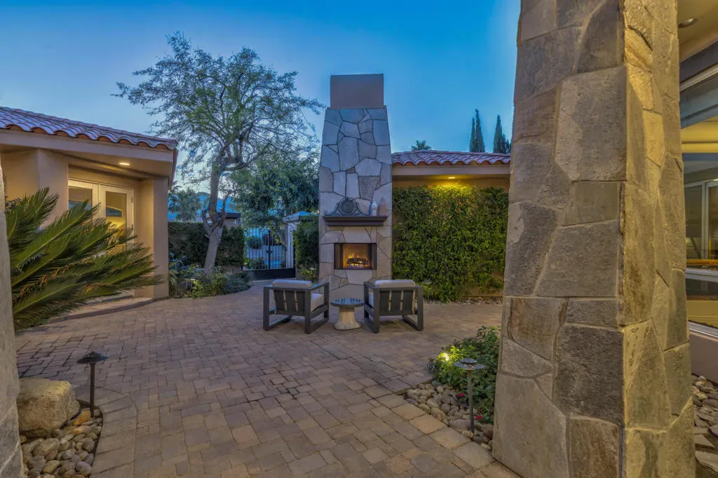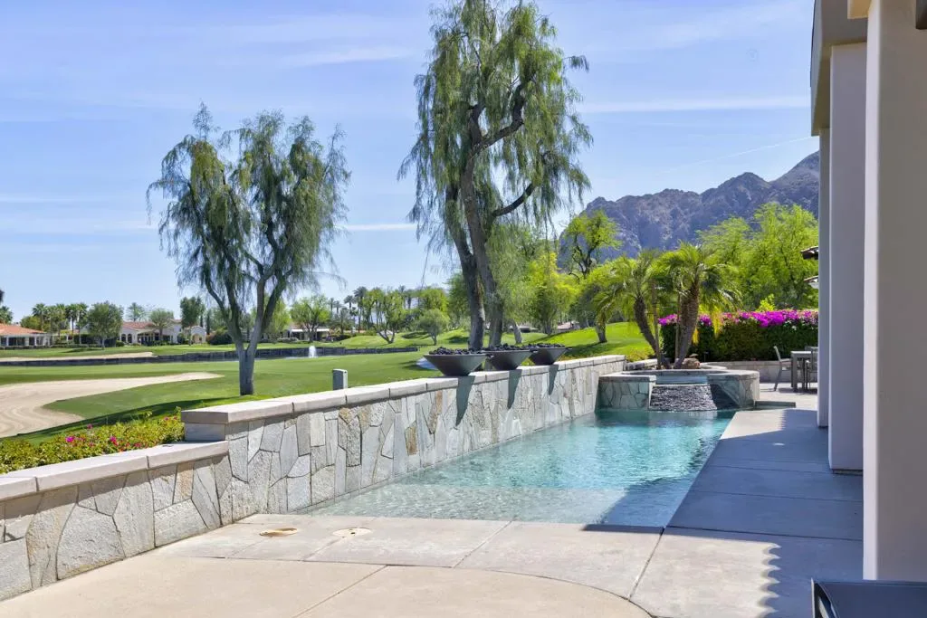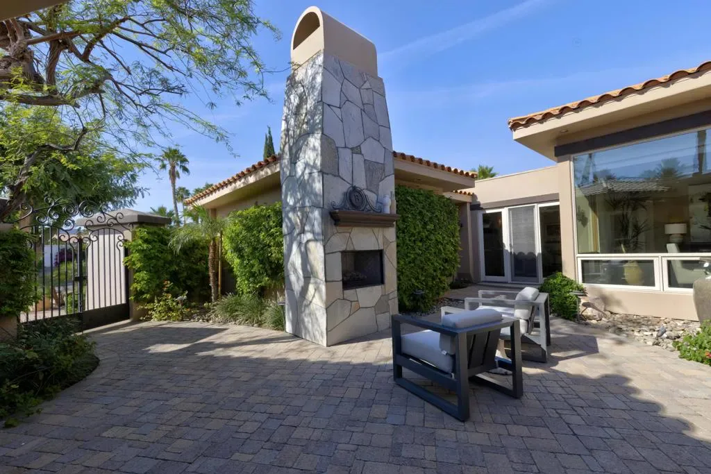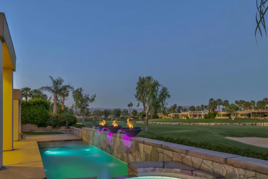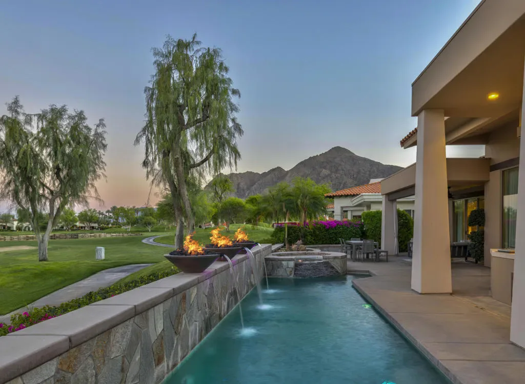 Gracefully introduced through a private, gated courtyard, the residence sets a tone of quiet sophistication from the moment of arrival. A fireplace, tranquil water feature, and generous space create a warm and inviting entry–an elegant prelude to the home beyond. Encompassing approximately 4,169 sqft., this custom-built property is ideally positioned along the 6th fairway of The Citrus, where sweeping double-fairway, lake, and mountain views unfold, framed by the Santa Rosa Mountains and the San Bernardino range.The home offers 4 bedrooms and 4 1/2 bathrooms, each bedroom thoughtfully designed as an ensuite. Natural light moves effortlessly through the interior, enhancing the connection between indoor living spaces and the surrounding landscape.Outdoor living is both elegant and functional, centered around a private patio with pool and spa. 3 elevated fire features create a striking visual element while cascading into the pool below, adding movement and ambiance.An expansive great room opens to a formal dining area and a well-appointed kitchen featuring granite countertops, custom cabinetry, and premium appliances. A centrally positioned wet bar enhances the home’s entertaining appeal while framing the scenic views. Ample storage is integrated throughout.The primary suite offers a sense of privacy and comfort, complemented by a spa-inspired bath with soaking tub and dual shower. An attached casita provides well-appointed guest accommodations. Additional spaces include a dedicated office, a versatile hobby or utility room, and an oversized laundry room.Architectural features such as four fireplaces, vaulted ceilings, recessed lighting, and custom electric shades contribute to a sophisticated yet welcoming environment. An attached 3-car garage provides ample storage and functionality.Designed for ease of ownership, the property reflects a low-maintenance desert lifestyle and has been meticulously maintained. Offered furnished turnkey, it presents an immediate opportunity to enjoy one of the desert’s most established golf communities. The seller’s equity golf membership is to be purchased in conjunction with the property. Ideally located near the Coachella and Stagecoach festival grounds, the Indian Wells Tennis Garden, hiking trails, as well as premier dining and shopping, the home offers privacy and proximity to the area’s most notable attractions.