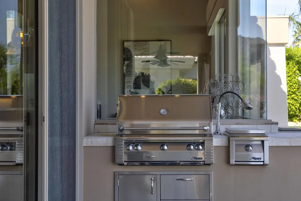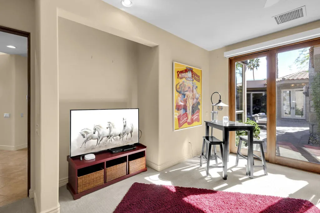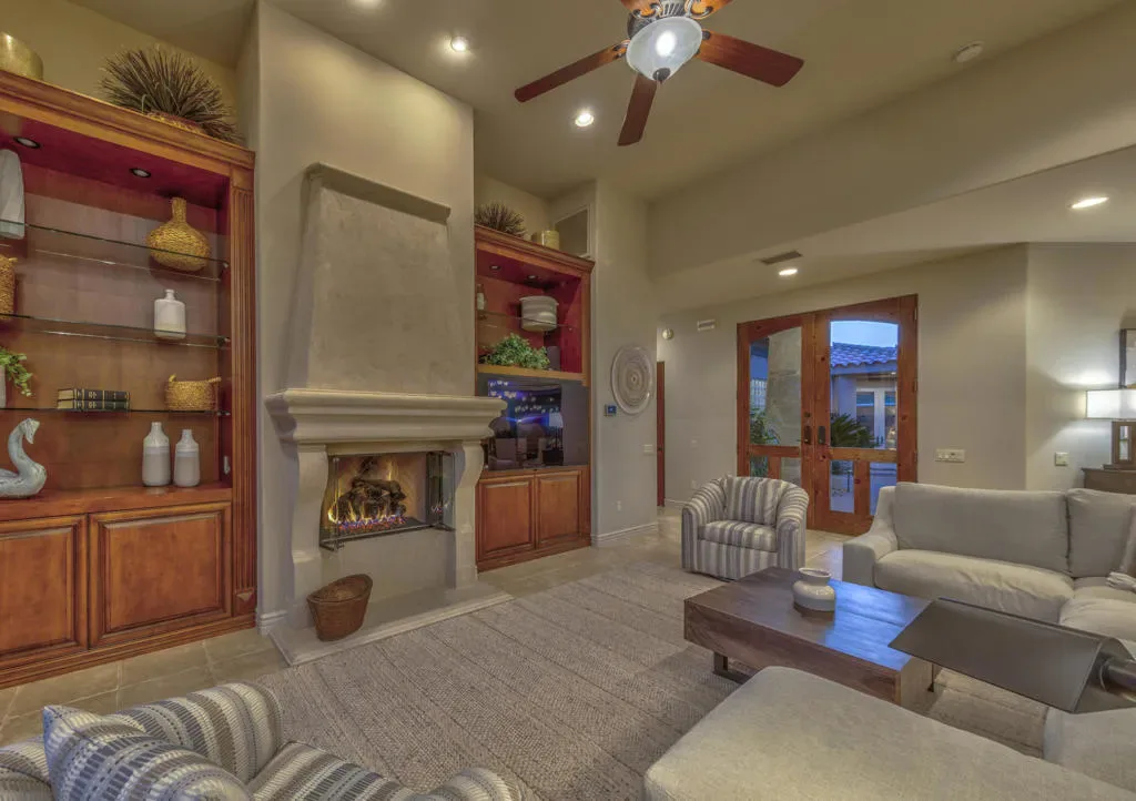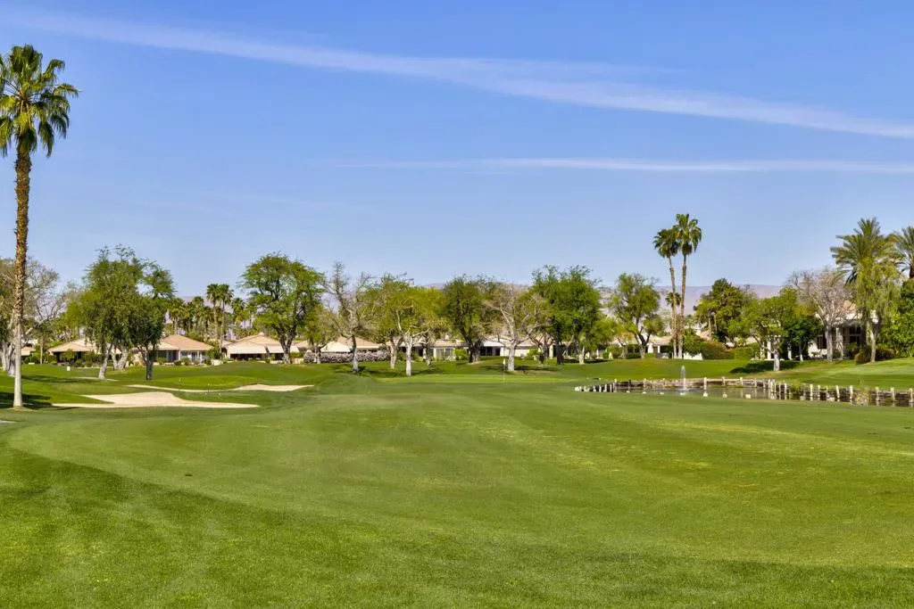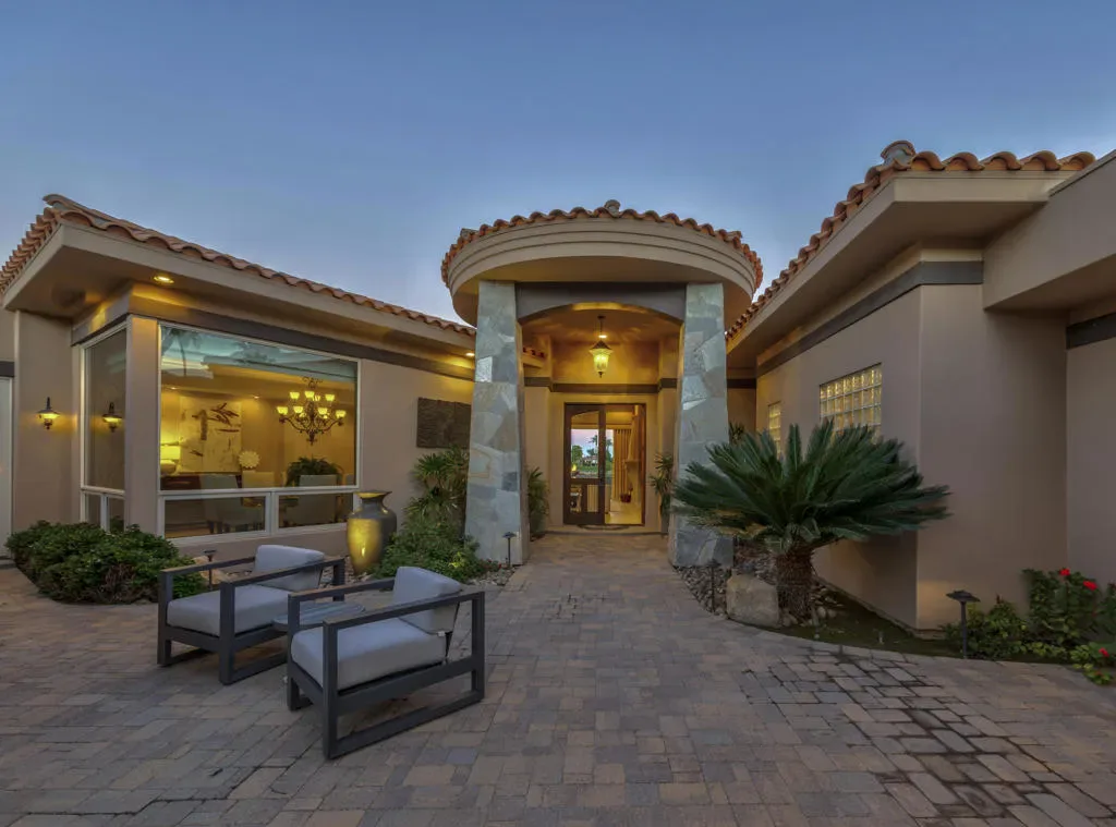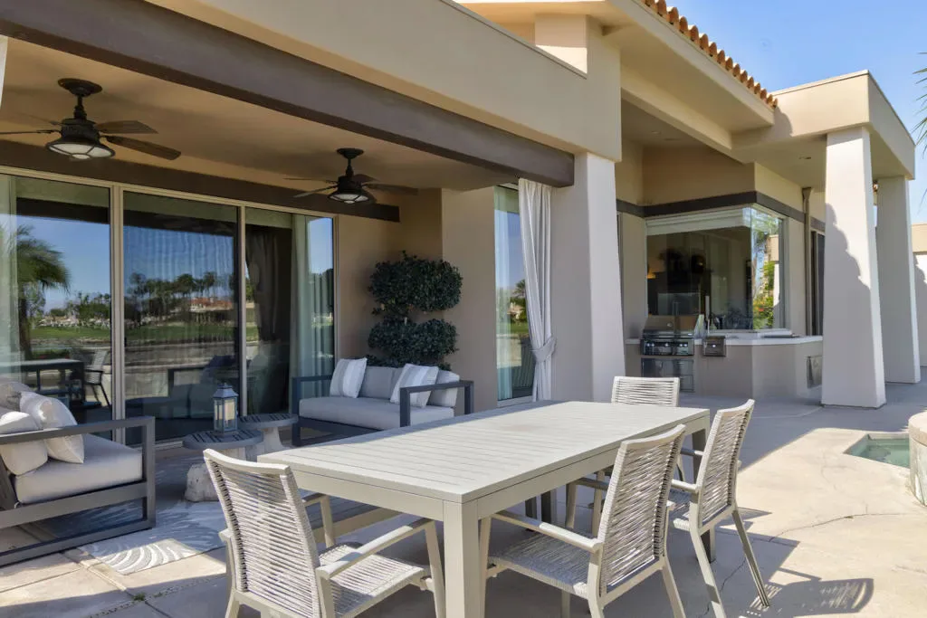 Gracefully introduced through a private, gated courtyard, the residence sets a tone of quiet sophistication from the moment of arrival. A fireplace, tranquil water feature, and generous space create a warm and inviting entry–an elegant prelude to the home beyond. Encompassing approximately 4,169 sqft., this custom-built property is ideally positioned along the 6th fairway of The Citrus, where sweeping double-fairway, lake, and mountain views unfold, framed by the Santa Rosa Mountains and the San Bernardino range.The home offers 4 bedrooms and 4 1/2 bathrooms, each bedroom thoughtfully designed as an ensuite. Natural light moves effortlessly through the interior, enhancing the connection between indoor living spaces and the surrounding landscape.Outdoor living is both elegant and functional, centered around a private patio with pool and spa. 3 elevated fire features create a striking visual element while cascading into the pool below, adding movement and ambiance.An expansive great room opens to a formal dining area and a well-appointed kitchen featuring granite countertops, custom cabinetry, and premium appliances. A centrally positioned wet bar enhances the home’s entertaining appeal while framing the scenic views. Ample storage is integrated throughout.The primary suite offers a sense of privacy and comfort, complemented by a spa-inspired bath with soaking tub and dual shower. An attached casita provides well-appointed guest accommodations. Additional spaces include a dedicated office, a versatile hobby or utility room, and an oversized laundry room.Architectural features such as four fireplaces, vaulted ceilings, recessed lighting, and custom electric shades contribute to a sophisticated yet welcoming environment. An attached 3-car garage provides ample storage and functionality.Designed for ease of ownership, the property reflects a low-maintenance desert lifestyle and has been meticulously maintained. Offered furnished turnkey, it presents an immediate opportunity to enjoy one of the desert’s most established golf communities. The seller’s equity golf membership is to be purchased in conjunction with the property. Ideally located near the Coachella and Stagecoach festival grounds, the Indian Wells Tennis Garden, hiking trails, as well as premier dining and shopping, the home offers privacy and proximity to the area’s most notable attractions.