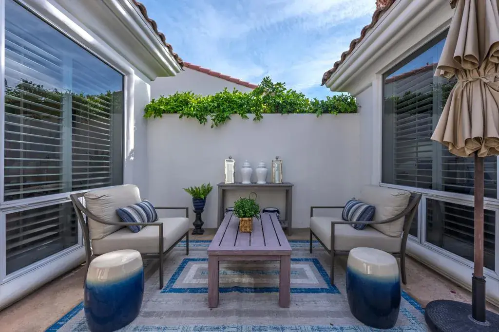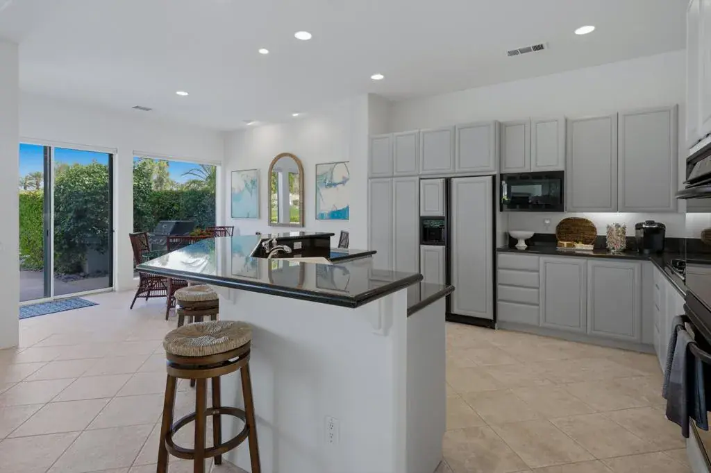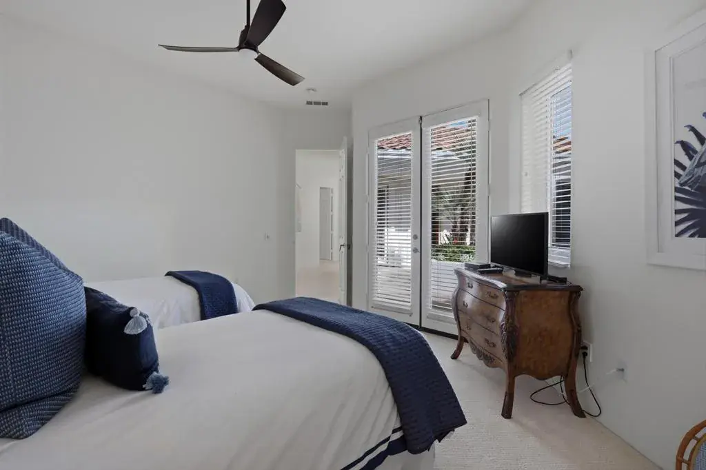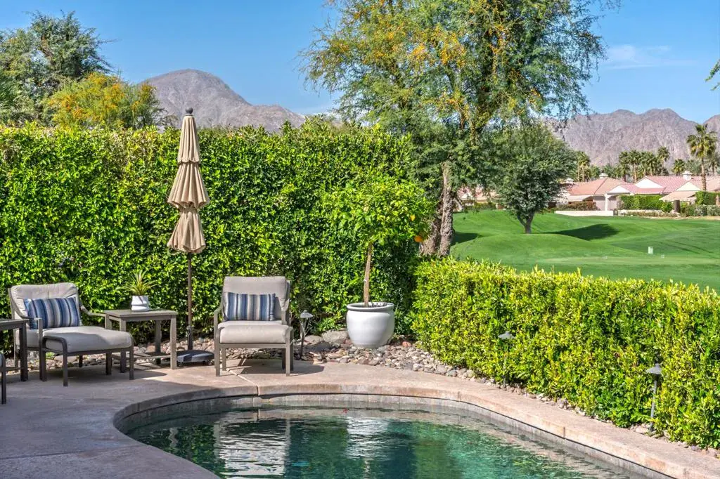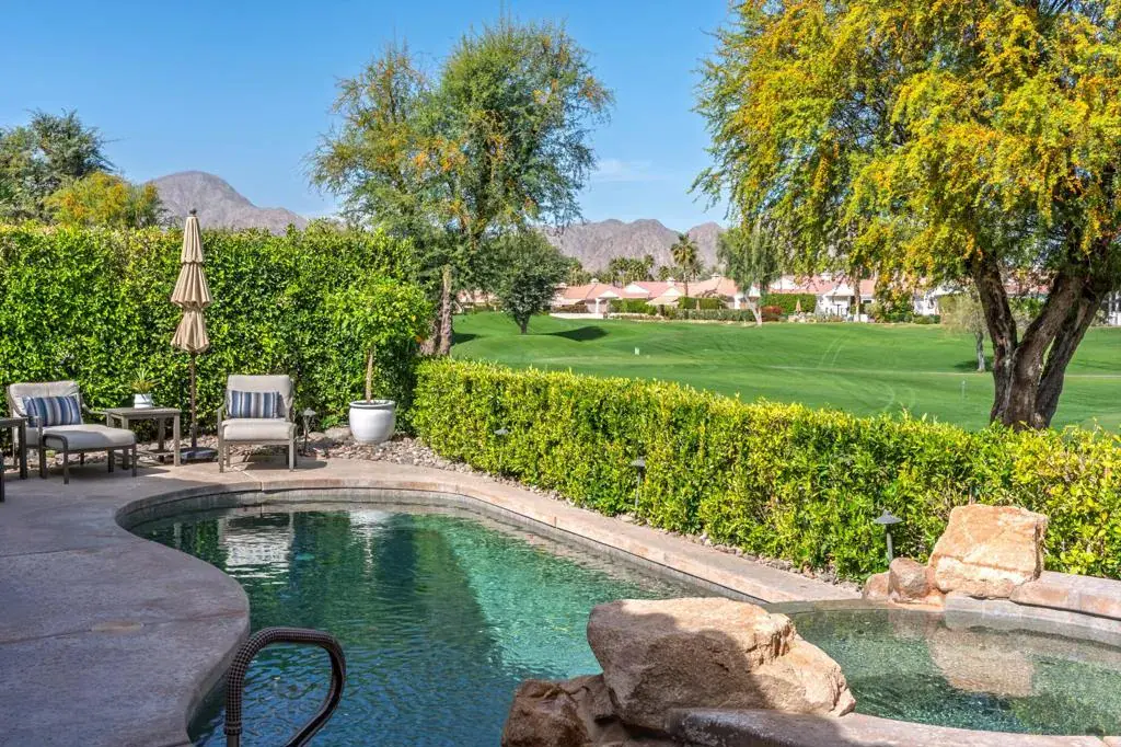 Luxury Turnkey Golf Course Retreat in The Citrus – La Quinta, CA. Welcome to one of the most delightful and impeccably styled homes in The Citrus Golf Country Club. From the moment you enter the private courtyard, there is a sense of arrival, an immediate feeling that this home is something special. Elegant yet warm, refined yet inviting, it has been thoughtfully curated and is offered turnkey furnished, allowing you to begin enjoying the desert lifestyle from day one.Inside, the open-concept design unfolds effortlessly. The great room is both sophisticated and comfortable, featuring a custom built-in cabinet with a hidden television that preserves the clean architectural lines. The space flows seamlessly into the gourmet kitchen, where granite countertops, a gas cooktop, nice counter top spaces, and ample bar seating make entertaining feel natural and easy. Adjacent, a welcoming dining area creates the perfect setting for intimate dinners or lively gatherings.A wall of windows frames sweeping views of the 8th fairway of The Citrus Private Golf Course, bathing the home in natural light and creating a stunning indoor-outdoor connection that defines true desert living.Step outside and the experience continues. The backyard is a private resort-style retreat overlooking the fairway. A sparkling pebble-tec pool and spa invite relaxation, while the new BBQ grill, outdoor dining area, and comfortable lounge seating set the stage for unforgettable evenings under the desert sky. Even your four-legged companions are considered, with a dedicated artificial turf area designed just for them. The primary suite is a peaceful sanctuary, offering direct views of the pool and golf course. Two walk-in closets provide generous storage, and the en-suite bath delivers both comfort and privacy. Thoughtfully separated from the primary suite, the guest bedroom features its own en-suite bath, ensuring a private and comfortable stay for family or friends.Near the entry, a versatile bonus room with a pull-out sofa and privacy door offers flexibility as an overflow guest room, office, or cozy den.Completing the property is a detached casita with its own en-suite bathroom — ideal for visiting guests, extended family, or additional privacy.With a two-car garage plus a golf cart, and beautiful furnishings and decor throughout, this home truly checks every box. Whether you are seeking a primary residence, seasonal retreat, or investment property, you will love this home.