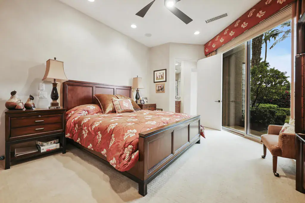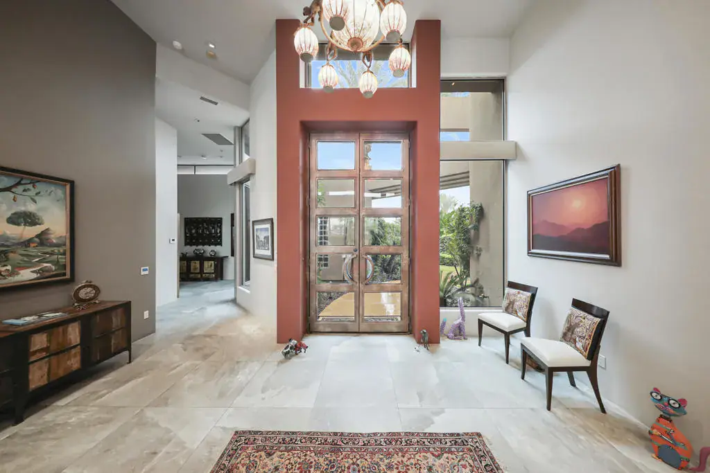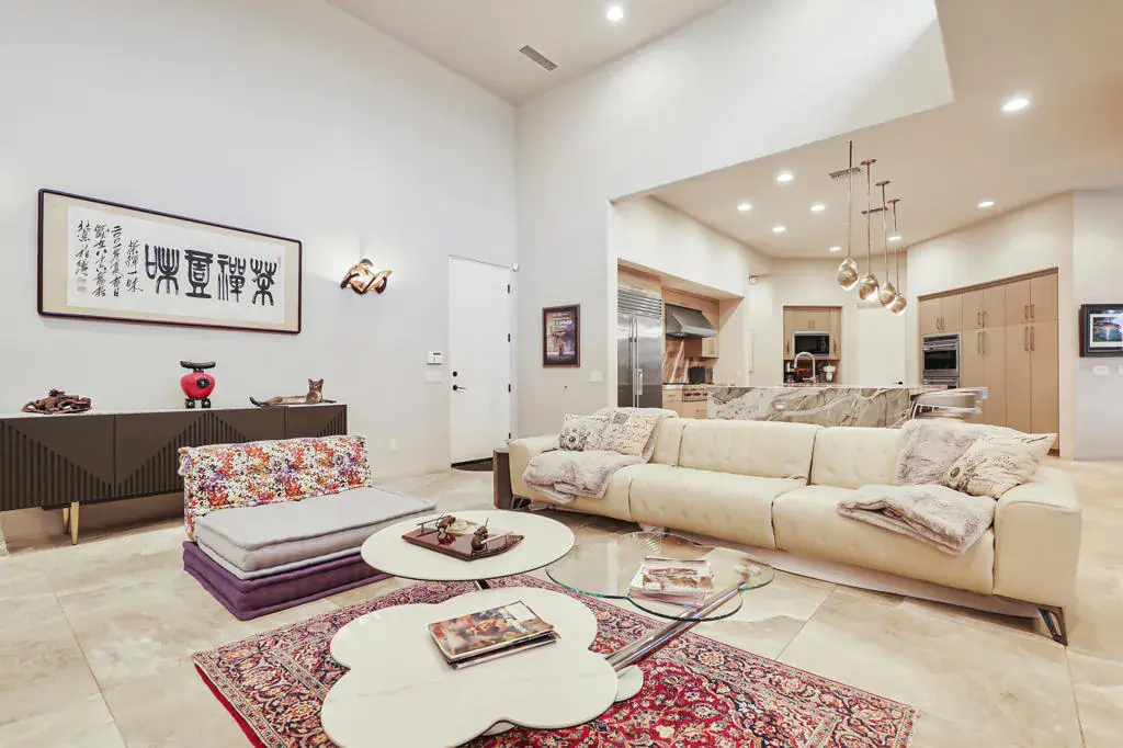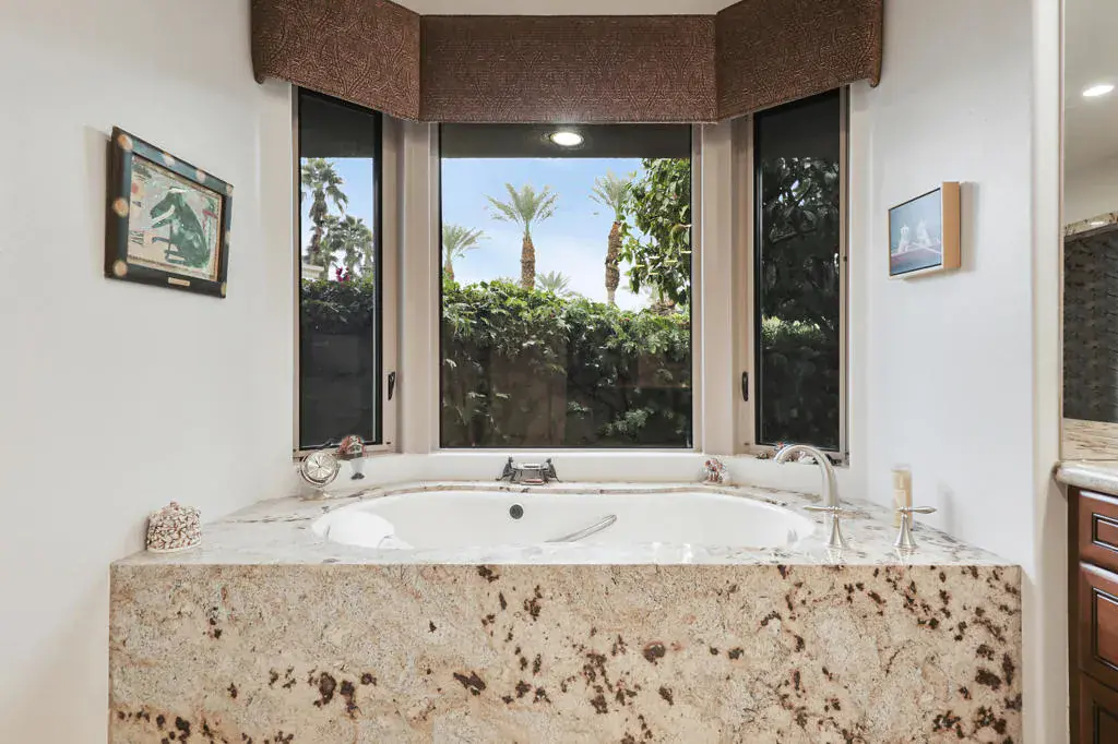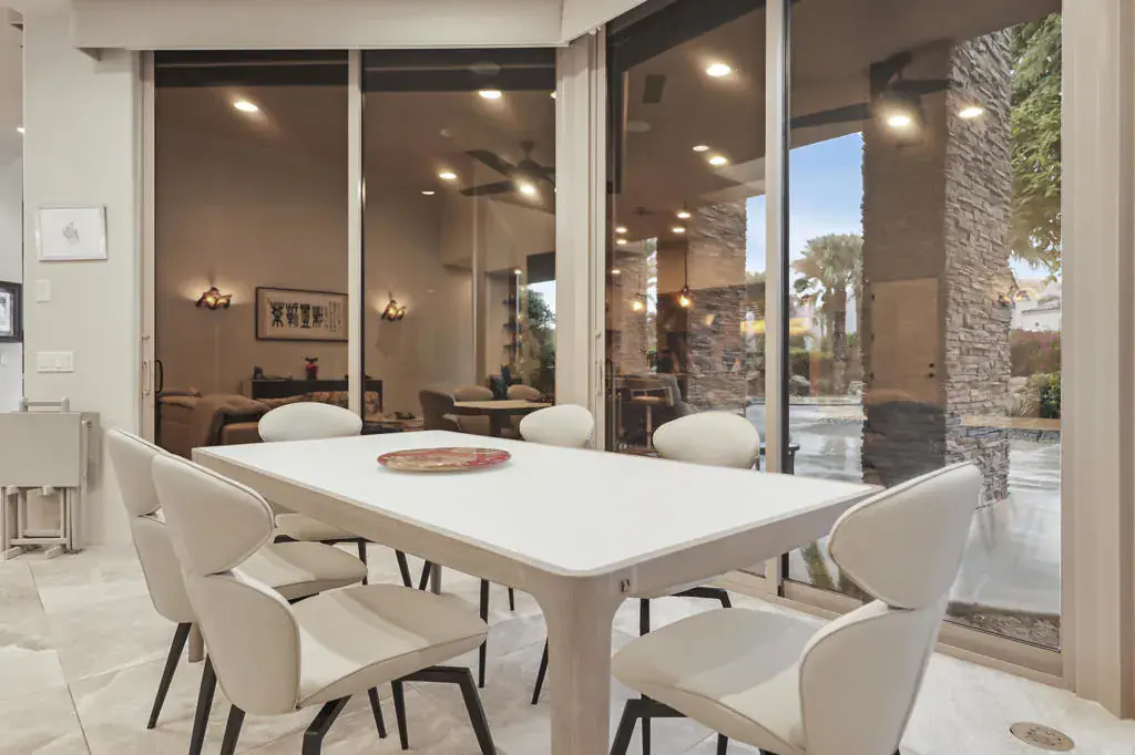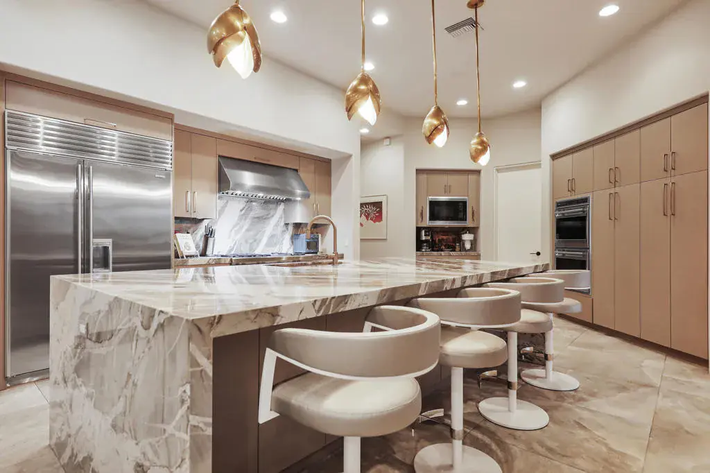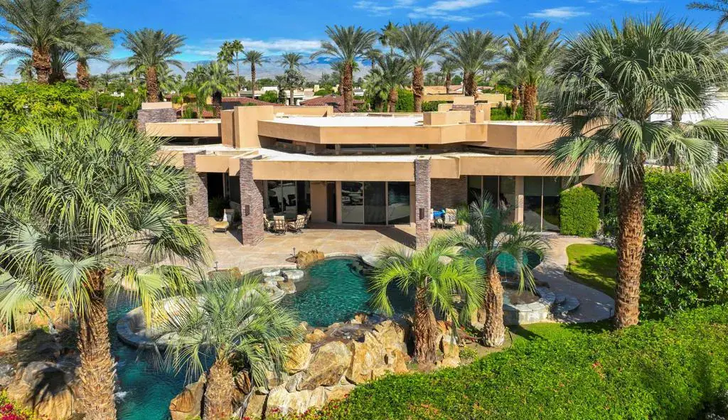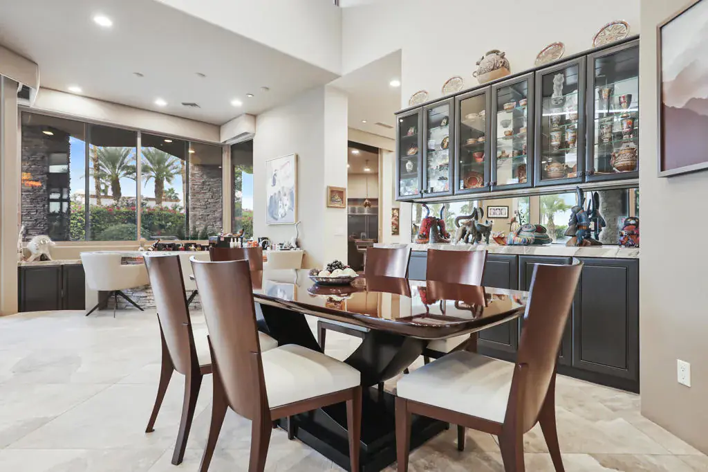 This spectacular Desert Contemporary estate sits on nearly a 3/4 acre private home-site in the heart of La Quinta, at The Estancias, a private gated enclave of only 49 custom estates. Offering 5,097 square feet of living space and nearly 200-degrees of mountain views. This home is designed for those who value privacy, views and seamless indoor-outdoor living. The residence includes 3 ensuite bedrooms, 5 bathrooms, and a spacious office and a gym. At the heart of the home is a recently re-imagined chef’s kitchen, anchored by dramatic waterfall marble counters, a 48-inch gas cooktop, and stunning custom cabinets. Outfitted with double ovens, dual dishwashers, a Sub-Zero refrigerator, and two walk-in pantries, the kitchen flows into an eat-in dining space and family room with marble fireplace and big screen TV, creating a warm gathering hub for everyday living or entertaining on a grand scale. The primary suite occupies its own wing, complete with dual spa-style water-closets, with two large walk-in dressing rooms, a large shower and jetted Kohler tub. Massive windows frame mountain and pool views. Outdoors the estate shines with exceptional amenities, including a resort-size saltwater pool and spa, with large boulder waterfalls, a sunken island firepit, in-pool bar stools, in-pool tanning shelf. A long circular drive for guests and ample of off-street parking, plus, an oversized three-car garage and custom built-in storage. Lush landscaping and large patios provide countless spots to watch the moon rise over the horizon and the sun sets over the Santa Rosa Mountains–a setting that is both dramatic and serene. Perfectly situated, the property is steps from world-class golf at Rancho La Quinta Country Club, The La Quinta Country Club, Tradition C.C., Hideaway, Madison Club, and other premier golf, equestrian and social clubs as well as shopping and dining in Old Town La Quinta. Indulgent escapes await at The La Quinta Resort & Spa, while the Indian Wells Tennis Garden and El Dorado Polo Fields offer world-class events nearby. Private air service is just 15 minutes away, connecting desert tranquility with global convenience.