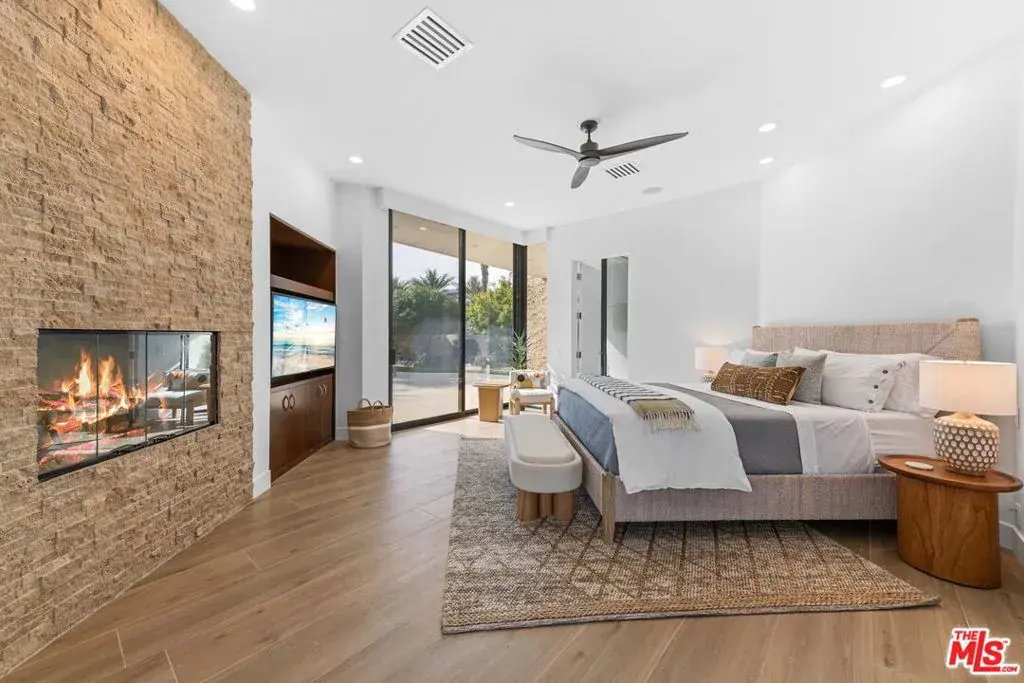 Welcome to paradise! Newly remodeled and just newly furnished custom 5 bed/5.5 bath Contemporary home located in the exclusive The Estancias gated community of only 49 custom properties in prime La Quinta location, close to Old Town, La Quinta Resort & some of the desert’s finest world-class golf courses. Situated on a large 28,000+sf lot with private gated driveway, this home exudes the resort lifestyle with incredible indoor/outdoor flow, stunning modern designer finishes throughout and entertainer’s backyard. Main home includes 3 bed/3.5 bath with detached 2 bed/2 bath casita (with fireplace, breakfast bar & fridge) located off of the home’s inviting center interior courtyard featuring a beautiful spa and tranquil waterfall. Formal entry with powder room opens to spacious living room with entertainers bar & dining table for 10. Large family room opens to breakfast room & open chef’s kitchen with quartz countertops, center island with waterfall edge & breakfast bar and walk-in pantry. Living room & family room all opening to relaxing beautifully landscaped backyard including covered patio with misting system, newer patio seating areas, fire pit, lounge chairs, built-in BBQ and Pizza oven and incredible over-sized sparking pool all overlooking beautiful mountain and sunset views. Primary suite has a separate wing off living room with fireplace, walk-in closet, gym that includes Peloton and spa-like primary bathroom with separate bath/shower. Additional features include porcelain wood-like tile throughout the home, 4-zoned ac/heat, newly installed 75″ & 85″ televisions and Sonos sound system throughout, ceiling fans in every room, all bedroom with ensuite bathroom and full-size laundry room with sink. Price may vary depending on month.