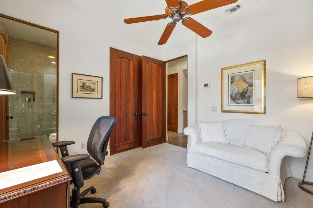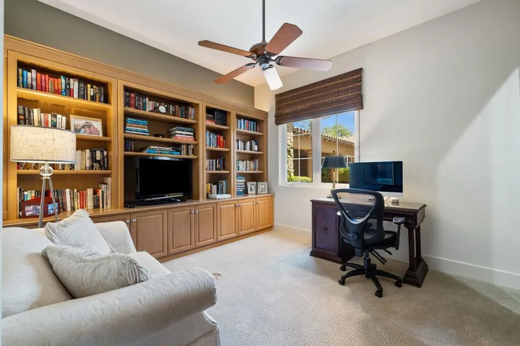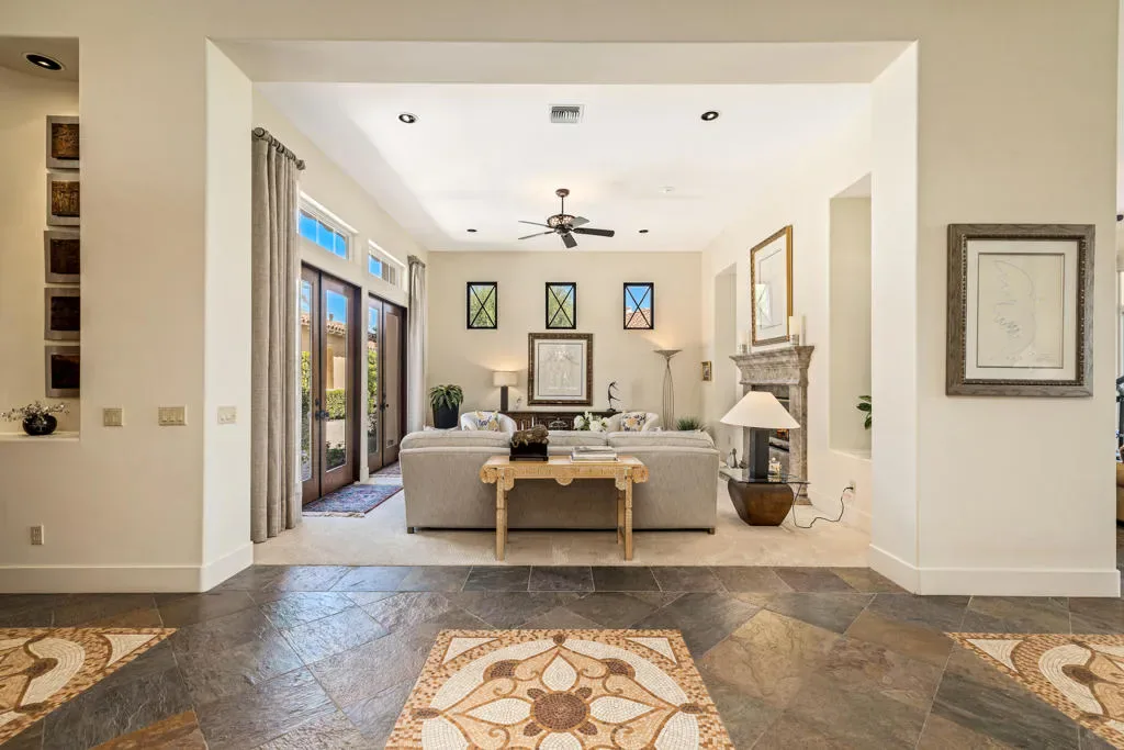 Set against the dramatic backdrop of the Santa Rosa Mountains, this elegant estate home in The Palms offers sweeping views & refined desert living on the Fred Couples/Brian Curley-designed private course. Situated on an approximately 16,100 sq ft homesite it allows for a spectacular outdoor living experience with a pool & spa, multiple seating & dining areas, BBQ, cozy fire pit, & breathtaking sunrises that paint the sky over the Santa Rosas. Entering through a gated courtyard, a beautifully appointed 2-room detached casita complete with a spacious living room, separate bedroom, kitchenette, large bathroom with spa tub, shower, private patio, with direct access to the pool–ideal for guests’ privacy & comfort. Inside the main residence, timeless design details include floor to ceiling glass windows, soaring ceilings, and a dual-sided fireplace separating the Great Room & Living Room. The formal Dining Room is perfect for hosting, while the Wet Bar with wine refrigerator adds an inviting & functional space to entertain. The gourmet Kitchen is equipped with Viking appliances, new quartz countertops & a large island with seating. The primary suite is spacious & serene, with an adjoining spa-style bath. Two additional ensuite bedrooms complete the main house; one is currently set up as a home office. The exterior was recently painted, and there is an oversized 3-car garage with AC. The Palms is La Quinta’s hidden gem, with 101 homes encircling the course, providing a serene & private atmosphere rarely found in golf communities. The Palms offers lower HOA fees & provides 24-hour manned security & a dog park. The Palms Golf Club recently underwent a clubhouse renovation, offers a very attractive golf membership with no Tee times–joining is optional. This is more than just a home–it’s an elevated lifestyle in one of La Quinta’s most sought-after golf communities.