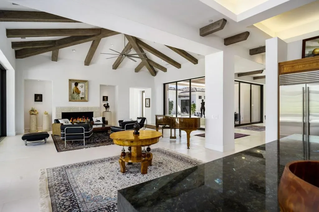 Situated on a sweeping wide lot perched above the 8th hole of Tradition Golf Club, this exceptional residence captures panoramic mountain and lake views from nearly every angle. Designed to impress, the home offers 4 bedrooms plus bonus / theatre room, with expansive indoor-outdoor living spaces ideal for both relaxation and entertaining. A private courtyard welcomes you with tranquil fountains, sculptural elements, and beautifully curated Zen rock and succulent gardens. Enter through a dramatic pivot door and immediately experience the breathtaking rear vistas framed by walls of glass. The great room showcases wood-beamed ceilings, a striking stone fireplace, and pocketing sliding doors that seamlessly open to both the front courtyard and rear patio, creating a true indoor-outdoor lifestyle. The chef’s kitchen is thoughtfully designed with a large island, light wood cabinetry, stainless steel appliances, a butler’s pantry, walk-in pantry, and a charming breakfast room. An expansive Game Room / Library features custom built-ins, a wet bar with wine refrigeration, and a comfortable sitting area–perfect for gathering with family and friends. The luxurious primary suite is a private retreat, complete with a floor-to-ceiling stone fireplace, dual walk-in closets, spa-inspired bath with soaking tub, gigantic two-person walk-in shower, dual vanities, dual water closets, and an outdoor shower. A spacious art studio with en-suite bath offers flexibility and can easily be converted into two additional bedrooms. Guests will appreciate the detached two-bedroom casita with its own living room, providing comfort and privacy. Additional features include a 4 car garage, and solar panels for energy efficiency. Offered partially furnished per inventory.