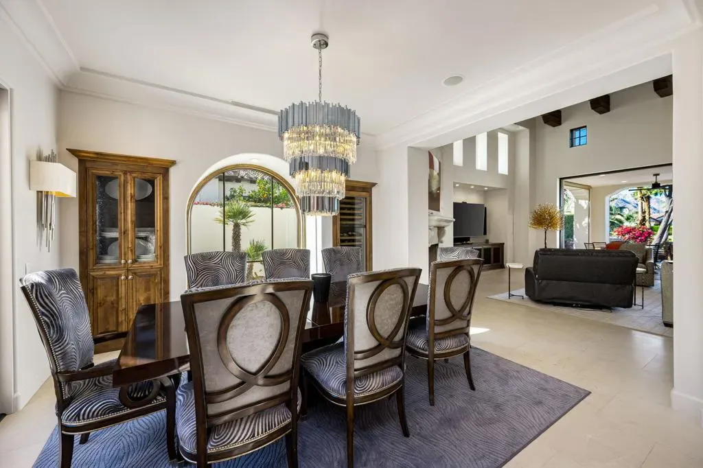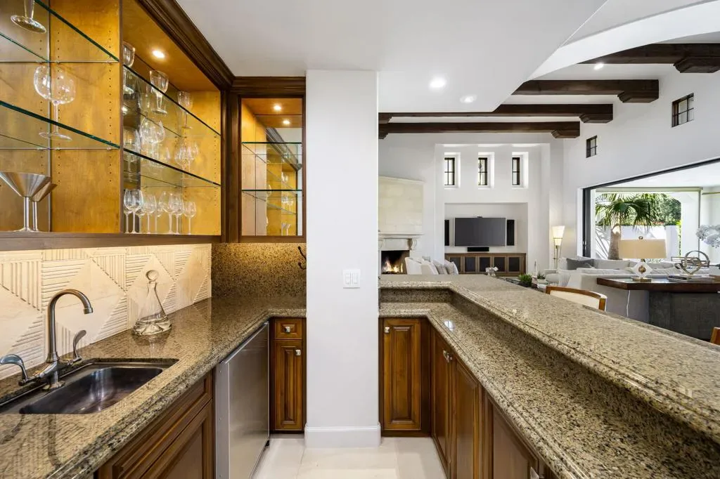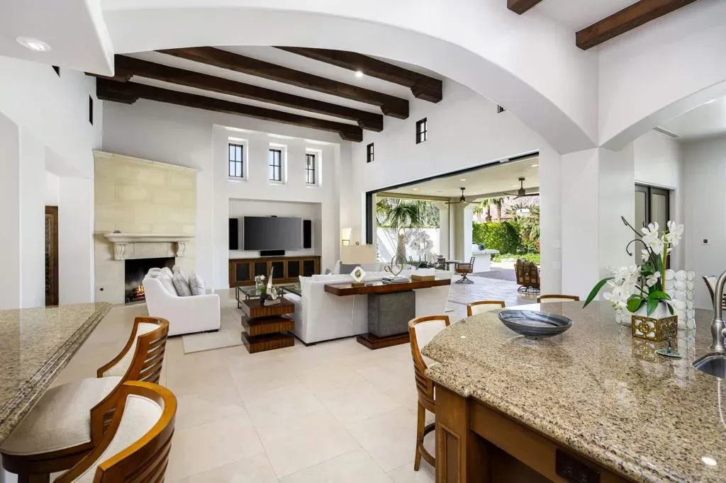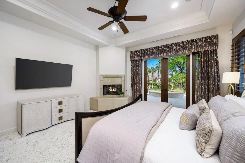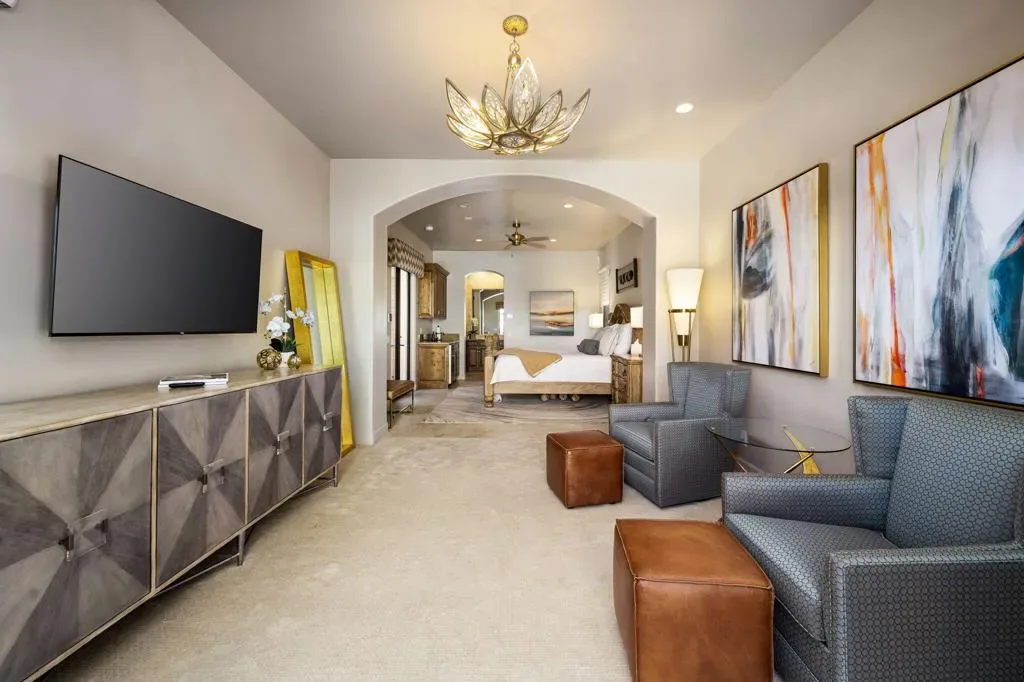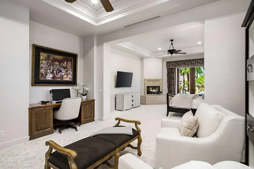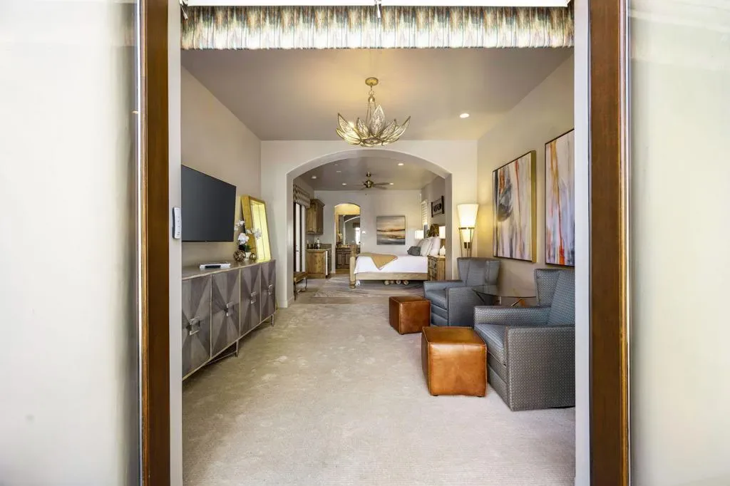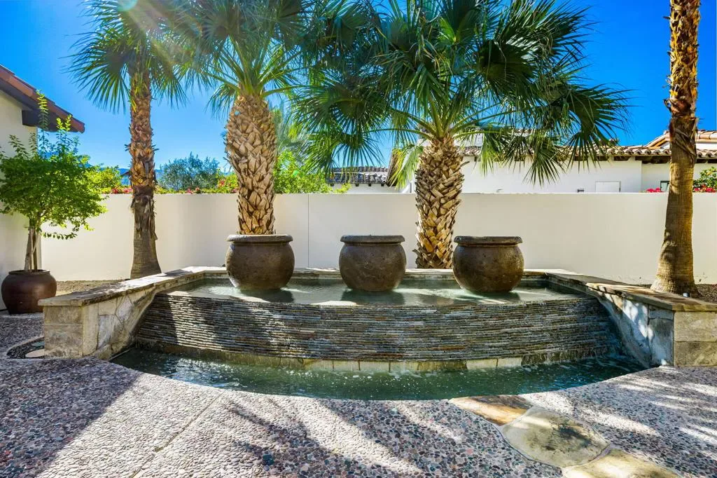 Ideally located in the heart of Tradition Golf Club, this exceptional home captures serene down-valley lake views while offering privacy and easy access to the Coyote Cafe. A private courtyard entry welcomes you with a stately fountain and inviting outdoor living area with fireplace, setting a warm and elegant tone from the moment you arrive. Inside, the Great Room features soaring ceilings accented by rugged wood beams and refreshed interior design, with pocketing doors that seamlessly open to expansive indoor-outdoor living and breathtaking views. The gourmet kitchen is thoughtfully designed with a cozy bar and breakfast nook, both perfectly positioned to enjoy the lake scenery. The spacious primary suite is a true retreat, complete with a sitting area, fireplace, luxurious bath with soaking tub, dual vanities, and a large walk-in closet. Two guest bedrooms with ensuite baths are in the main home, while a private casita offers a sitting area and kitchenette–ideal for guests or extended stays. A formal dining room overlooks the tranquil courtyard fountain, creating an ideal setting for entertaining. The outdoor living area is designed for year-round enjoyment, featuring a fireplace, built-in BBQ, and TV, all overlooking the pool and spa with beautiful lake views. This home combines timeless elegance, thoughtful design, and an unmatched setting within one of Tradition’s most coveted locations.