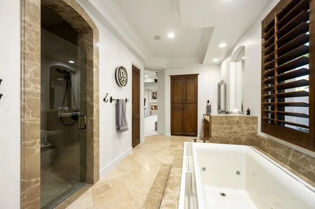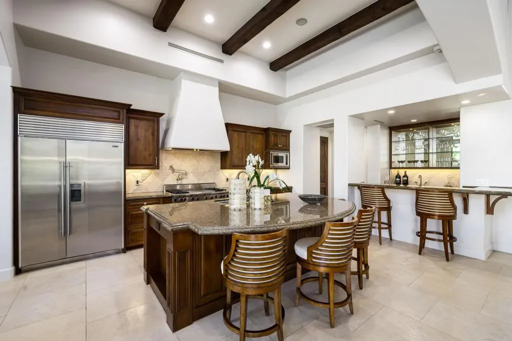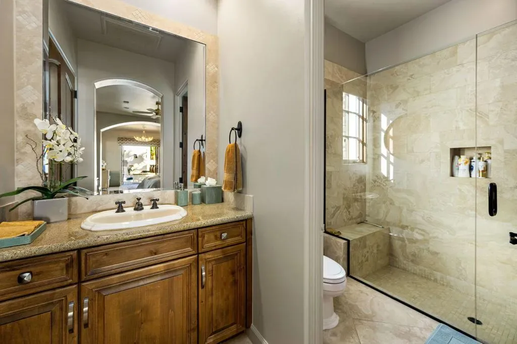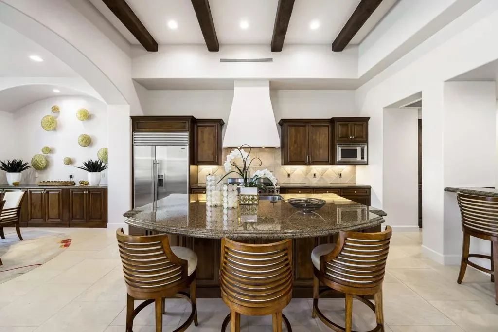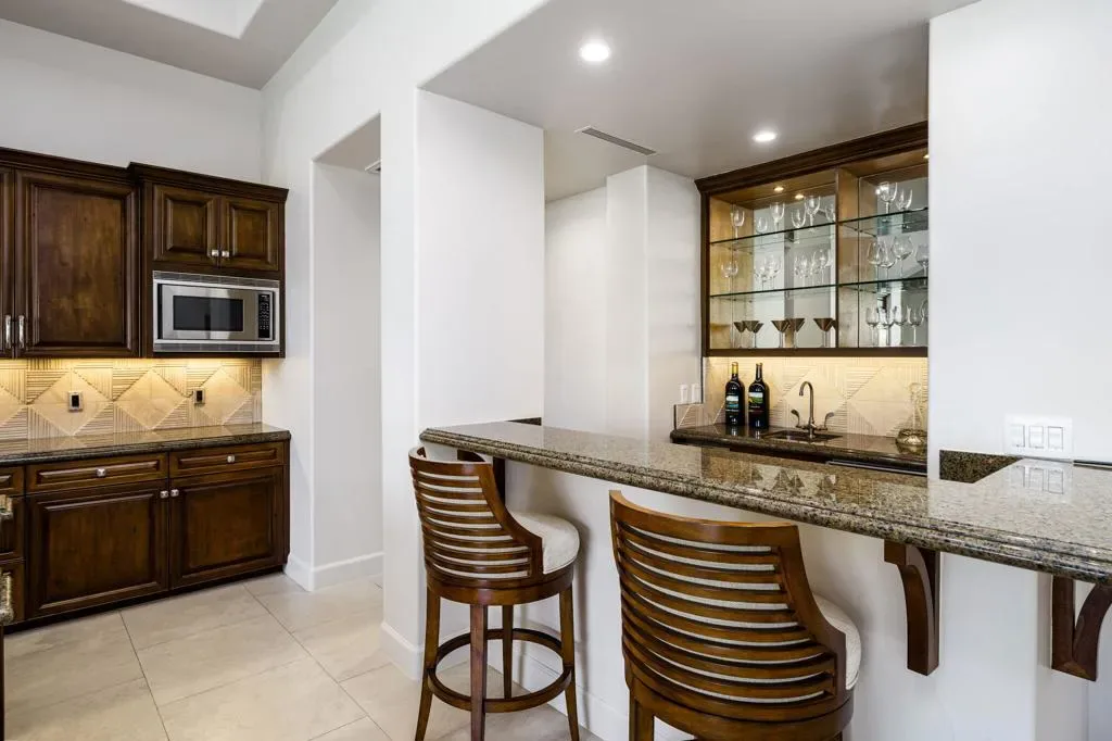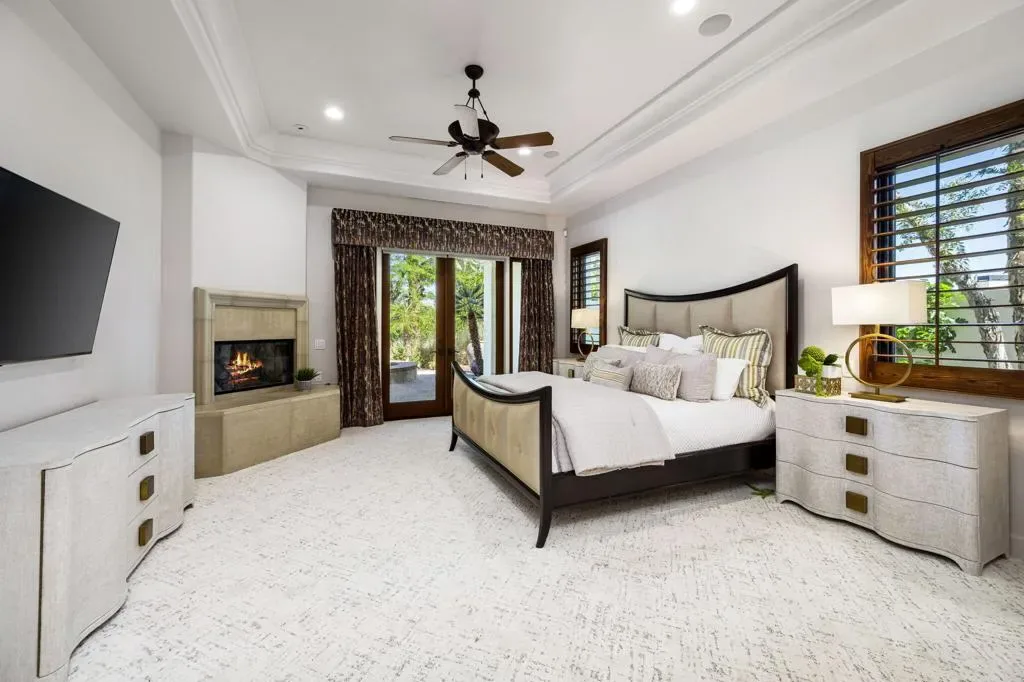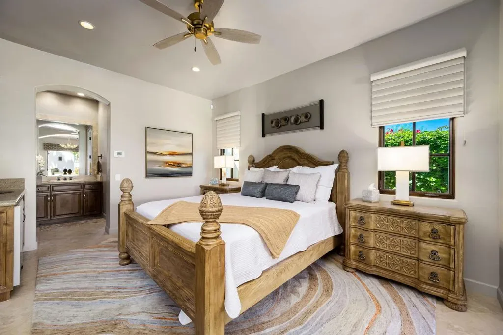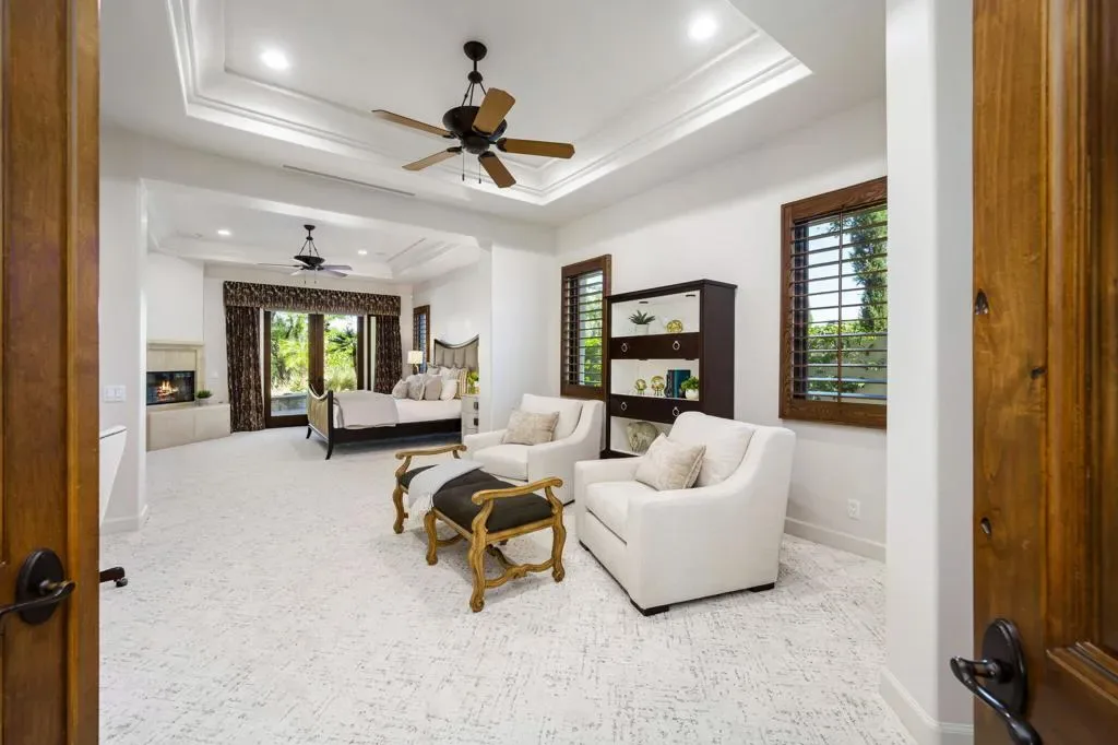 Ideally located in the heart of Tradition Golf Club, this exceptional home captures serene down-valley lake views while offering privacy and easy access to the Coyote Cafe. A private courtyard entry welcomes you with a stately fountain and inviting outdoor living area with fireplace, setting a warm and elegant tone from the moment you arrive. Inside, the Great Room features soaring ceilings accented by rugged wood beams and refreshed interior design, with pocketing doors that seamlessly open to expansive indoor-outdoor living and breathtaking views. The gourmet kitchen is thoughtfully designed with a cozy bar and breakfast nook, both perfectly positioned to enjoy the lake scenery. The spacious primary suite is a true retreat, complete with a sitting area, fireplace, luxurious bath with soaking tub, dual vanities, and a large walk-in closet. Two guest bedrooms with ensuite baths are in the main home, while a private casita offers a sitting area and kitchenette–ideal for guests or extended stays. A formal dining room overlooks the tranquil courtyard fountain, creating an ideal setting for entertaining. The outdoor living area is designed for year-round enjoyment, featuring a fireplace, built-in BBQ, and TV, all overlooking the pool and spa with beautiful lake views. This home combines timeless elegance, thoughtful design, and an unmatched setting within one of Tradition’s most coveted locations.