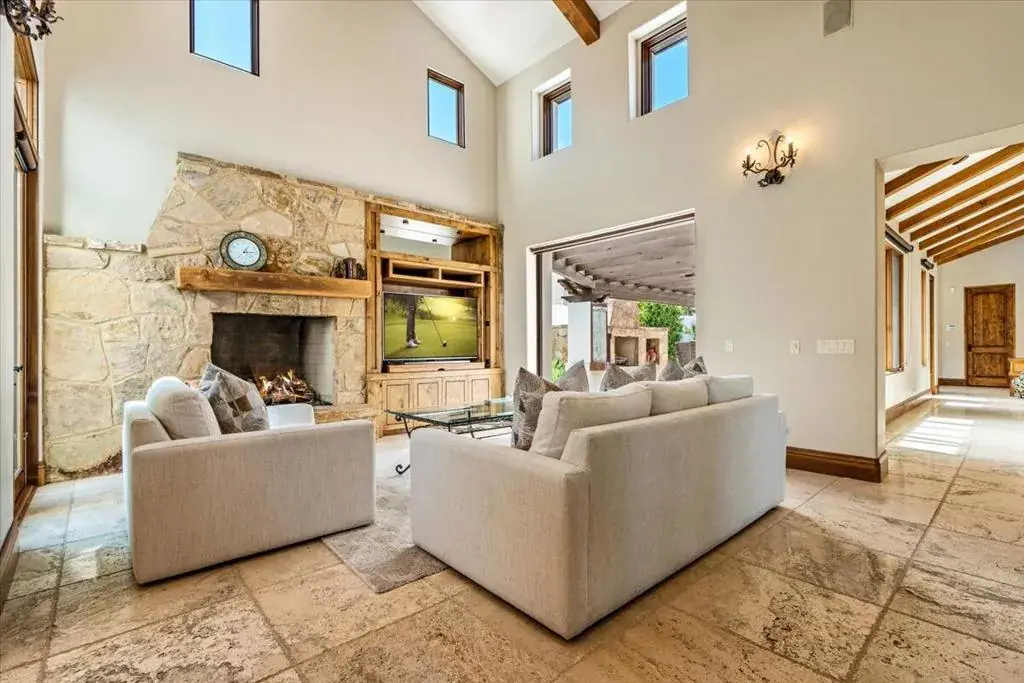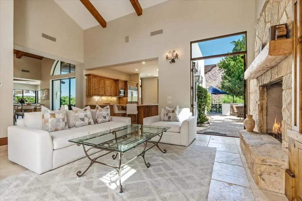 Sweeping views of the mountains and 12th fairway at the top of Tradition Golf Club. Charming Spanish Hacienda with putting green, pocketing doors and bar windows allowing fabulous great room indoor/outdoor entertaining. You’ll be taken by the views, fountains and 4 stone fireplaces giving warmth and ambiance. Gourmet kitchen with oversized granite island, stainless appliances and custom cabinets with conditioned wine room just steps away. Cozy family room with fireplace opens up to a side courtyard with large outdoor fireplace. Oversized pool and spa with rock boulder waterfall enhance the outdoor patio and BBQ experience. Two master suites with dual closets and dual vanities. Spacious office with courtyard views and extra bonus room that would make a great gym or bunkroom for grandkids. Grand casita with fireplace and en-suite bath. Updated and Furnished per inventory. Available S November 2025, January, April and May 2026