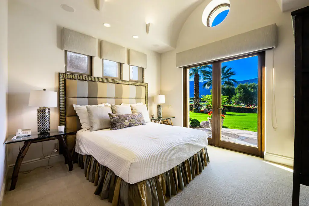 Spectacular custom estate at the exclusive Tradition Golf Club in La Quinta. Situated on a prime, nearly one acre lot at the end of a cul-de-sac, with panoramic golf course, mountain and lake views, on the 1st fairway of the renowned Arnold Palmer course! The open floorplan features four bedrooms, four baths + powder room, with a bonus game room (that could be a 5th bedroom) plus an office, in a spacious 6,439 SF. This thoughtfully appointed home was meticulously designed by Gordon Stein, showcasing our enviable indoor-outdoor desert lifestyle! Interiors by Fedderly and Associates feature a great room which boasts pocket doors, travertine flooring and soaring wood ceilings. The generous chef’s kitchen opens to all living areas, is appointed with top-of-the-line appliances and finishes. The elegant primary suite has a fireplace, oversized spa-like bath, and a gym (that can be converted to another closet). As you proceed outside, there is an outdoor living room with fireplace and TV, a custom grilling station plus a custom designed pool and spa with waterfalls, beautiful landscaping and jaw dropping views! Completing this exceptional property is a three car + two golf cart garage. Offered furnished. This is a must-see offering that artfully combines luxury and total privacy!