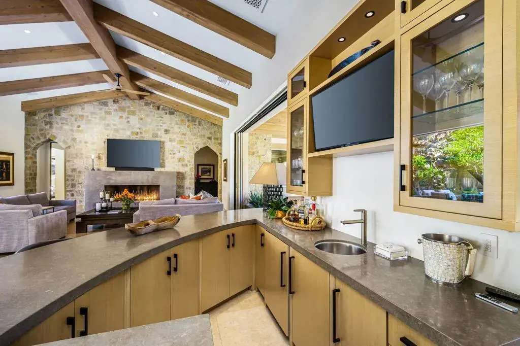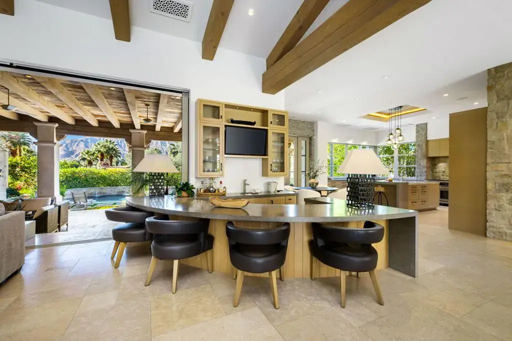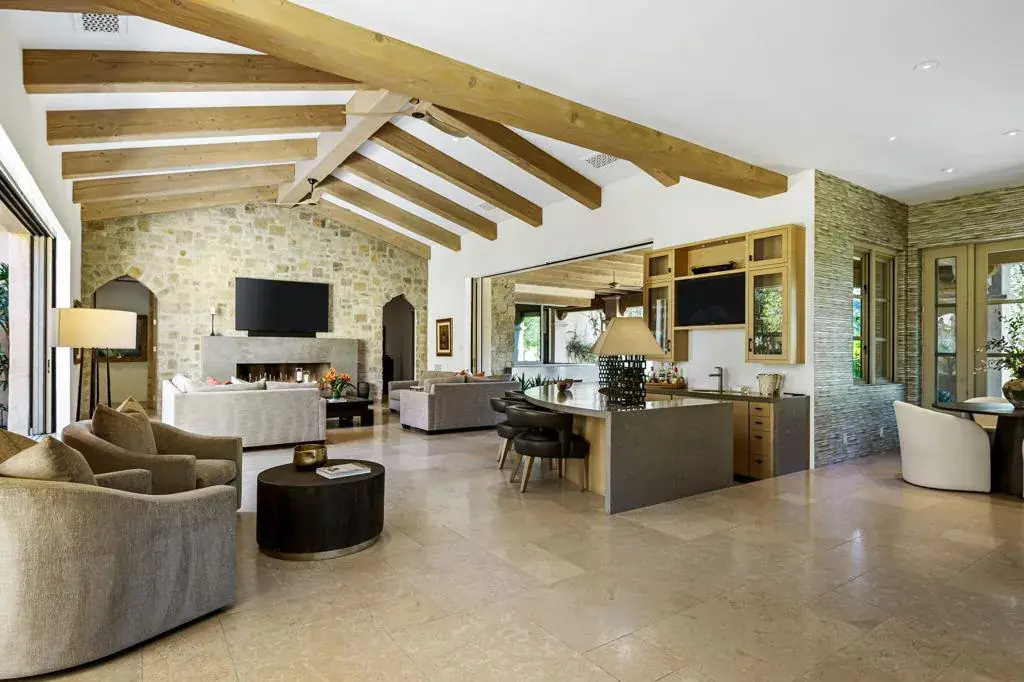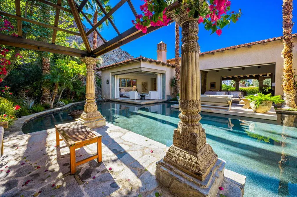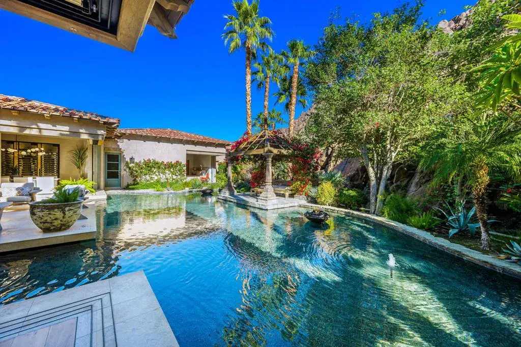 Stunning Mountainside Masterpiece with Euro Fusion Design! The ultimate vacation getaway, as endless pocket doors let living areas and bedrooms float on a tropical lagoon. Dramatic Great Room has soaring beam ceilings, and opens on two sides for seamless outdoor living. A massive covered Loggia with dramatic fireplace overlooks sunken patio with cliff-side zero edge pool and infinity spa. With 4 Bedrooms including 2 Casitas, bright Office, and Master Bedroom with Gym, this house has all the amenities. With gourmet Kitchen & Butler’s Pantry, outdoor BBQ, multiple fire features, waterfall, wrap around pond and patios, one touch lighting, this home offers the best in casual living or grand entertaining. This renowned Gordon Stein design is a fusion of old world detail and open contemporary living – all the light and bright comfortable finishes that today’s buyers are looking for, combined with the ultimate in relaxed textures and quality craftsmanship. Furnished per inventory.
