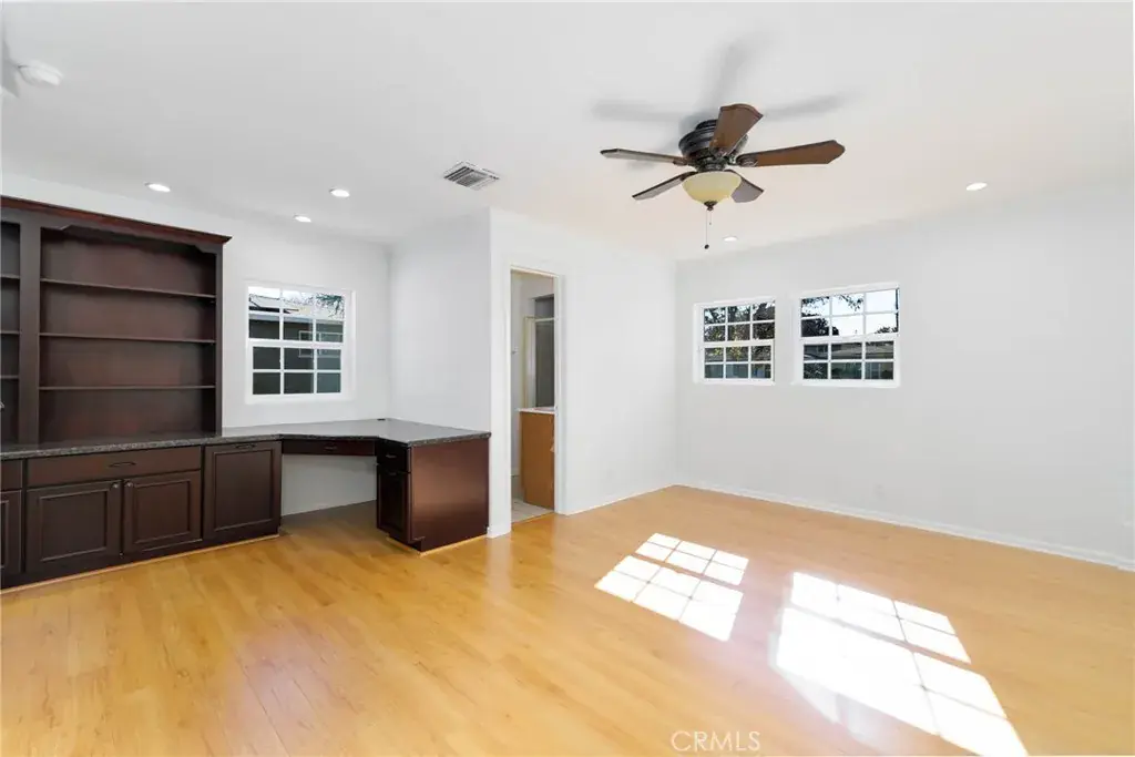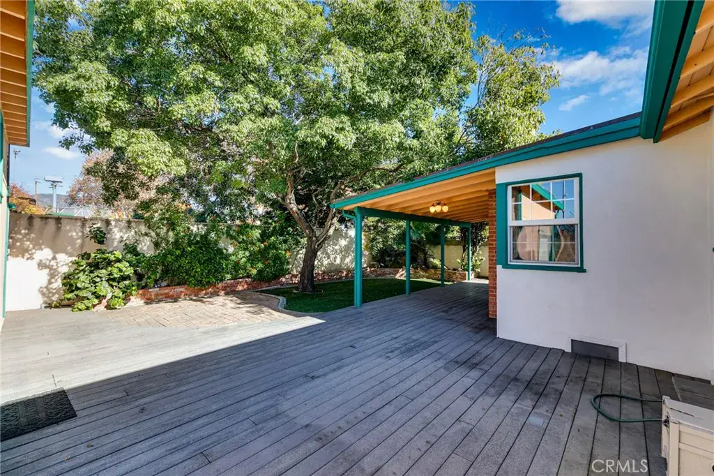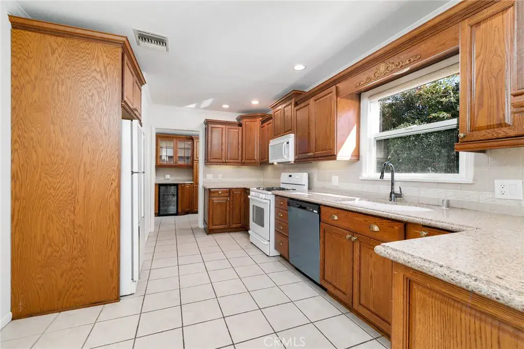 Welcome home to this charming single-story gem nestled on a corner lot in a quiet cul-de-sac, just walking distance to the elementary school. Freshly painted inside and out, this home is full of curb appeal and character. Inside, enjoy hardwood floors throughout with brand-new laminate flooring in the primary bedroom, dual-pane windows, crown molding, and LED recessed lighting that create a bright, welcoming feel. The living room features a large picture window and flows into the dining area with a built-in oak hutch. The kitchen offers granite countertops, oak cabinetry, a farmhouse sink, a brand-new dishwasher, and a built-in microwave. Gather in the family room with a classic brick fireplace and direct backyard access. The spacious primary bedroom features a built-in desk, along with two additional bedrooms, a full hall bath, and a separate laundry room with built-in cabinetry and a wine refrigerator. Enjoy the backyard with a covered Trex patio, ideal for relaxing or hosting guests. 1-car attached garage with pull-through access to an oversized detached 1-car garage with great ADU potential. Move-in ready and easy to fall in love with!