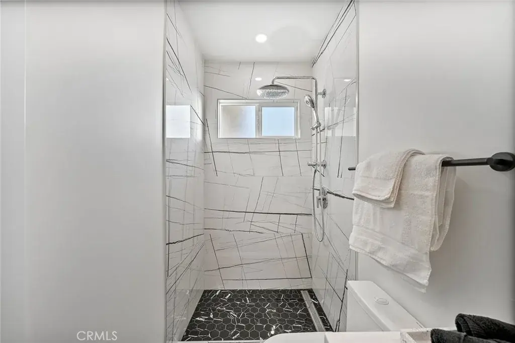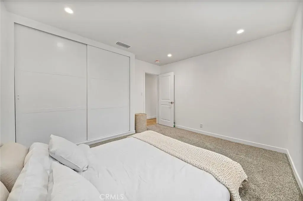 The home features a beautifully updated kitchen with new cabinetry and quartz countertops, newly remodeled bathrooms, wood flooring throughout the living areas, and recessed lighting across the entire home.
