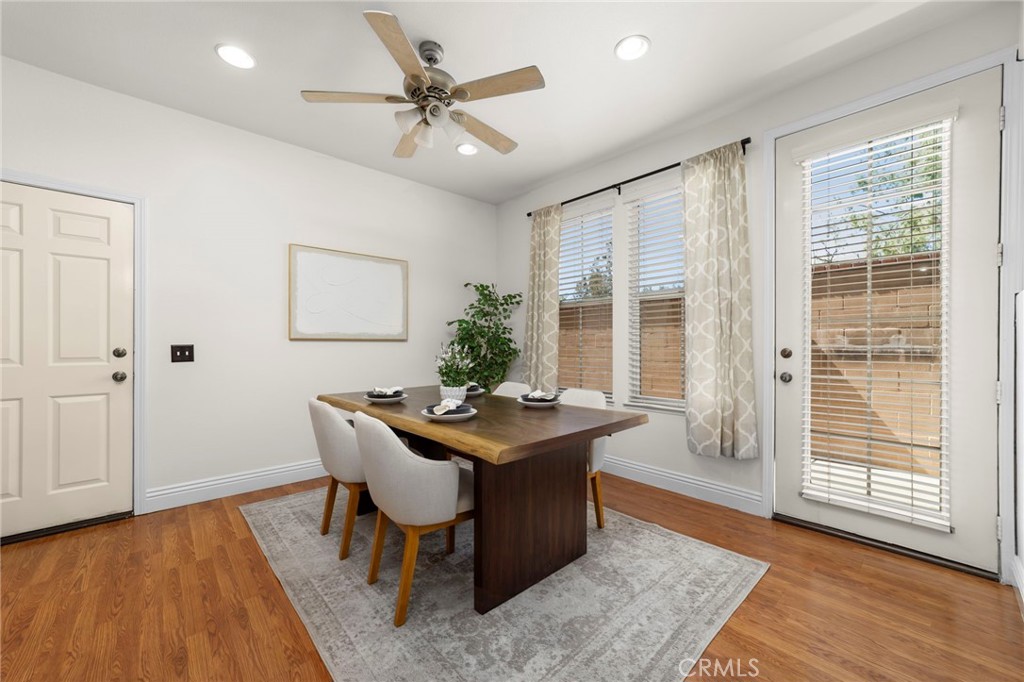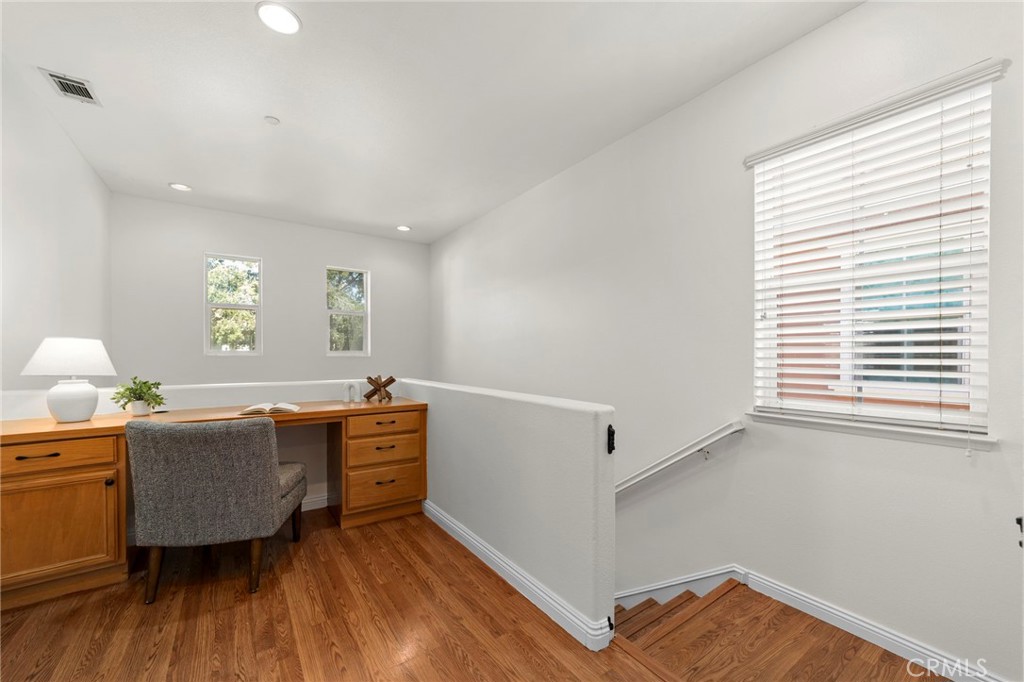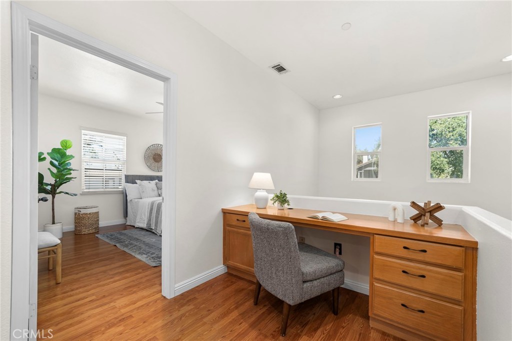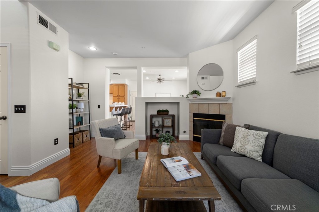 NEW PRICE AND NEW LOOK for this charming craftsman-inspired home featuring inviting curb appeal and a thoughtfully designed layout located in the award winning Bonita Unified School District. Nestled behind lush landscaping and a welcoming front porch, this home blends comfort, functionality, and timeless style. Step inside to warm wood flooring and an open living space that flows seamlessly into the kitchen and dining area. The living room has built-in features, a cozy fireplace, and high ceilings. The kitchen offers generous cabinetry, ample counter space, and a convenient breakfast bar — perfect for casual meals or entertaining. The dining area provides access to the attached two car garage (with EV hook-ups) and also the side patio. There is a half bathroom located off the living room with a large closet space perfect for extra storage. Recessed lighting and natural light throughout create a bright and airy feel. Upstairs has a built-in large desk ready for a work from home situation or the perfect work space for homework. Additionally, there are three spacious bedrooms, two bathrooms, and a laundry room conveniently located near the bedrooms. The expansive primary bedroom has double doors leading to a charming balcony overlooking the quiet community greenbelt. The primary bathroom features dual vanities, a walk-in closet with built in storage solutions, and a shower/tub combination designed for everyday comfort. The other two bedrooms also have sizable walk-in closets with built-in shelving and ample space. With its attractive exterior architecture, practical layout, and inviting interior finishes, this home offers both comfort and convenience in a beautifully maintained setting. And, with restaurants and shops like the famous Shogun, In n Out, Vons, Chili’s and the movie theater being a half mile away, this location cannot be beat.