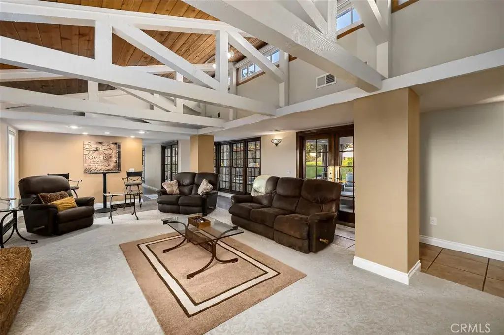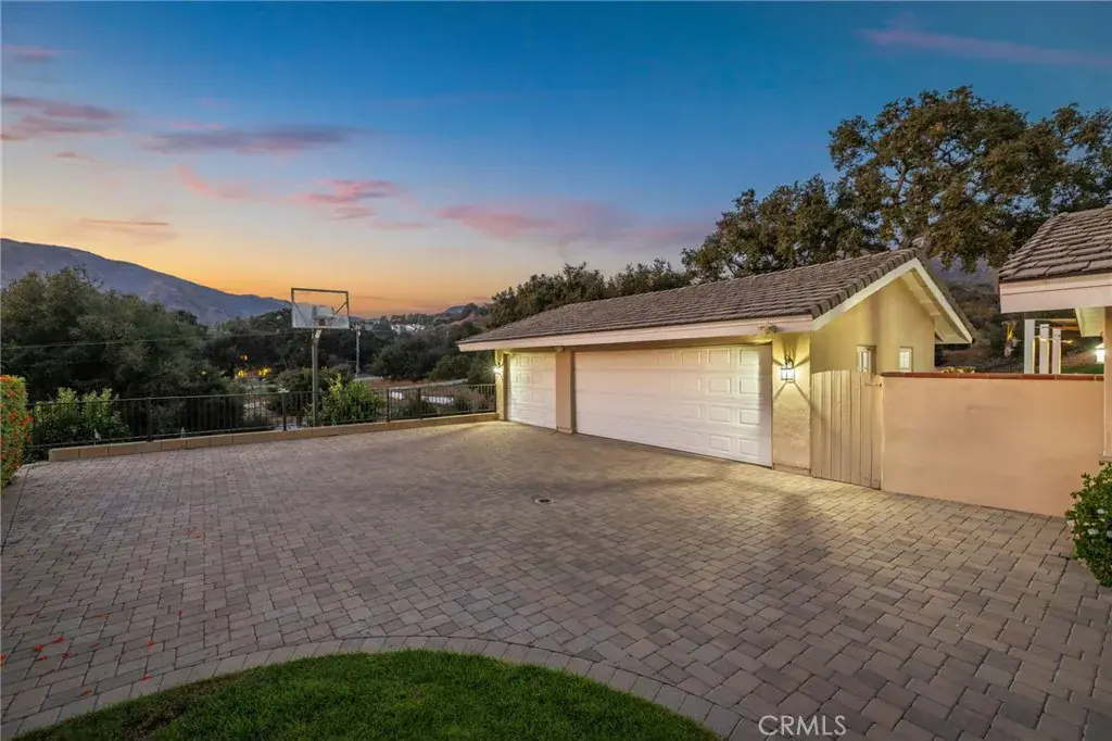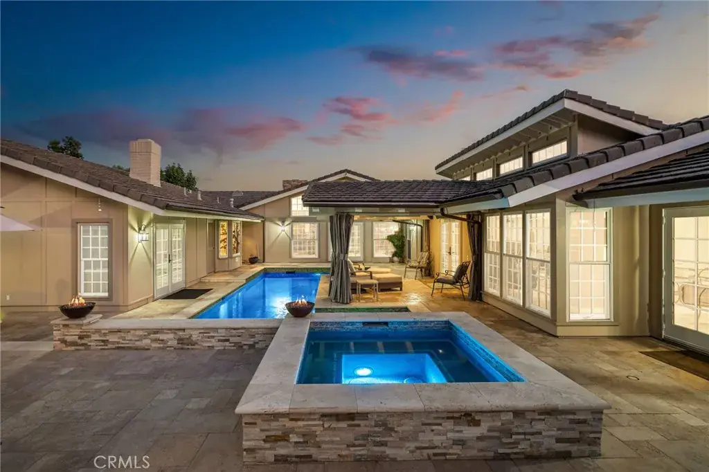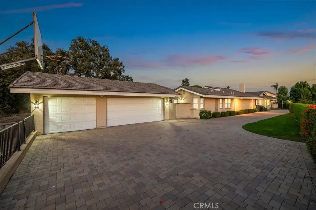 Custom California Ranch-Style Estate featuring a symmetrical façade, circular paver driveway, stacked-stone accents, and meticulous landscaping. Double iron-and-glass entry doors opens to a light-filled interior framed by floor-to-ceiling windows and wood-trimmed architectural columns, leading seamlessly into the formal living and dining rooms. The living room offers a tray ceiling with crown molding, a fireplace, and windows overlooking the front yard. The dining room offers a mirrored coffered ceiling and French doors that open to a front sitting area. The kitchen features custom wood cabinetry, granite countertops, stainless steel appliances, bar-top seating, and a breakfast nook with a built-in desk area. The adjacent family room offers a dramatic fireplace framed in granite, exposed white trusses, and wood-plank ceiling that blends architectural character. French doors and wood-framed, grid-style casement windows provide views and a seamless transition to the backyard. This wing also includes a bathroom with shower, a laundry room, and access to the three-car garage. On the opposite wing, an executive-style office showcases millwork, coffered ceilings, floor-to-ceiling built-ins, and richly stained cabinetry. The luxurious primary suite is a sanctuary–oversized and appointed with tray ceilings, dual sets of French doors, tall windows, and dual walk-in closets. The spa-inspired en suite bath features a jetted tub set beneath stained-glass windows, a walk-in shower, dual vanities with granite counters, and a double-sided fireplace shared with the bedroom. Additional bedrooms include one with an angled tongue-and-groove plank ceiling, and another with a tray ceiling. The hall bathroom features granite countertops, a frameless walk-in shower, and a jetted tub. The private, resort-style backyard is designed for elevated living–an expansive outdoor retreat ideal for entertaining or everyday luxury. A sleek PebbleTec pool is the centerpiece, paired with a stacked-stone spa, dramatic fire bowls, and cascading water features. A covered cabana lounge with vaulted wood ceiling, recessed lighting, heaters, and drapery offers a year-round outdoor living experience. A built-in BBQ island with stainless appliances, a fire table, sail shades, and paver decking sits beneath a majestic oak tree with views of hillside vistas. The detached three-car garage sits beyond a private gated driveway, where a putting green adds the final touch to this extraordinary estate.