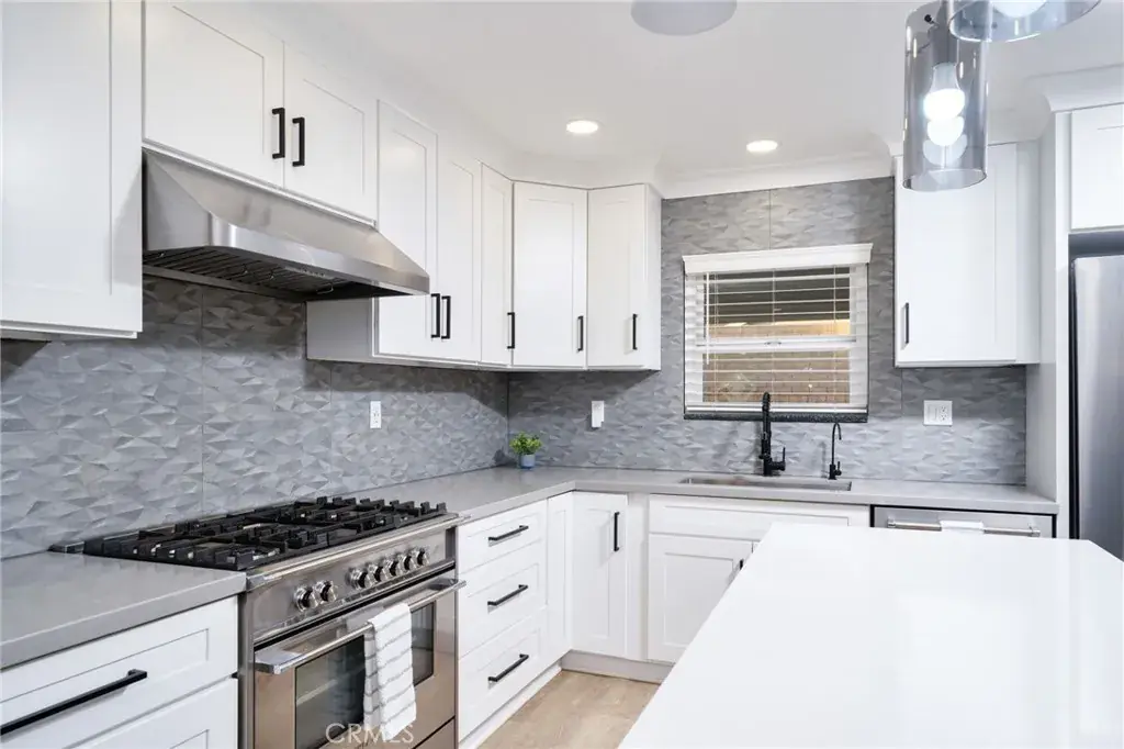 Welcome to 803 Carlet Street, a beautifully remodeled single-story home located on a quiet cul-de-sac in the heart of La Verne. This 3-bedroom, 2-bathroom residence offers 1,420 square feet of living space on a generous 7,320 square foot corner lot, just minutes from schools, parks, and charming downtown La Verne Village with its restaurants and shops. The picturesque brick-front home features a welcoming front walkway and covered porch leading into an open, light-filled floor plan. The spacious living room showcases a stacked-stone fireplace with a stylish mantle and flows seamlessly into the remodeled kitchen, complete with a center island, white cabinetry, quartz countertops, and stainless-steel appliances including a Fisher & Paykel gas range and hood, Bosch microwave, and KitchenAid dishwasher. The kitchen opens to a large family room with a second stacked-stone fireplace, sliding door to the covered patio, and direct access to the garage. The primary suite offers generous closet space and a remodeled en-suite bathroom featuring a barn door, large walk-in shower, and newer vanity. Two additional bedrooms and a beautifully remodeled full hallway bathroom with tub/shower and updated vanity complete the interior. Additional highlights include a two-car garage with epoxy flooring, washer and dryer hookups, and direct interior access. Recent upgrades include a composition roof, tankless water heater, newer HVAC, copper/Pex plumbing, dual-pane windows and slider, plantation shutters, vinyl flooring, crown molding, newer baseboards, ceiling fans, and interior panel doors. Enjoy the private backyard with an aluminum patio cover with lighting, spacious lawn, block wall fencing, storage shed, and gated RV parking. Located within the highly regarded Bonita Unified School District, serving Allen Avenue Elementary, Ramona Middle School, and Bonita High School.