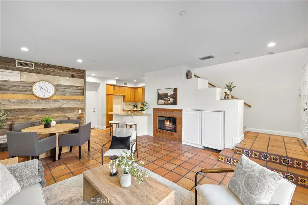 The kitchen features recently installed, yet to be used stainless steel appliances and classic Spanish Saltillo tile flooring throughout the main living areas. The living room is warm and inviting, highlighted by a cozy fireplace ideal for everyday living.