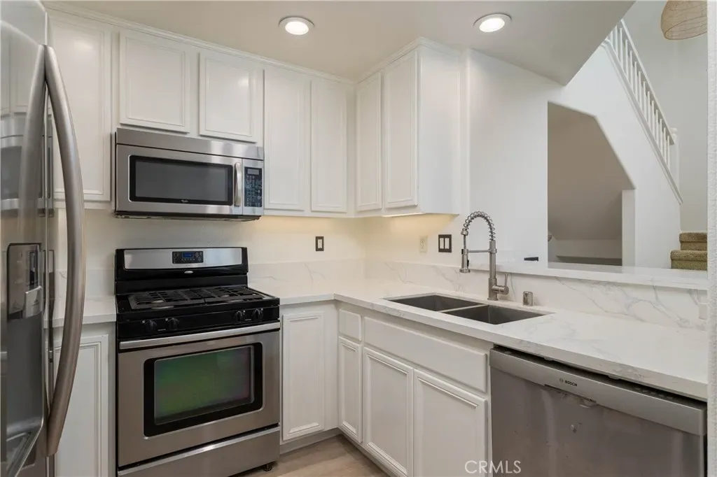 Tucked within the Chambray community of Ladera Ranch, this end-unit home stands out for its natural light, open floor plan, and thoughtful updates throughout. Soaring ceilings and expansive windows bring in light from multiple directions, giving the main living space an airy, elevated feel. The layout offers two bedrooms, two full bathrooms, and a spacious loft with a built-in custom closet – ideal for a home office, secondary living space, or easily converted into a third bedroom. The living and dining areas connect seamlessly to the kitchen, creating a layout that feels both open and comfortable for everyday living. In the kitchen, freshly painted cabinetry, new countertops, and an updated sink give the space a clean, refreshed look, while a breakfast bar offers a casual place to gather. New SPC vinyl flooring runs throughout the entry, stairway, and main living areas, complemented by fresh interior paint that carries a cohesive finish throughout the home. The primary suite is set apart as a more private retreat, featuring a walk-in closet and a remodeled en-suite bathroom with a walk-in shower, updated countertops, modern mirrors, and upgraded fixtures. The secondary bedroom is well-sized for guests or everyday use, while the loft adds an additional layer of flexibility depending on your needs. Additional features include LED lighting throughout, a direct-access one-car garage, and an assigned parking space located just steps from the home. Living in Ladera Ranch offers a lifestyle that extends well beyond the home itself, with access to pools, splash pads, parks, tennis and pickleball courts, a skate park, hiking trails, clubhouses, and more – along with nearby shopping, dining, and highly regarded schools. Don’t miss out on this darling home!
