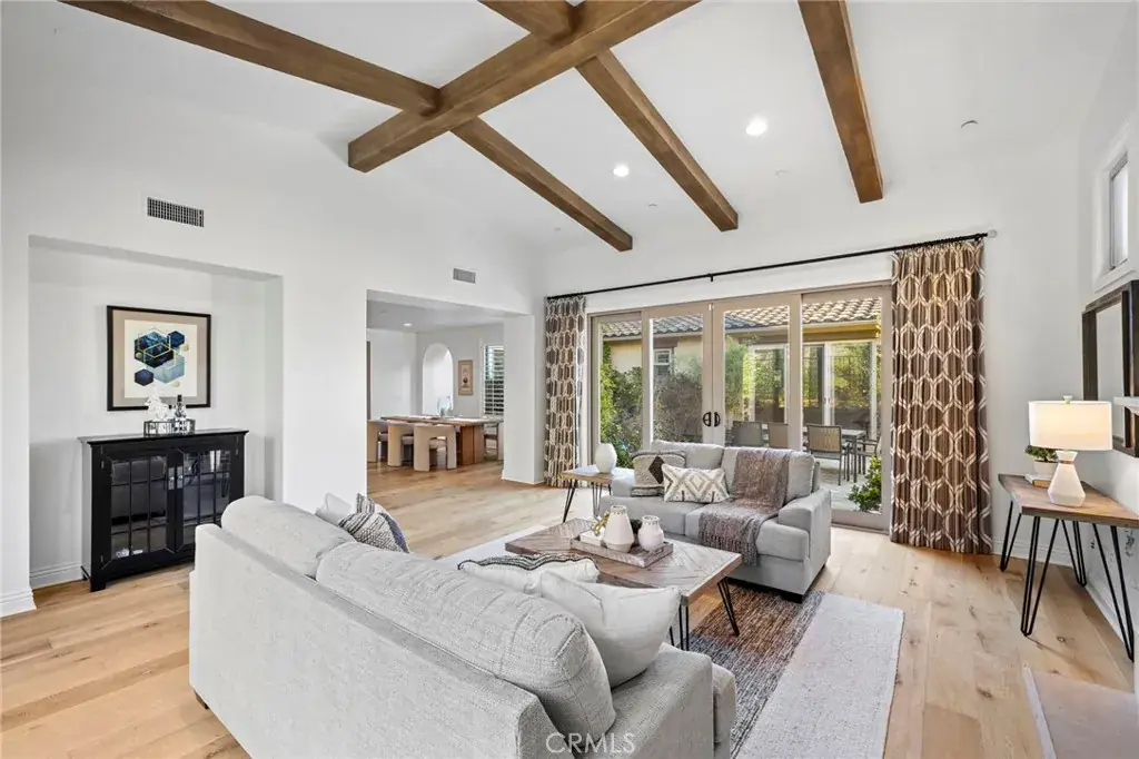 the light and open family room showcases a vaulted ceiling with open beams, an elegant fireplace and plenty of room for large gatherings. In the kitchen, top-of-