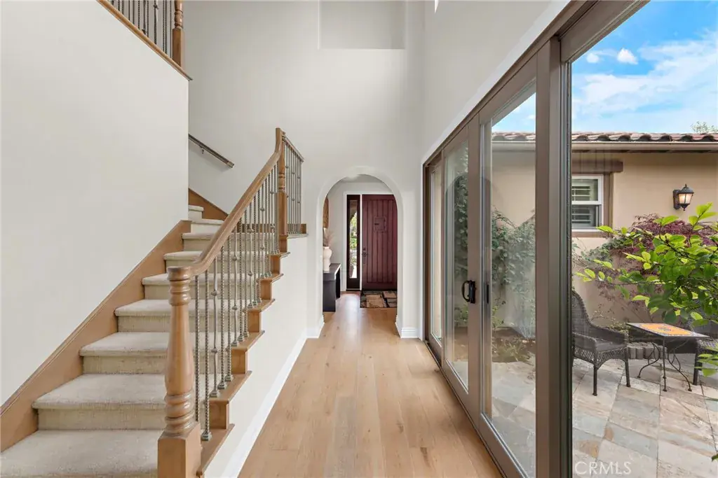 with dramatic staircase and glass doors leading to the courtyard, and a dining room for picture-perfect entertaining. Opening to the courtyard and the backyard,